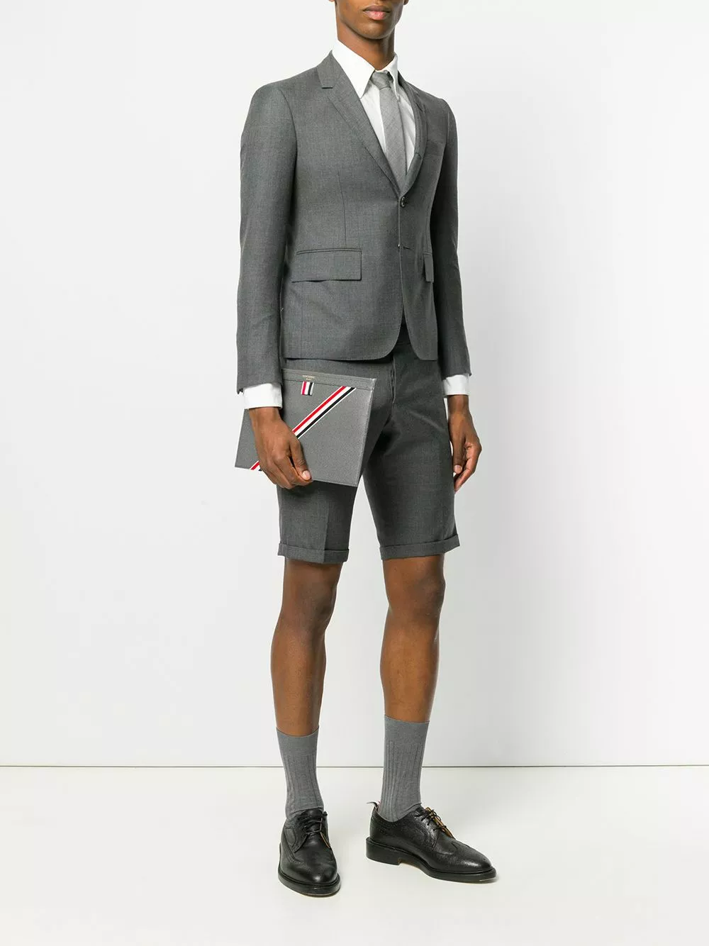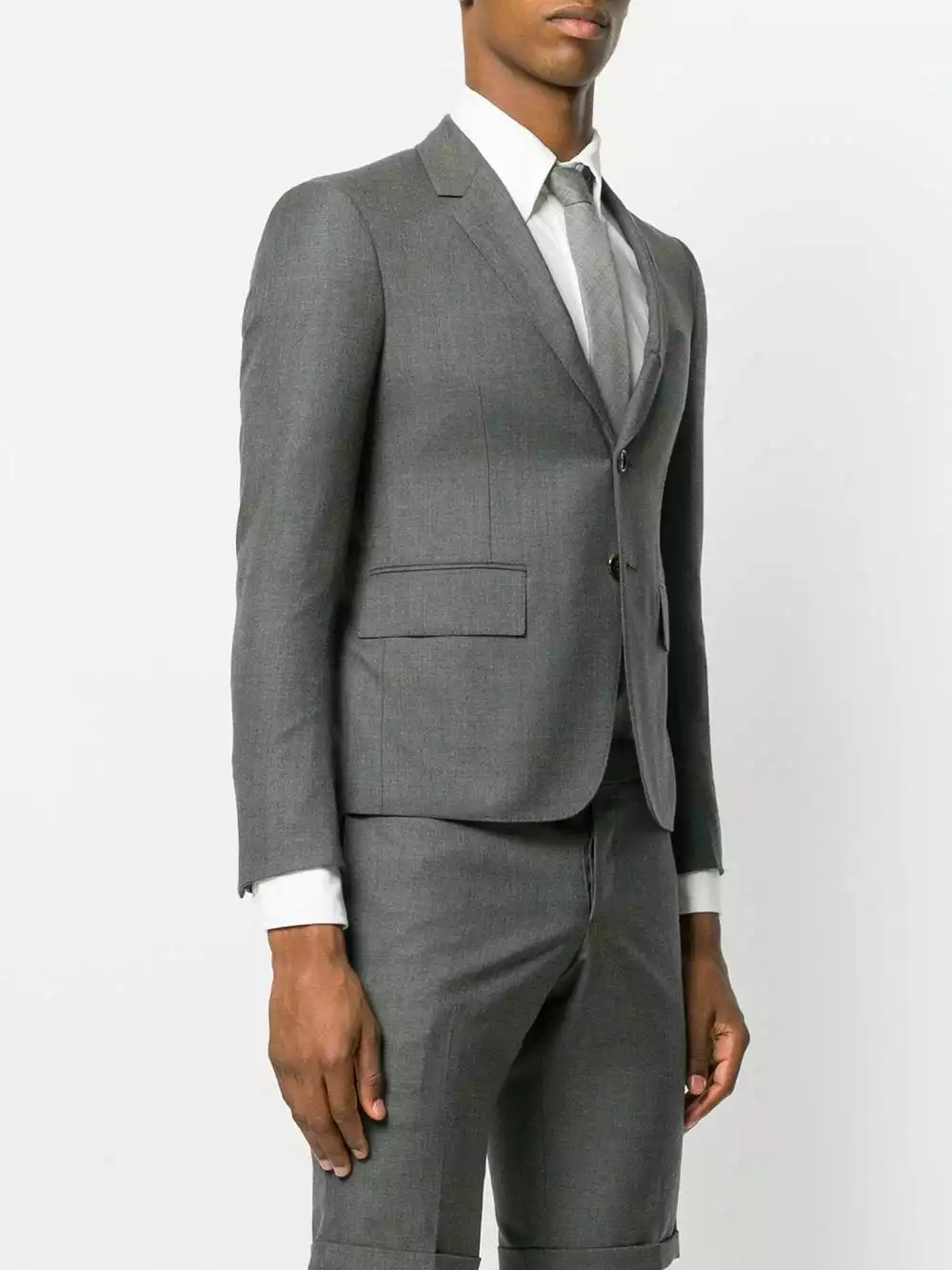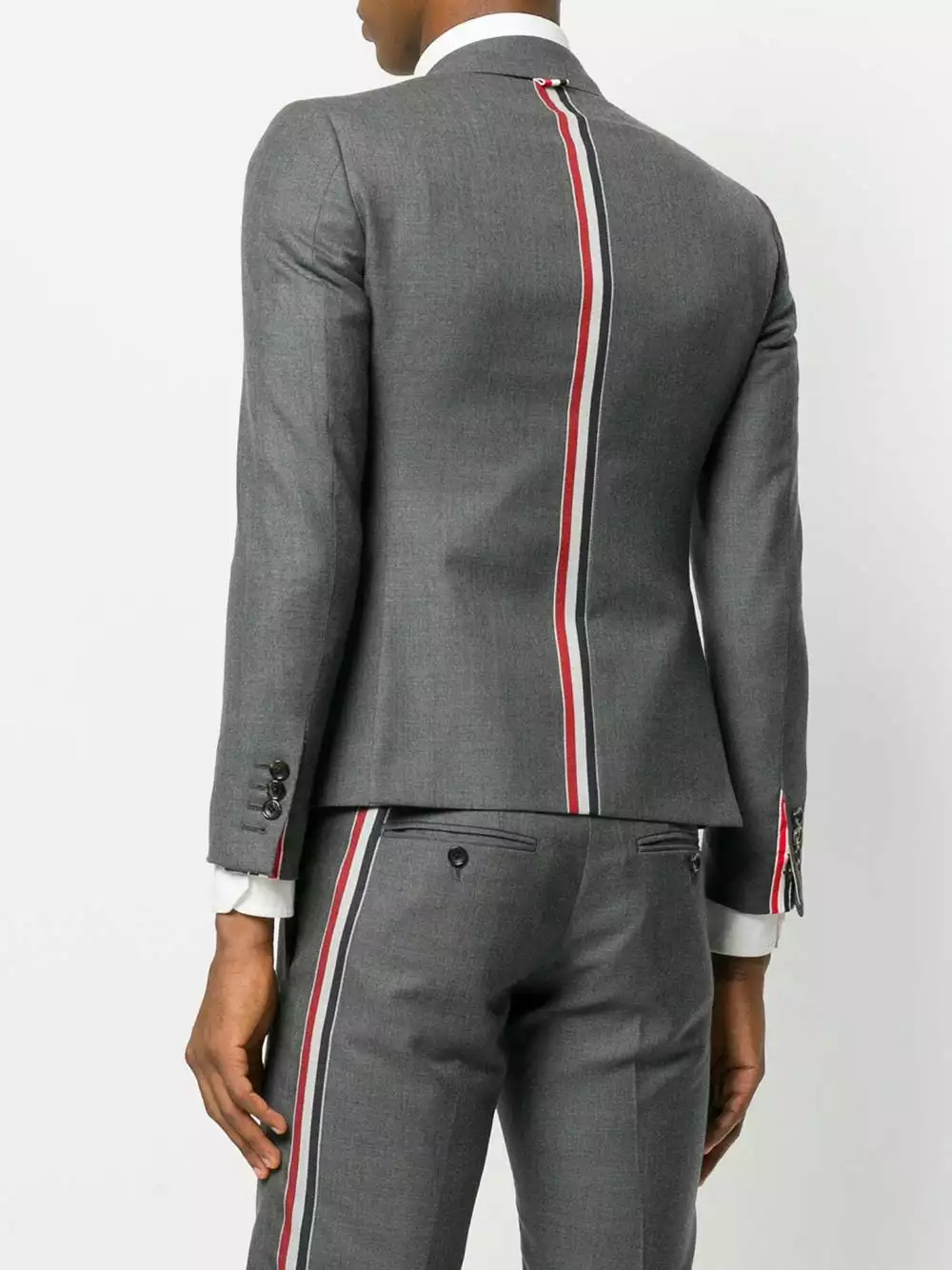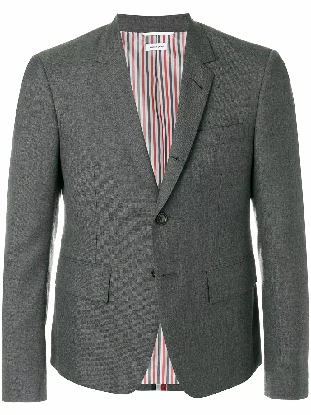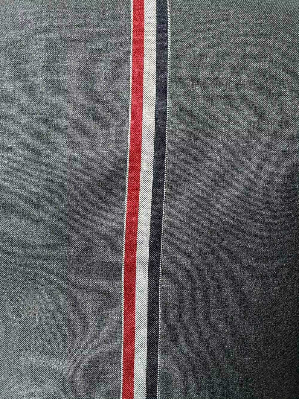 Dark grey wool Center-back Stripe Sport Coat from Thom Browne featuring notched lapels, a front button fastening, a chest pocket, front flap pockets, cropped sleeves, button cuffs, a slim fit, a double vent to the rear, a straight hem and a signature striped lining.