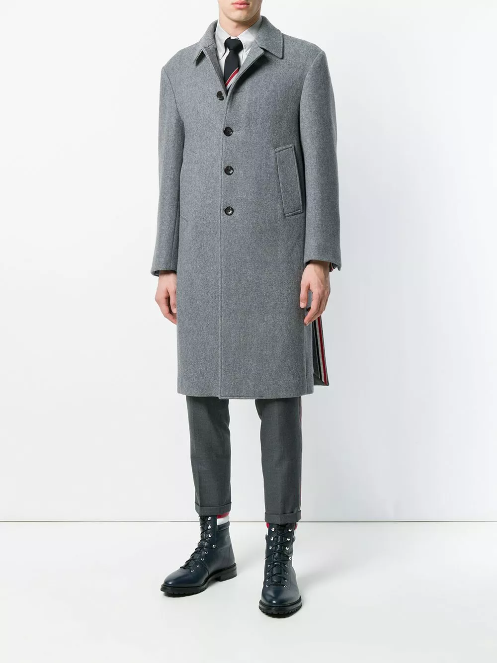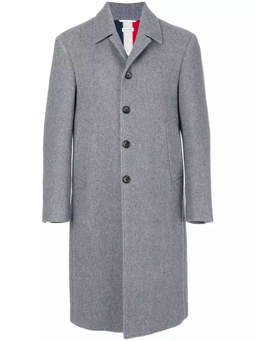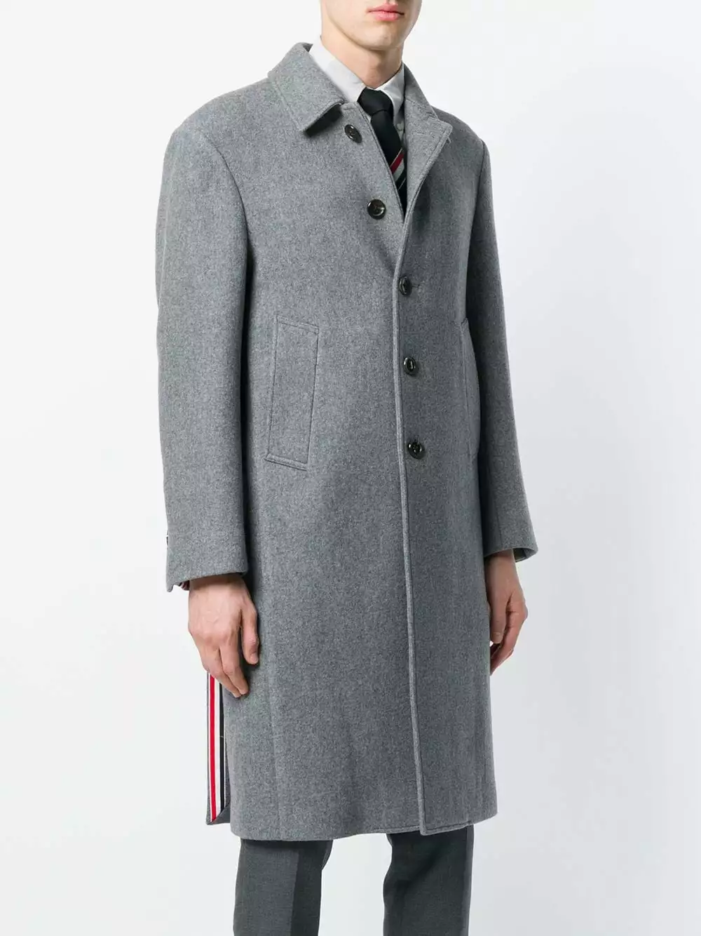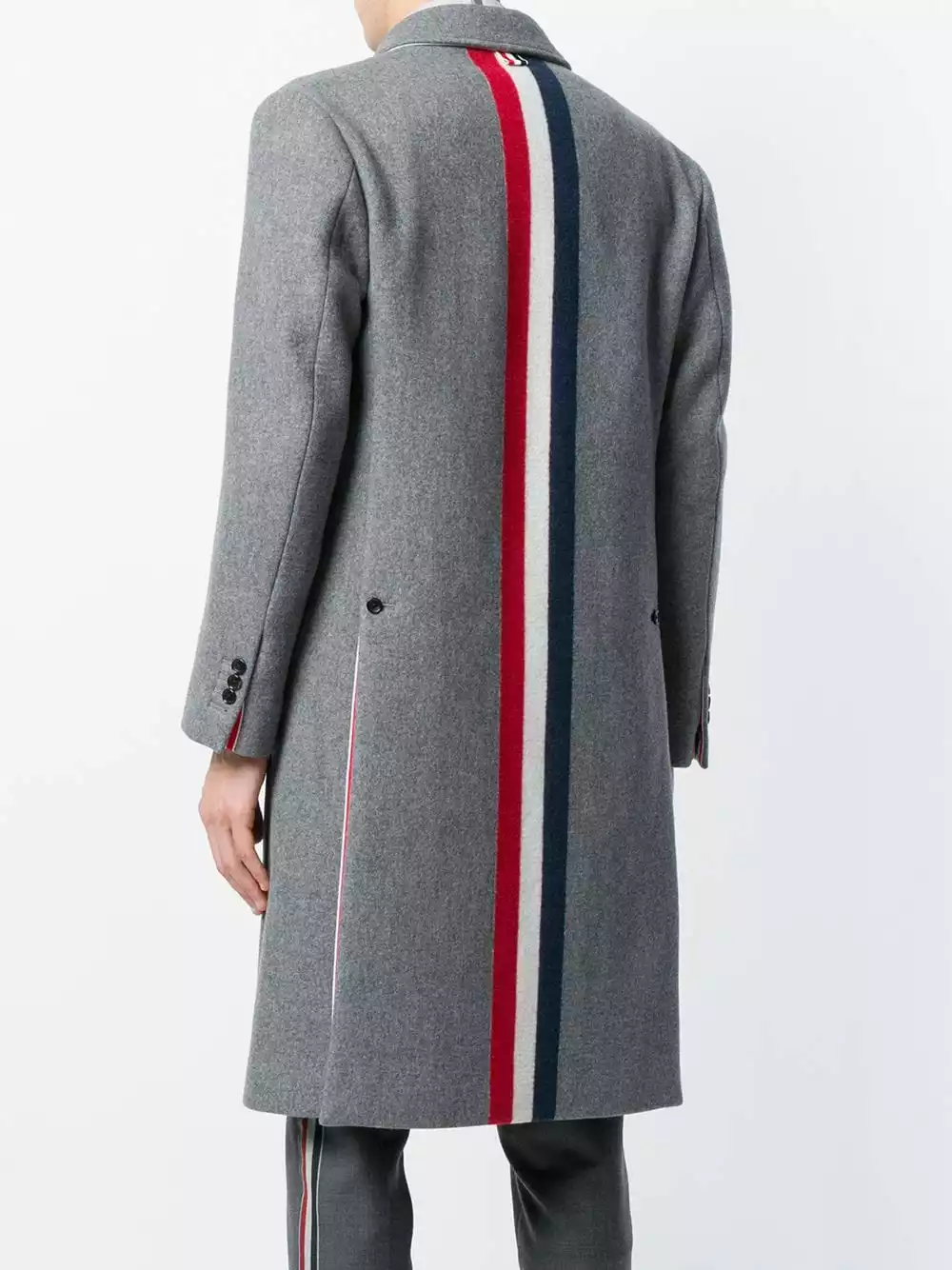 Grey Center-Back Stripe Unconstructed Relaxed Fit Bal Collar Overcoat from Thom Browne featuring a classic collar, a front button fastening, long sleeves, button cuffs, side slit pockets, a double vent to the rear and a red, white and blue stripe to the back.