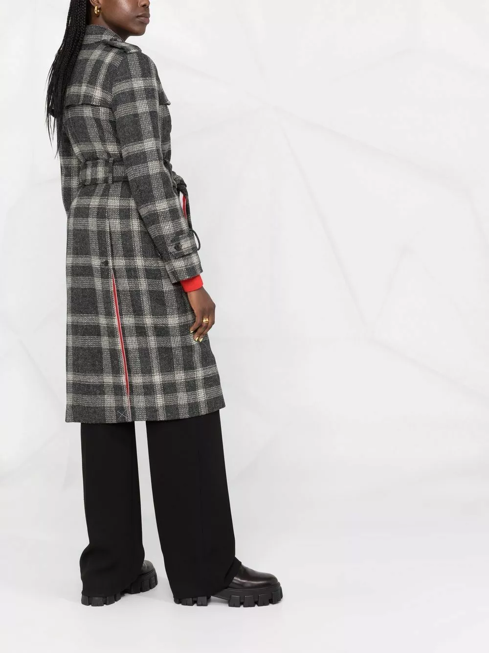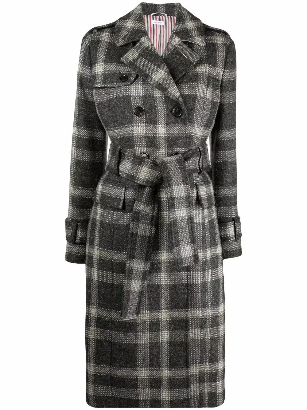 Thom Browne takes traditional designs and turns them into something contemporary. Crafted from pure wool, this double-breasted coat features a plaid check pattern and is detailed with an elegant belted wist and storm flap for a classy yet modern look.