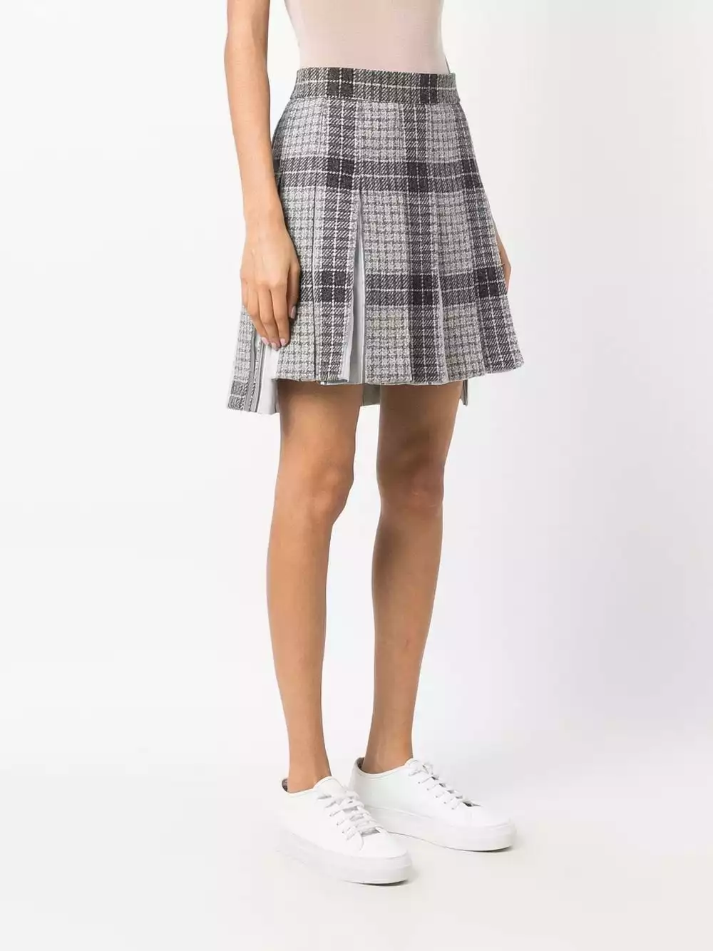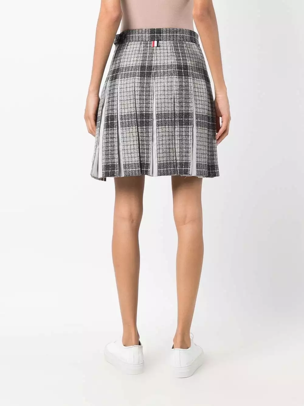 Thom Browne’s ability to transform a classic design into a contemporary piece is showcased here. Crafted in silk and wool, this timeless check pleated skirt is elevated with its modern high-low hem.