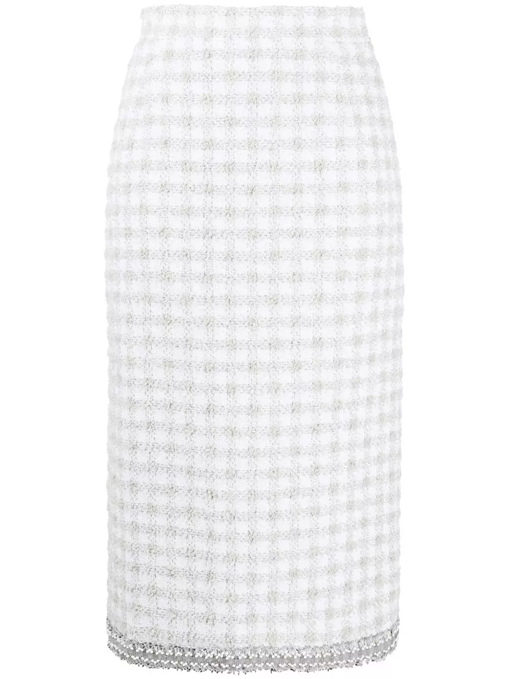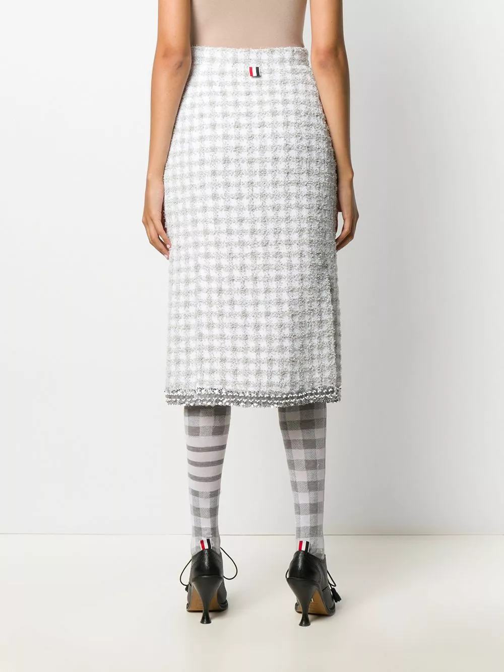 Every wardrobe deserves some tweed. But yours is special. Yours deserves this eyelash-tweed checked pencil skirt from Thom Browne. Featuring a high waist, a check pattern, a straight leg, a double vent to the rear, a mid-length, a frill trim, a signature grosgrain loop tab and an eyelash tweed.