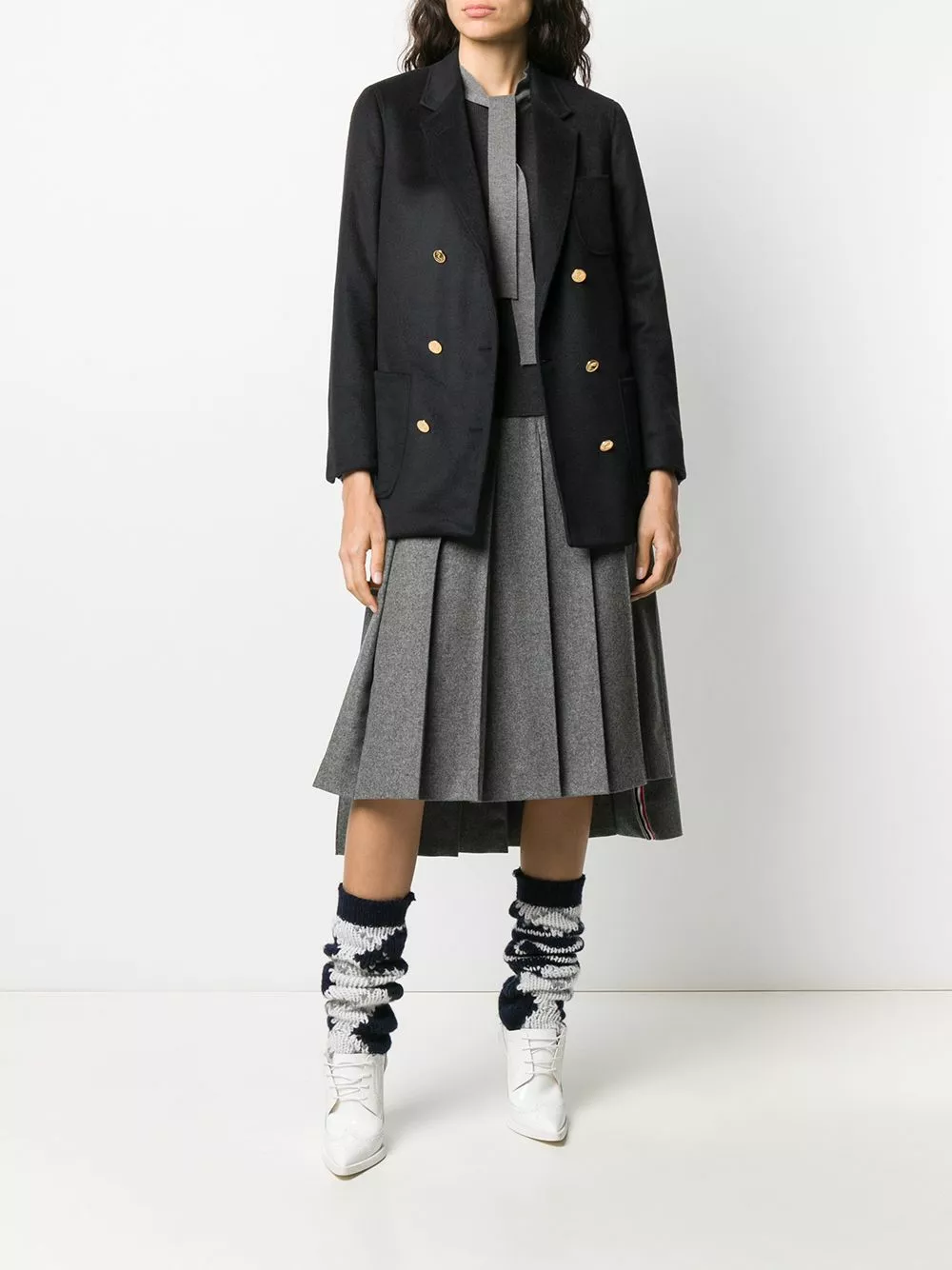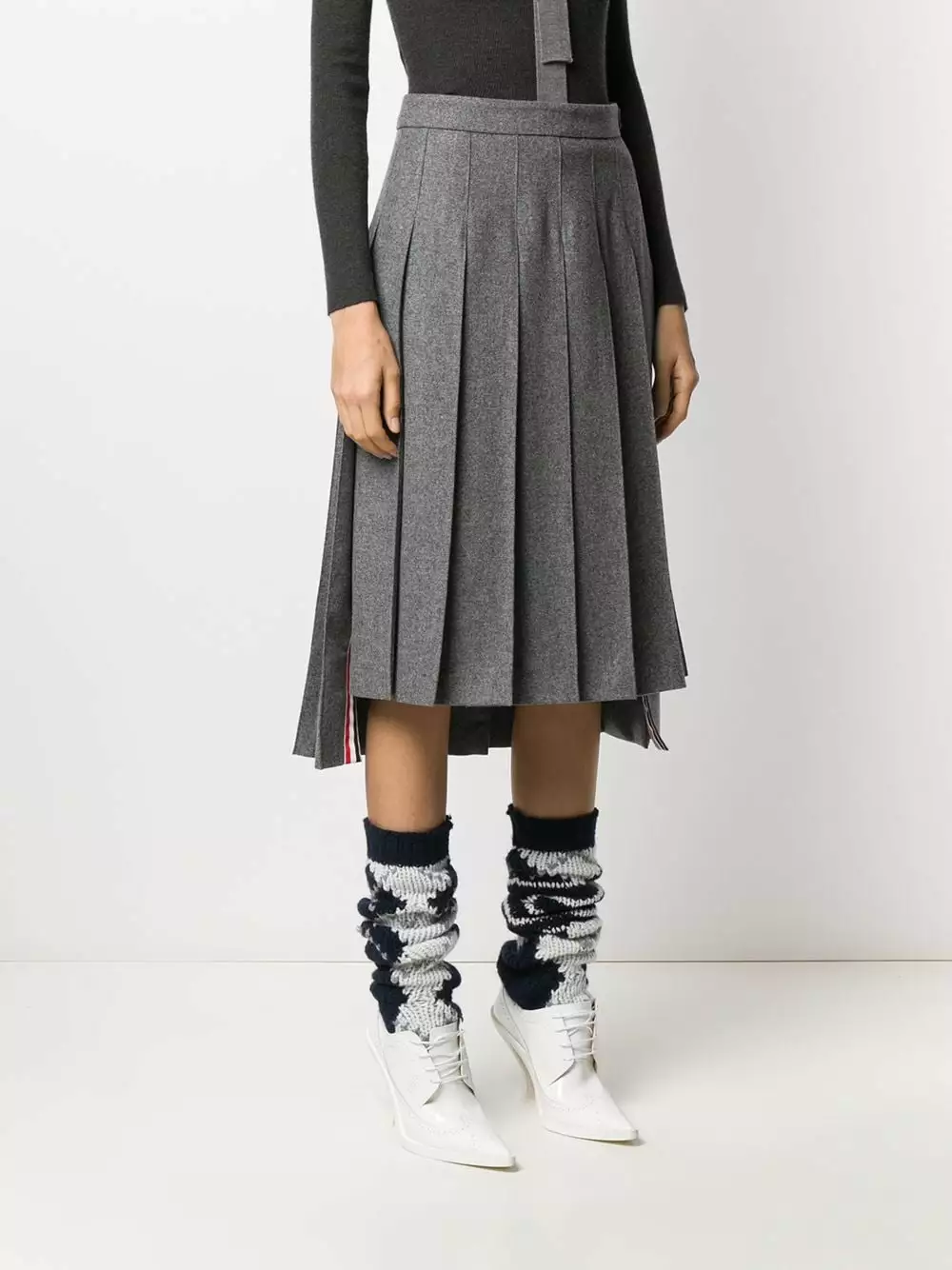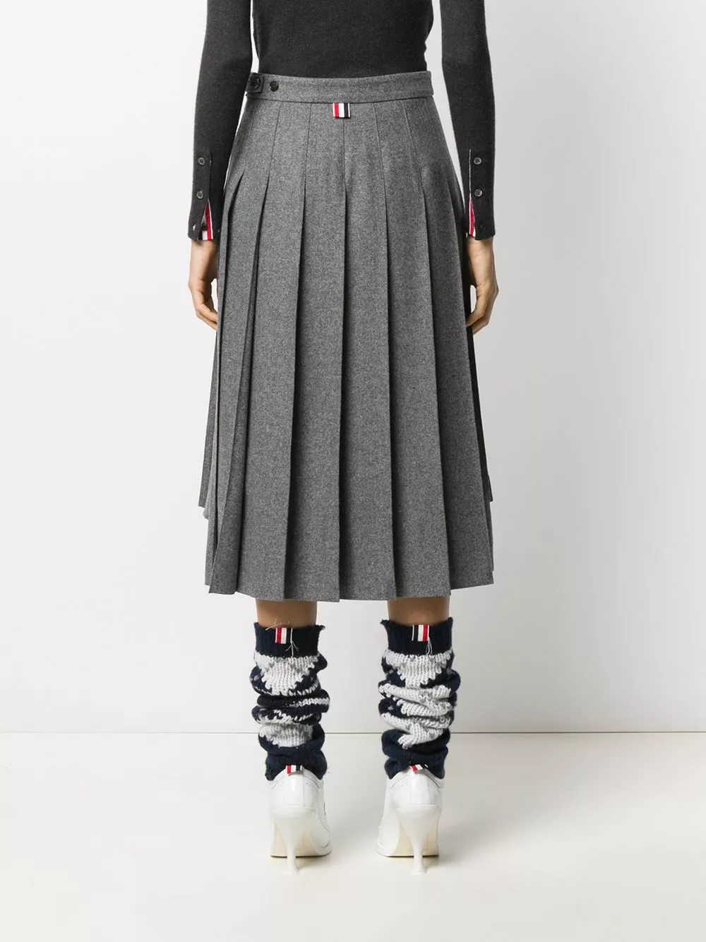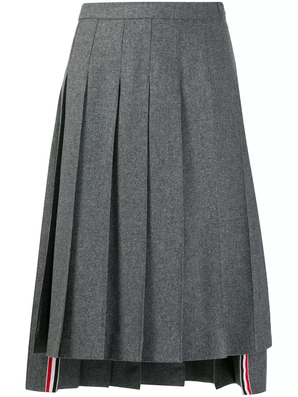 Remember school uniforms? Bring that cool vibe to the office with this grey wool dropped back pleated skirt from Thom Browne. Designed with a pleated style, this piece will keep an elegant silhouette all day long. Level up. Featuring a high waist, a side button fastening, a pleated design, a mid-length and dropped back.