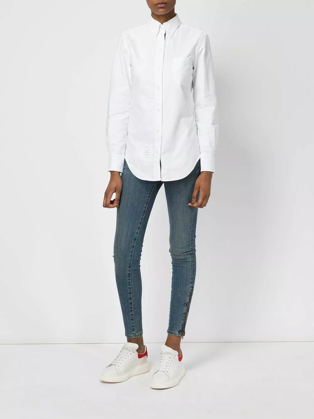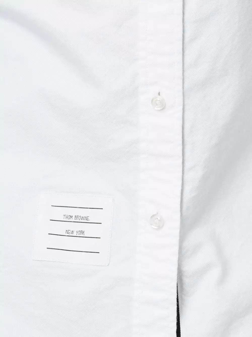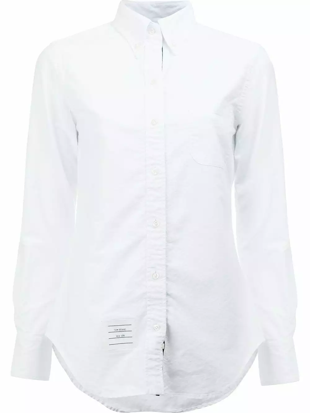 White cotton Classic Long Sleeve Button Down Shirt In White Oxford from Thom Browne featuring a button down collar, long sleeves, button cuffs, a patch pocket at the chest, a curved hem and a grosgrain placket.