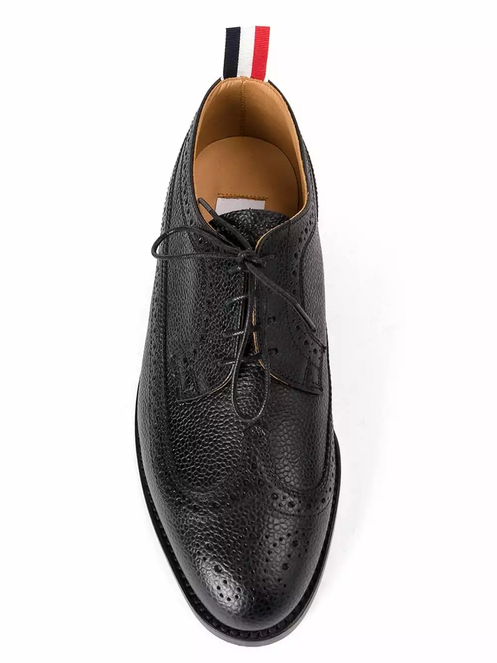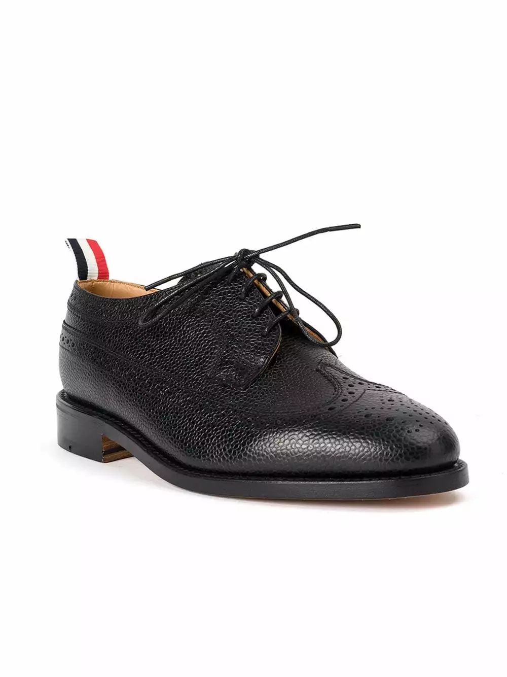 Heavily rooted in tailoring and men’s formalwear, Thom Browne’s eponymous label began in 2003 and has continued to find ways to innovate and refresh classic designs with each new season. A feminine version of a classic men’s shoe, these brogues come in a pebble textured leather and feature a rear pull tab with the label’s signature three stripes at the rear. This item fits small, please select half a size up.