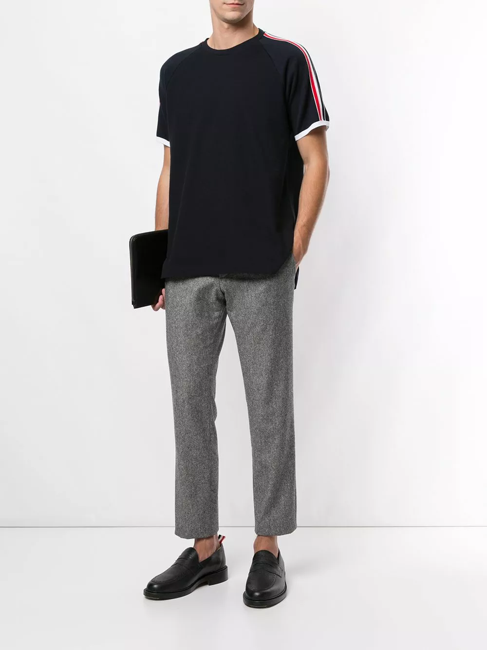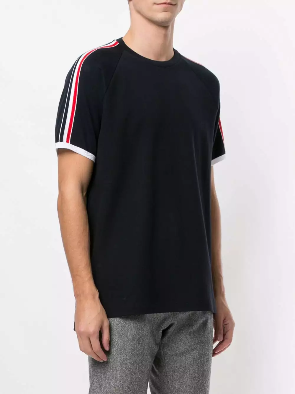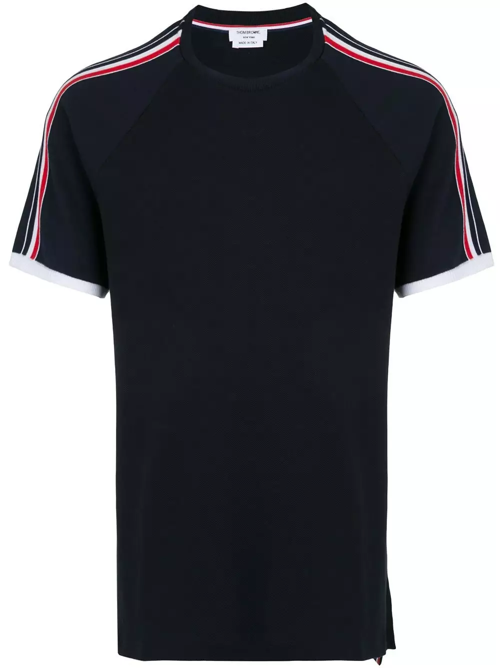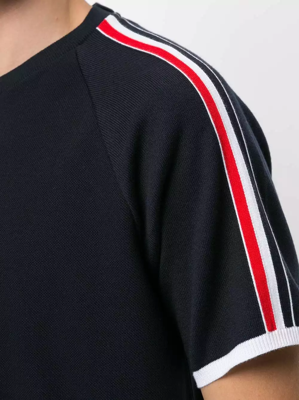 Boasting a classic T-shirt style, this Thom Browne tee is however slightly different. Crafted in classic pique, this navy short raglan sleeve T-shirt is constructed from a fine knit. Completed with tri-coloured branded stripes to the sleeves, this elevated top is smarter then your average jersey. Featuring a ribbed round neck, short sleeves and a signature tri-colour striped trim.