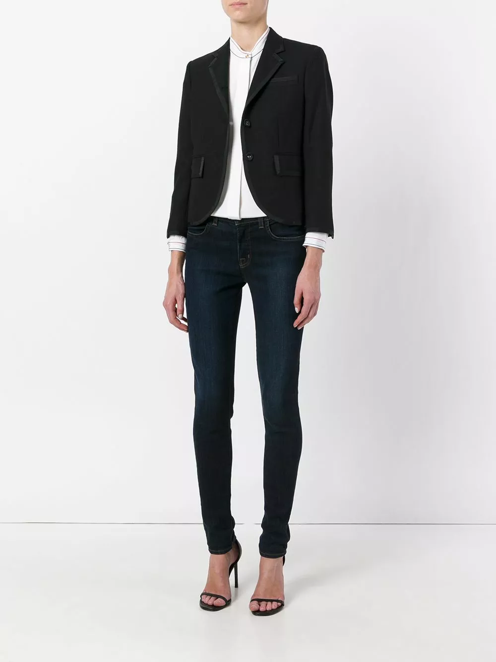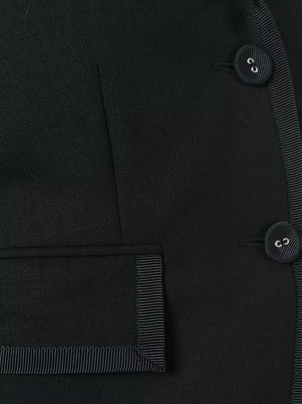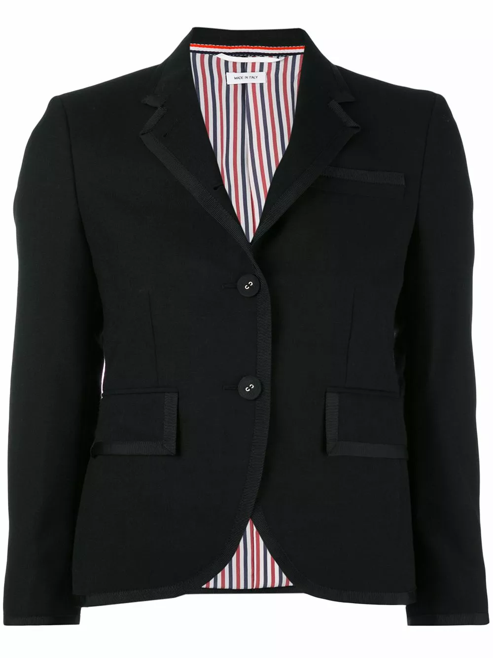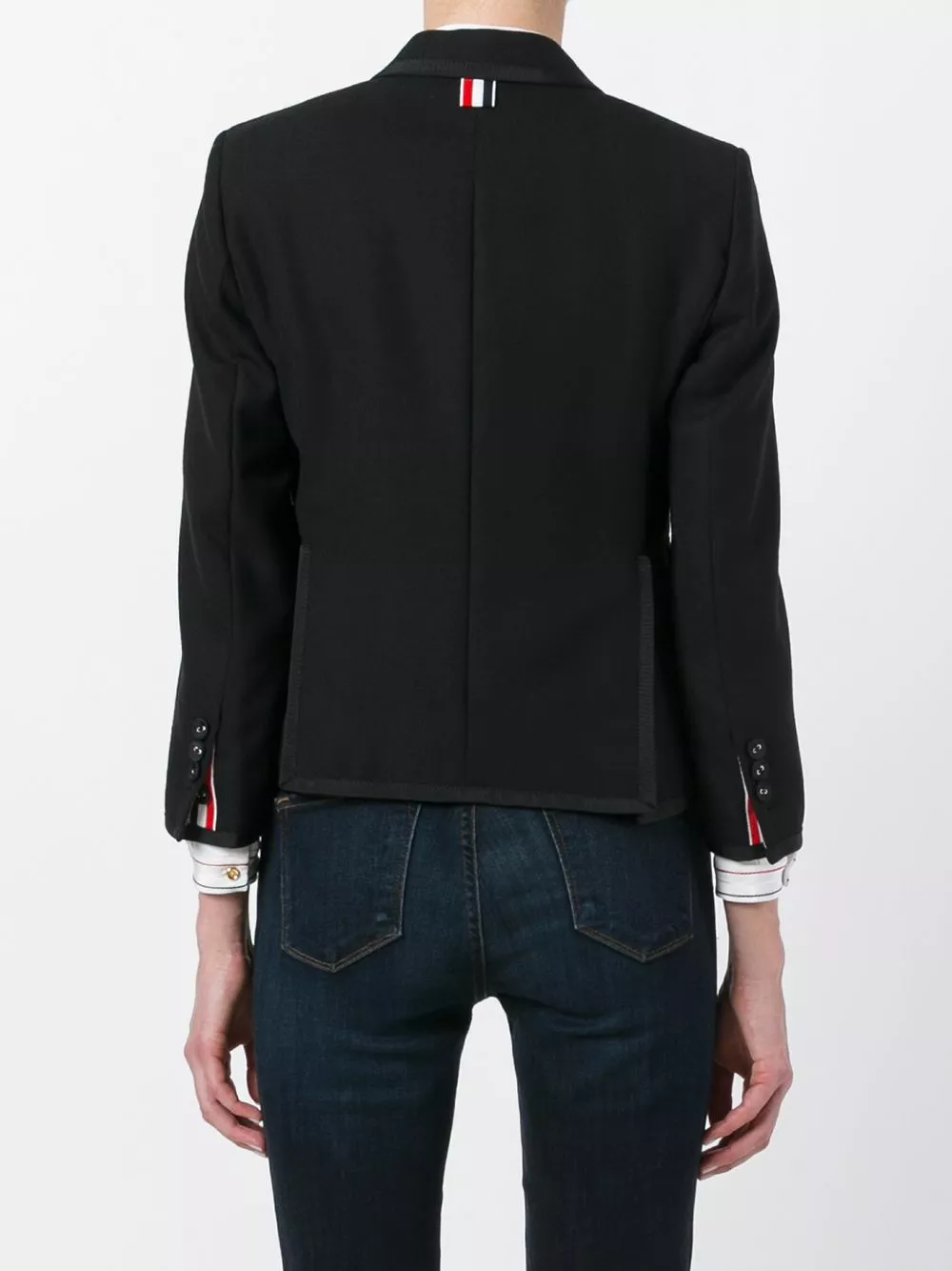 Black wool and silk Classic Single Breasted Sport Coat With Grosgrain Tipping In 2 Ply Fresco from Thom Browne featuring notched lapels, a button fastening, three-quarter length sleeves, button cuffs, a broad welt chest pocket, front flap pockets, a curved hemline, a double vent to the rear, a slim fit, red, white and blue grosgrain cuffs detail and back yoke tab, ribbed piping detail and a three-coloured signature lining.