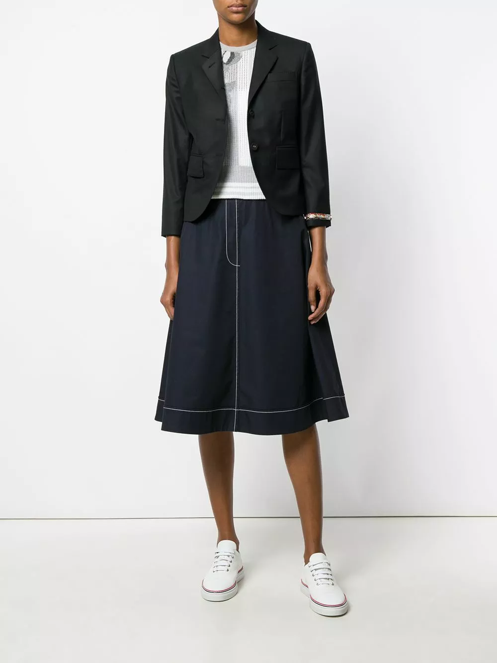 With a history in men’s formalwear, Thom Browne brings its tailoring expertise to the table when creating its women’s collection, focusing on premium materials and expertly cut shapes. Crafted in Italy from black wool-silk blend, this wristwatch appliquée sport blazer features notched lapels, a front button fastening, three-quarter length sleeves, button cuffs, front flap pockets, a broad welt chest pocket, a double vent to the rear, a signature grosgrain tab, a red, white and blue striped detail in the cuffs and a beaded embroidered wrist watch on the left sleeve.