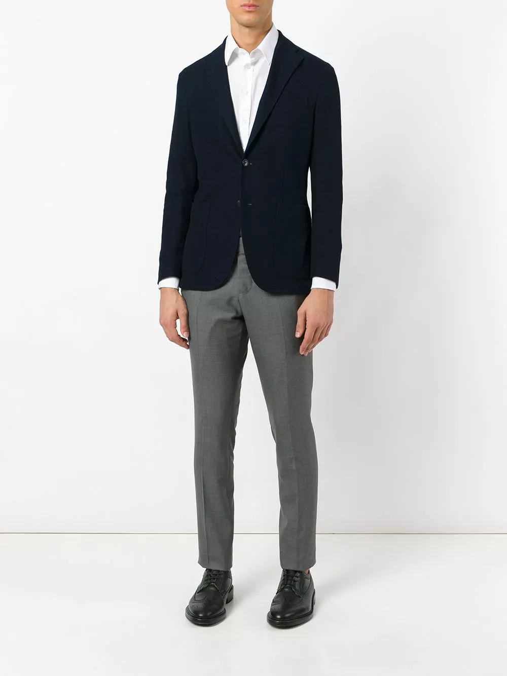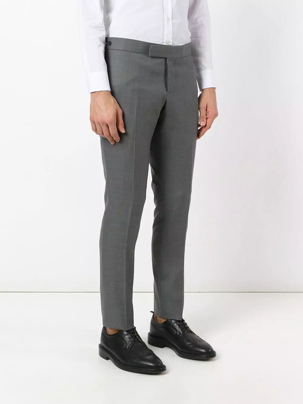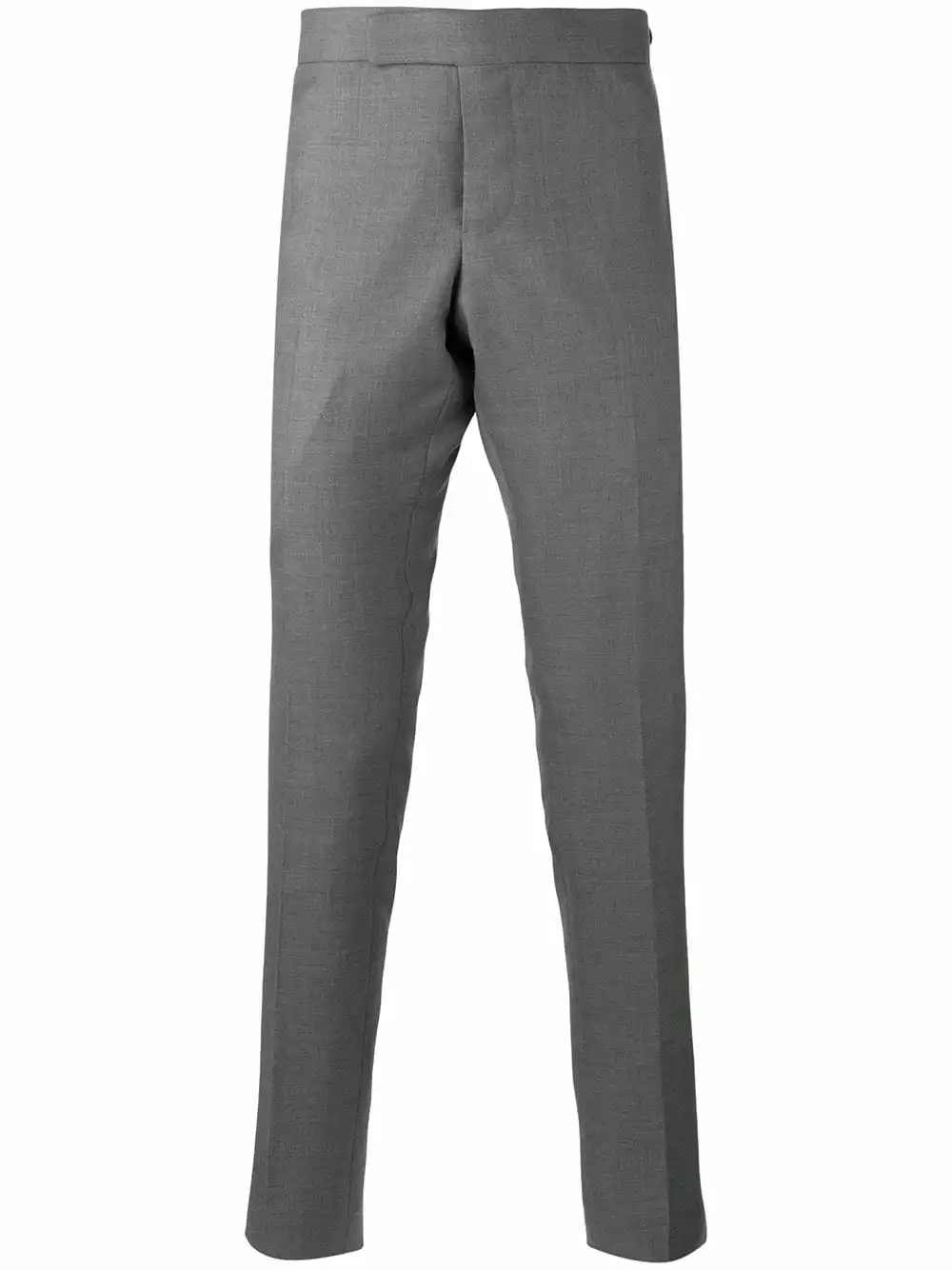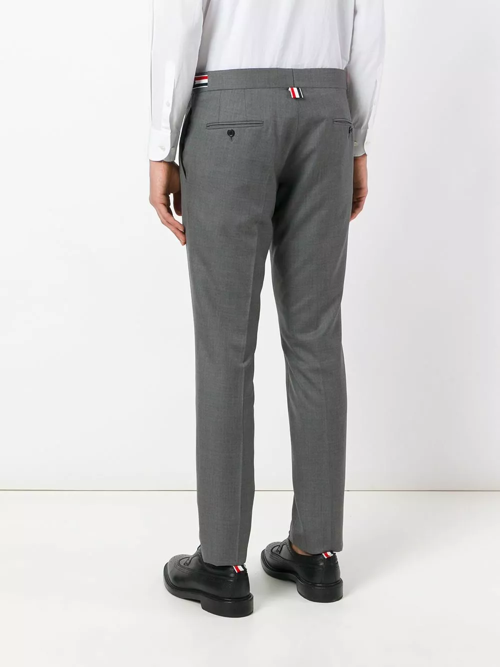 Inspired by the classic American silhouettes of his childhood, New York fashion designer Thom Browne has re-imagined modern suiting for a contemporary audience. Often creating pieces with an idiosyncratic twist, these grey trousers are a perfect example of Browne’s unfaltering talent. Impeccably crafted in Italy from soft wool, these classic trousers are fashioned with a concealed fly fastening, a set of four pockets and a signature tri-colour striped grosgrain trim to each side.