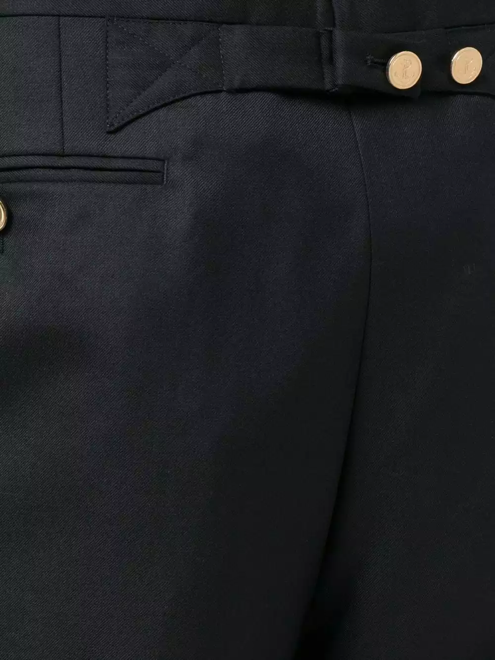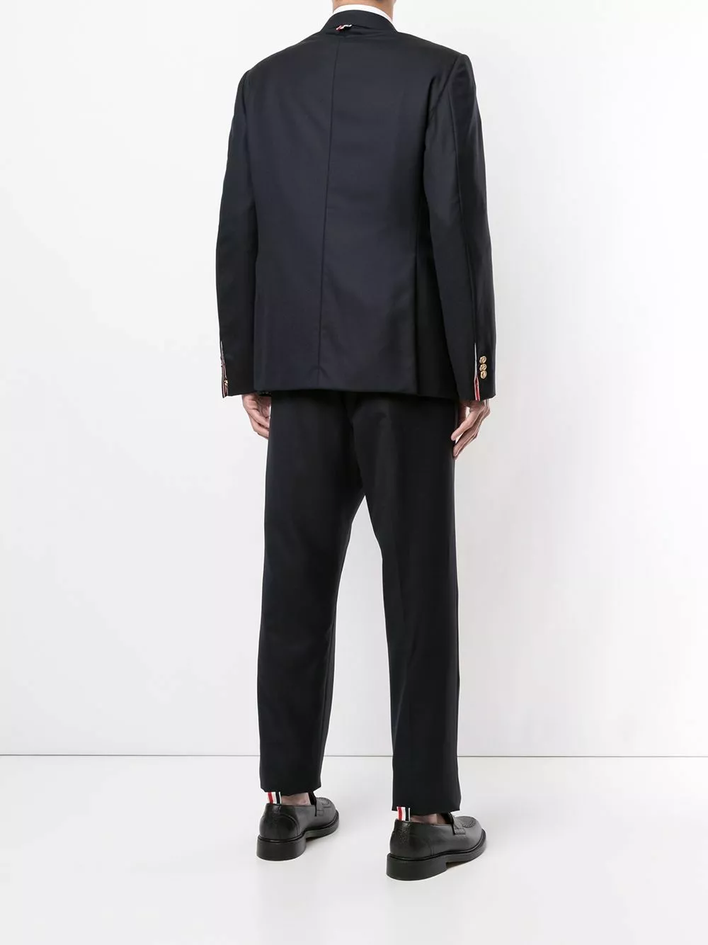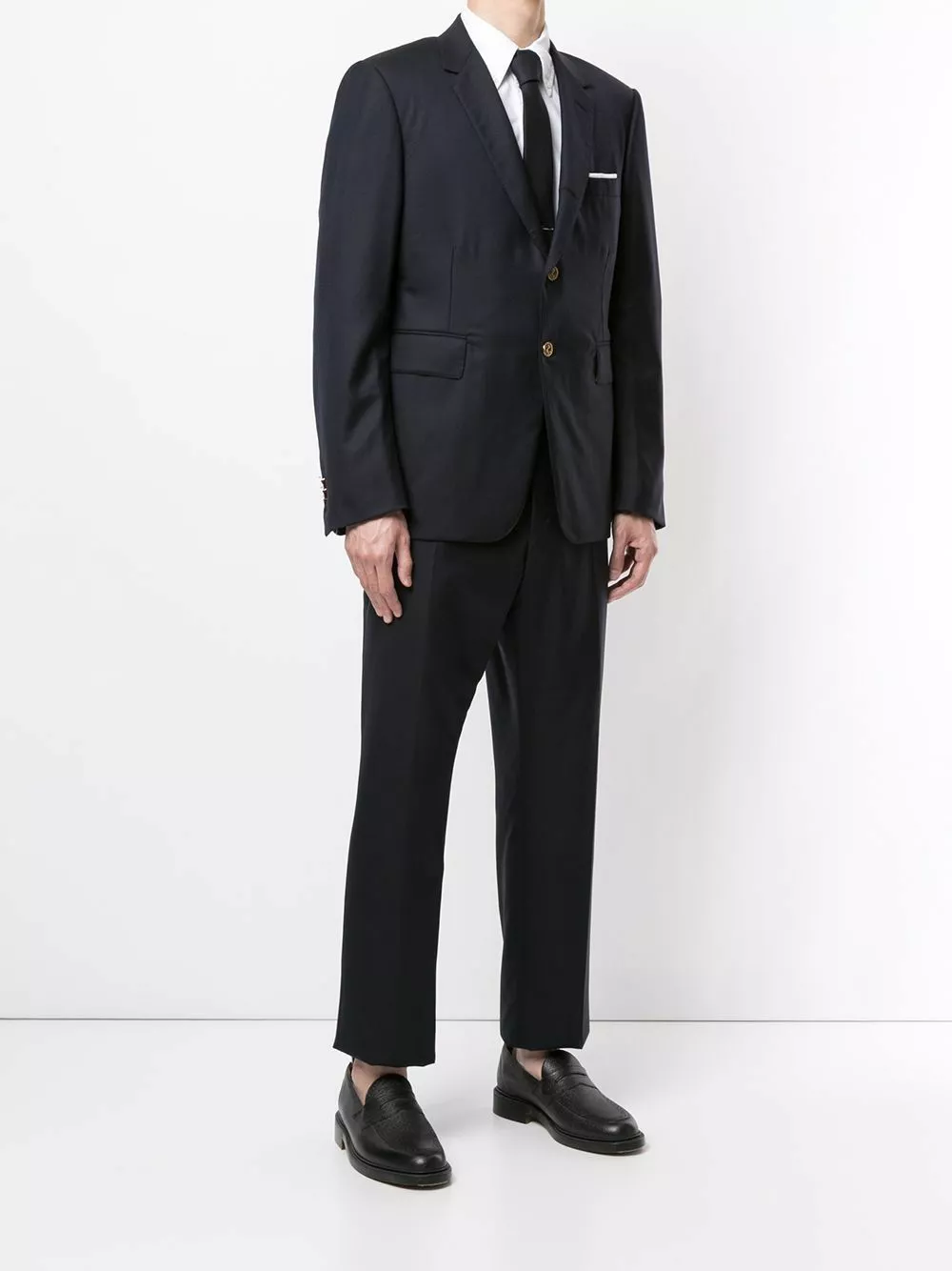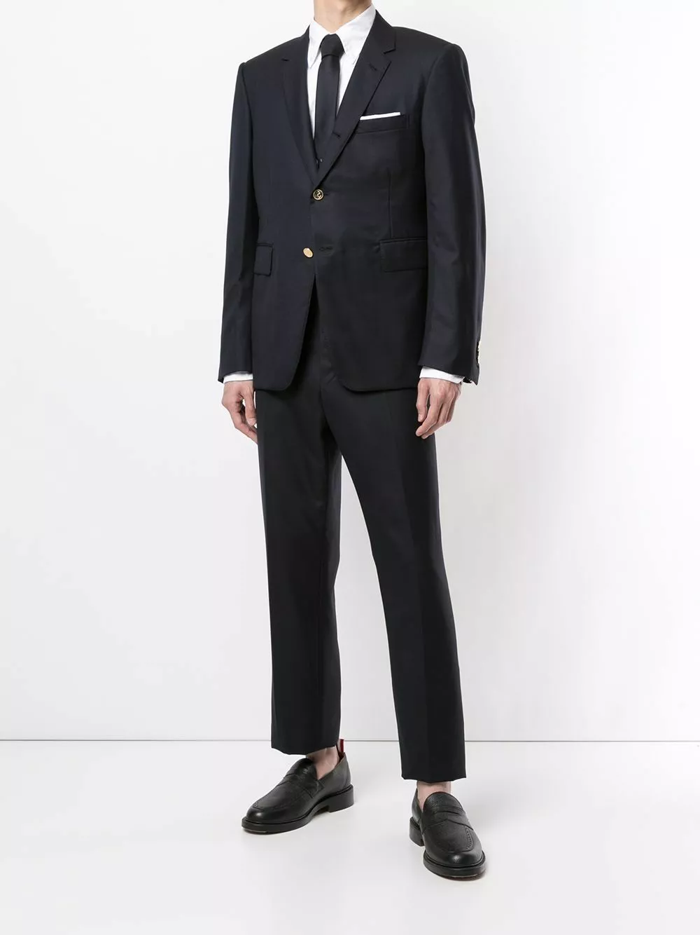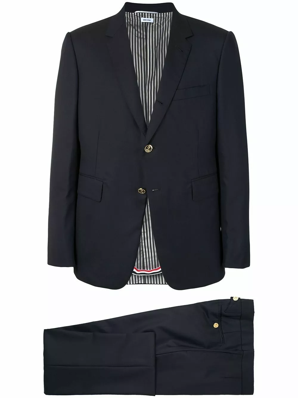This navy blue suit bears all the hallmarks of Thom Browne, its single-breasted silhouette expertly made from ultra-fine super 120s wool – a luxuriously soft cloth that exudes quality. The jacket fastens with two buttons and is finished with notched lapels, a single welt pocket, two flap pockets and buttoned cuffs, with a double vent and signature striped tab to the rear. Meanwhile, the interior is fully lined with a striking striped fabric. The trousers take a straight cut, topped with a waistband, concealed fastening, side pockets and buttoned welt pockets.