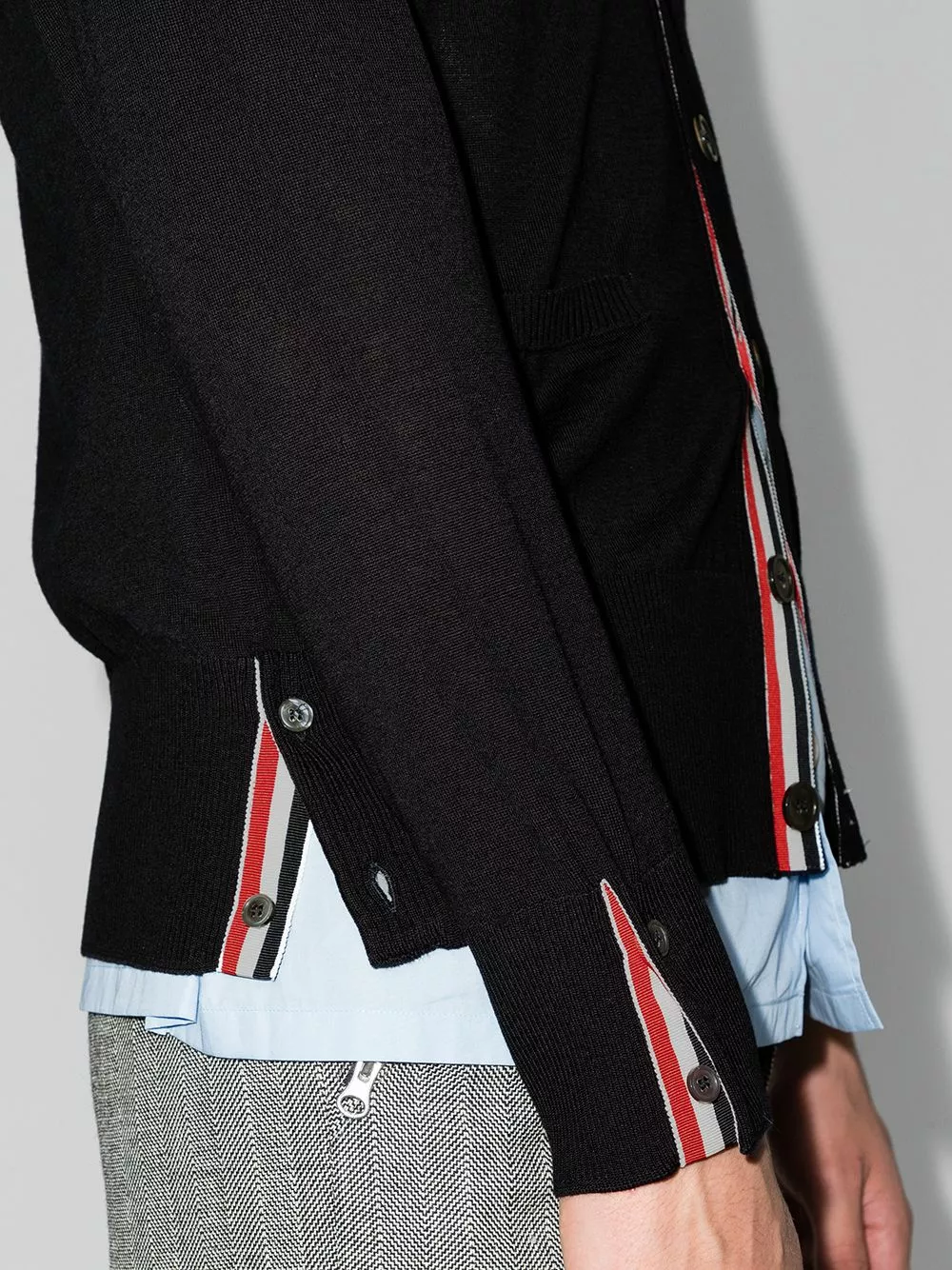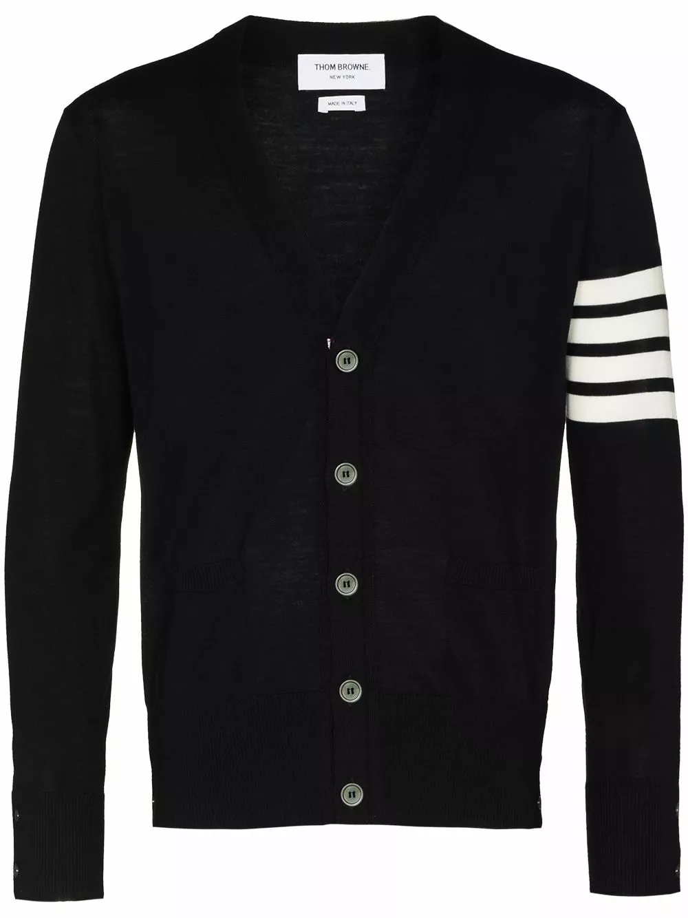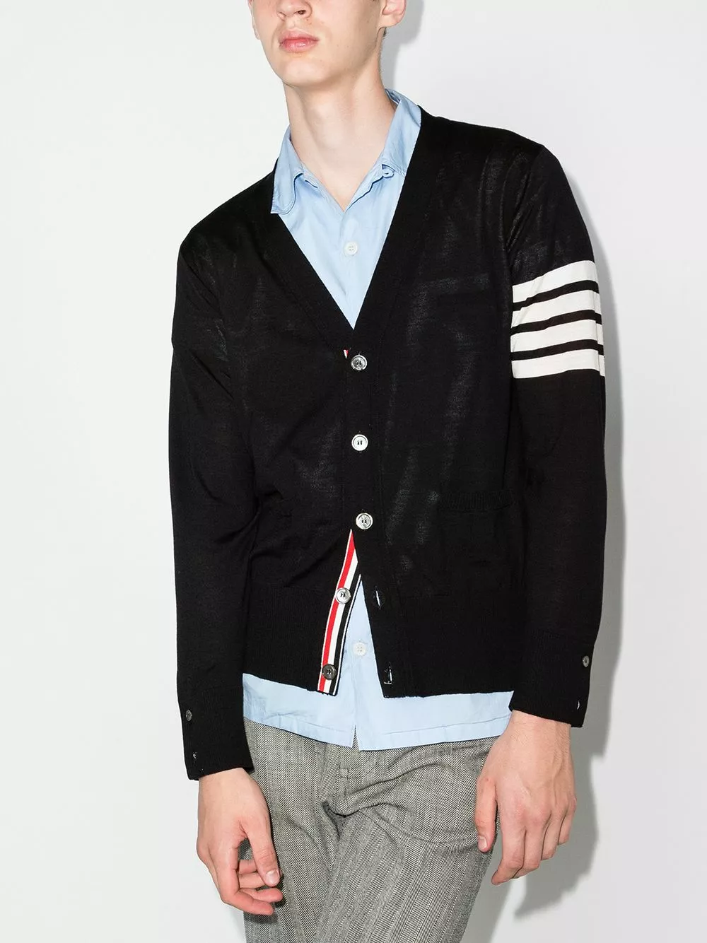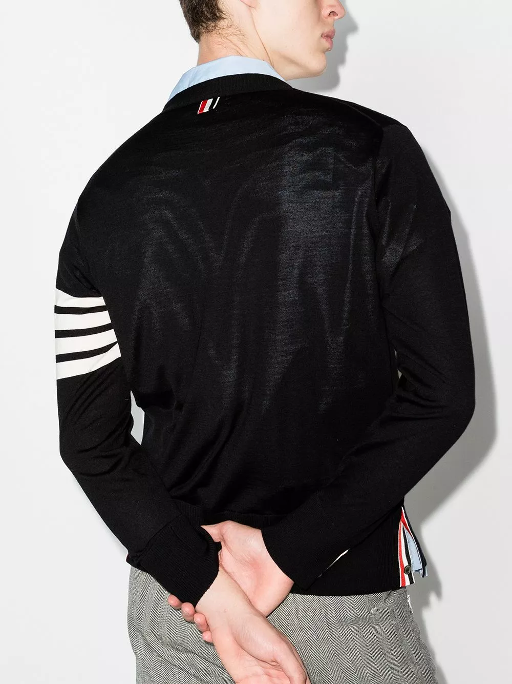 Thom Browne doesn’t have an official logo but is characterised through signature details such as the 4-Bar stripe and grosgrain loop tab. Both of these elements are featured on this long-sleeve cardigan, creating an instantly recognisable design.