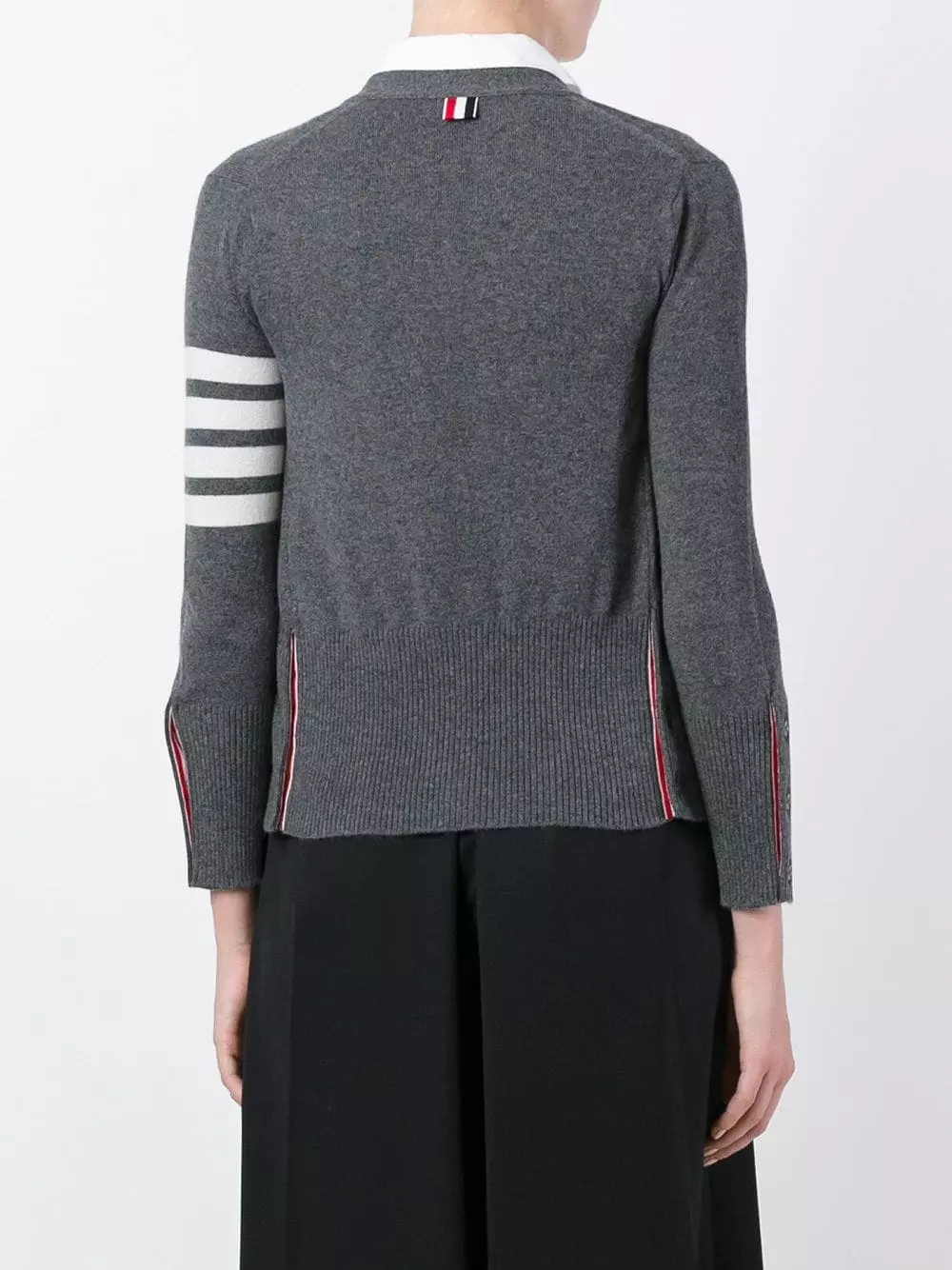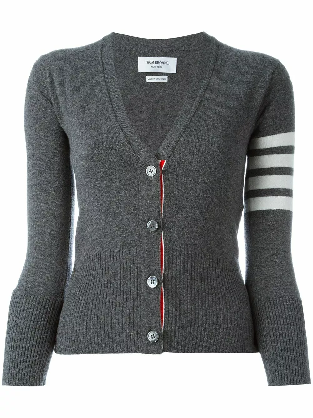 As renowned for his beloved knitwear as he is for his boundary-pushing tailoring, this knitted cardigan finds Thom Browne editing a familiar favourite with more athletically-inclined detailing. Crafted in the United Kingdom from soft cashmere, this sophisticated cardigan features a v-neck, a front button fastening, long sleeves, button cuffs, a ribbed hem and cuffs, a double vent to the rear, stripes at the sleeve and red, white and blue grosgrain cuffs detail and back yoke tab.