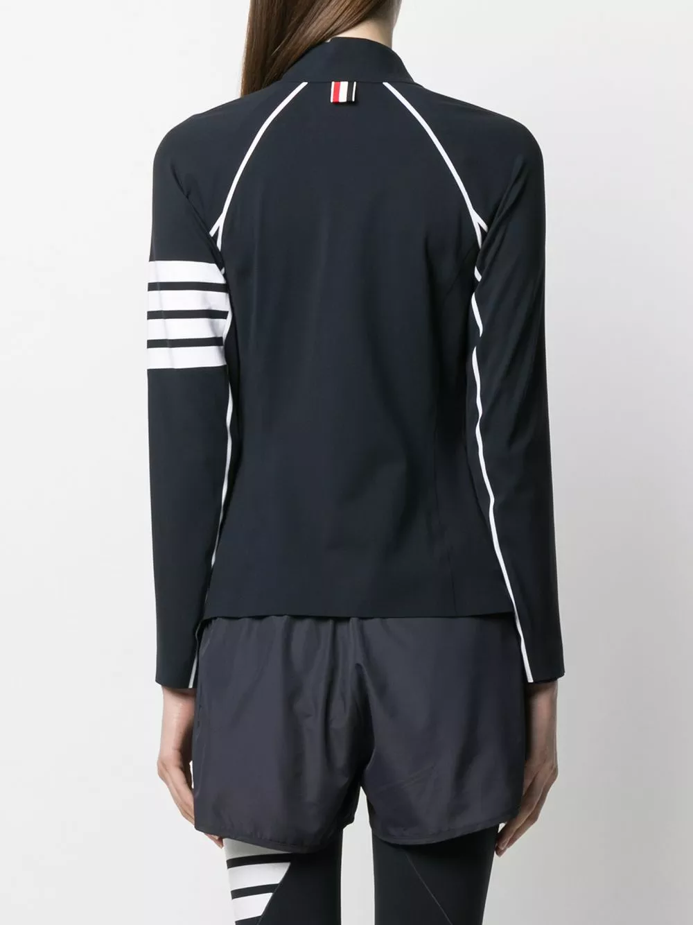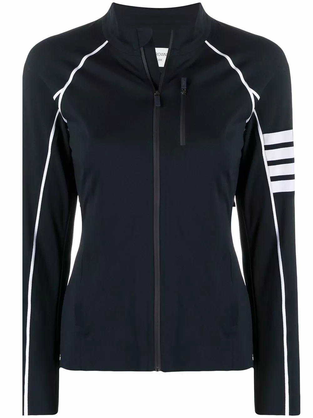 Need the motivation to get back on track? Decorated with a signature 4-Bar detail and a signature grosgrain loop tab, this navy blue and white performance track jacket from Thom Browne will make you want to get out and start moving. You can’t show it off if you just stay at home, anyway…