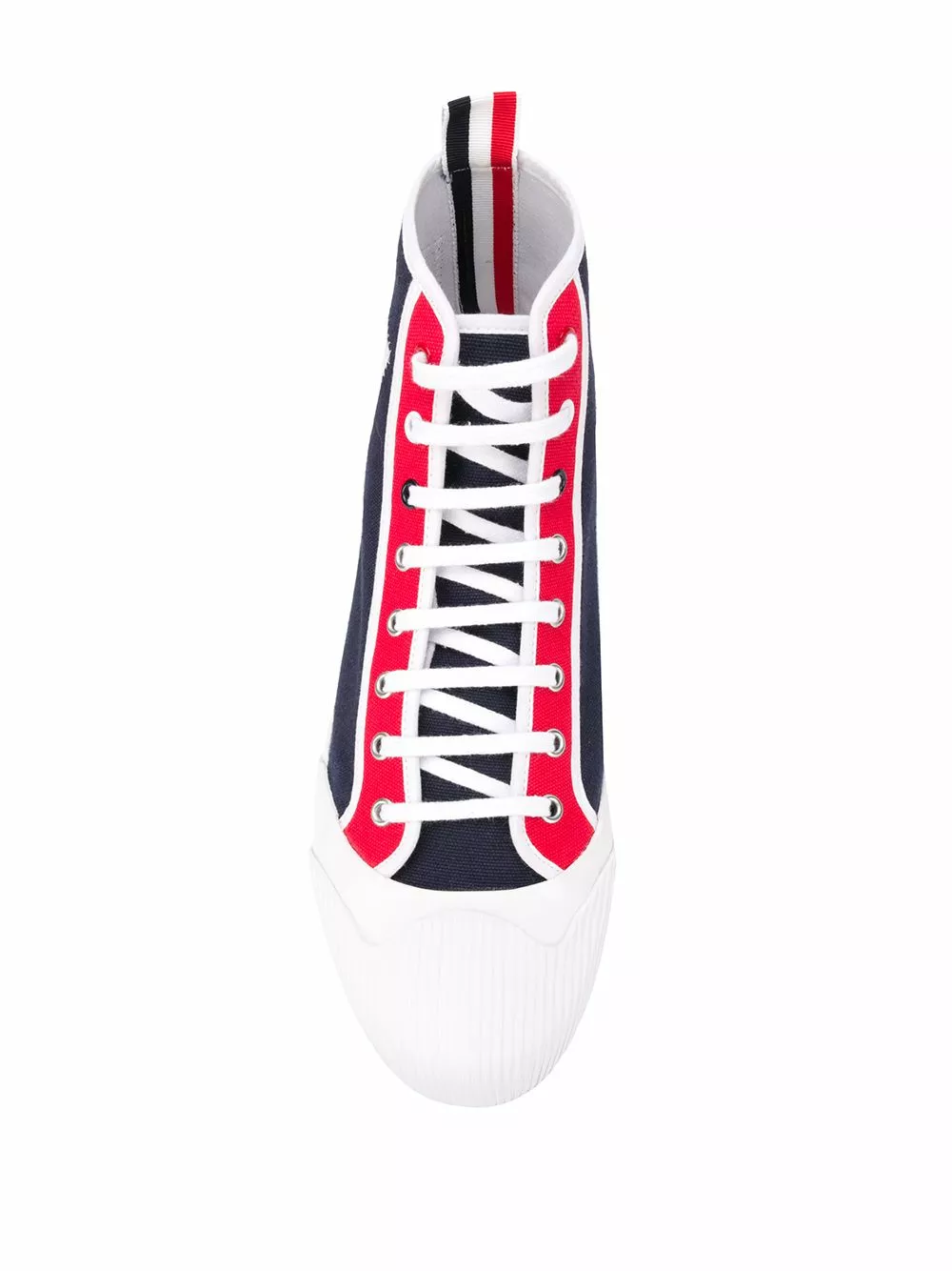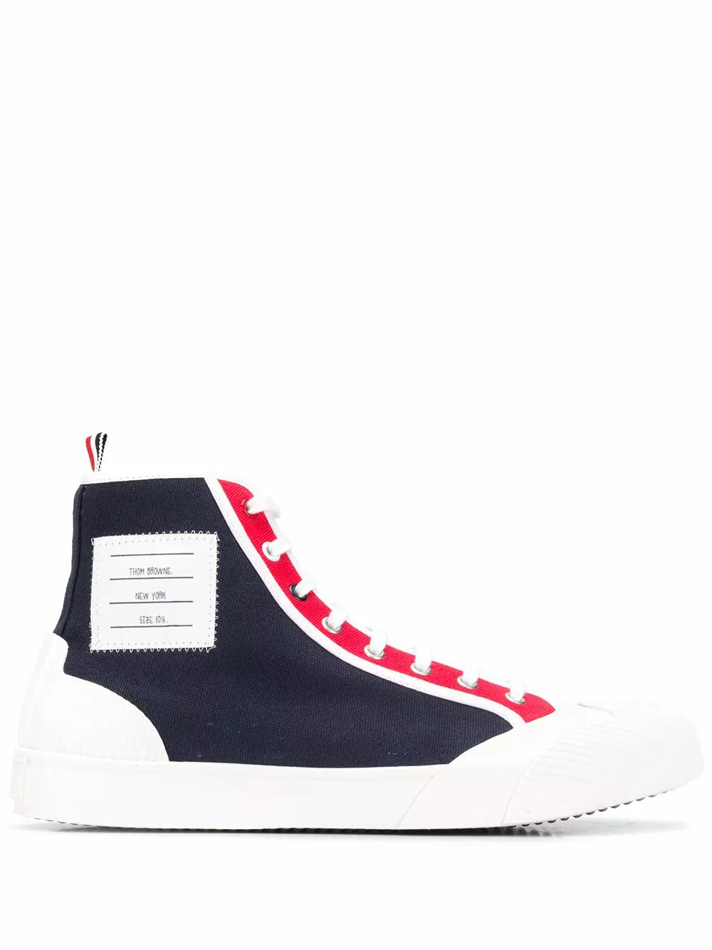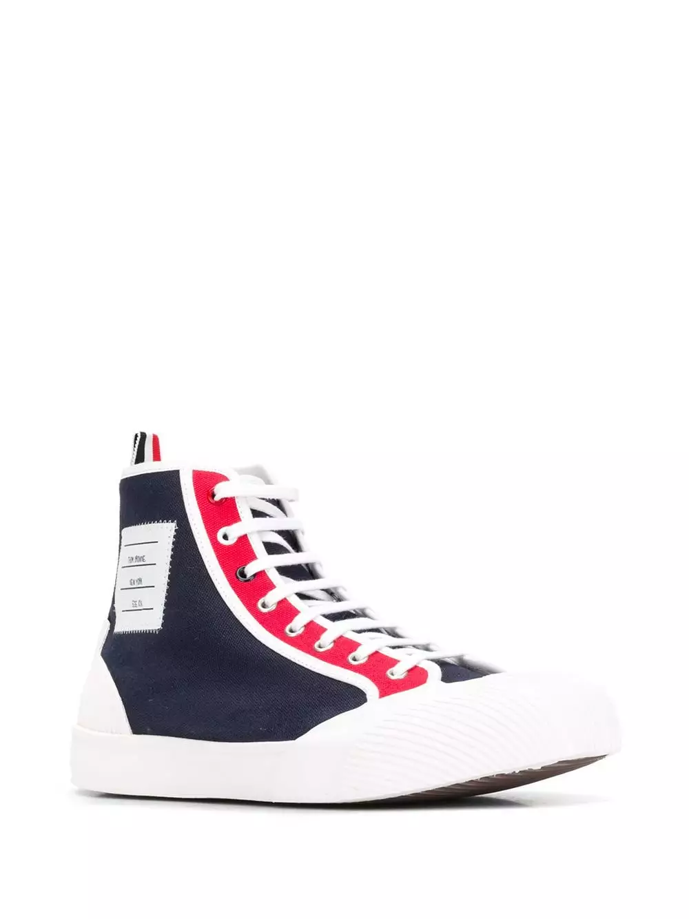 Don’t you agree that red and blue will always rule? Thank goodness that these cotton contrast panel high-top sneakers from Thom Browne boast both colours and will have you striding down the streets with stylish confidence. Lace up tight into these glorious shoes today.