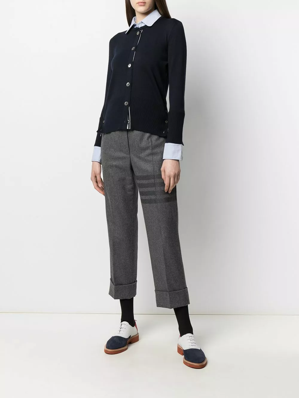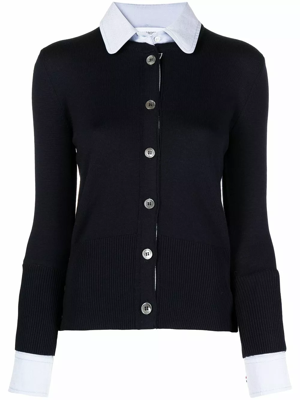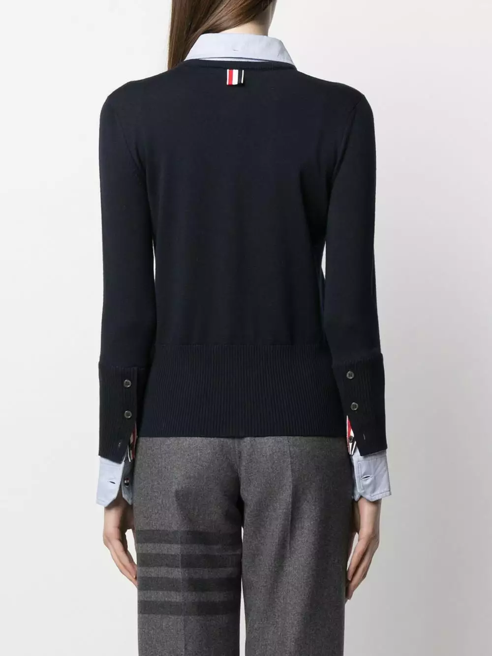 Add a collegiate feel to your ensemble. Crafted from Oxford cotton and fine merino wool, this crew neck cardigan-shirt combo from Thom Browne boasts the kind of impeccable layering that the designer is renowned for. A+ in style.