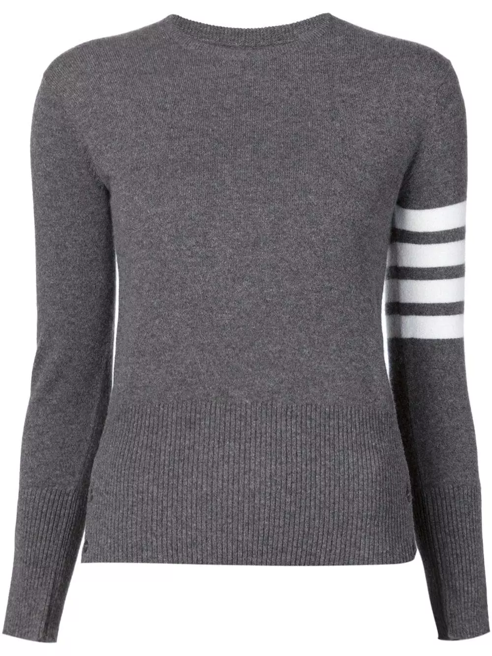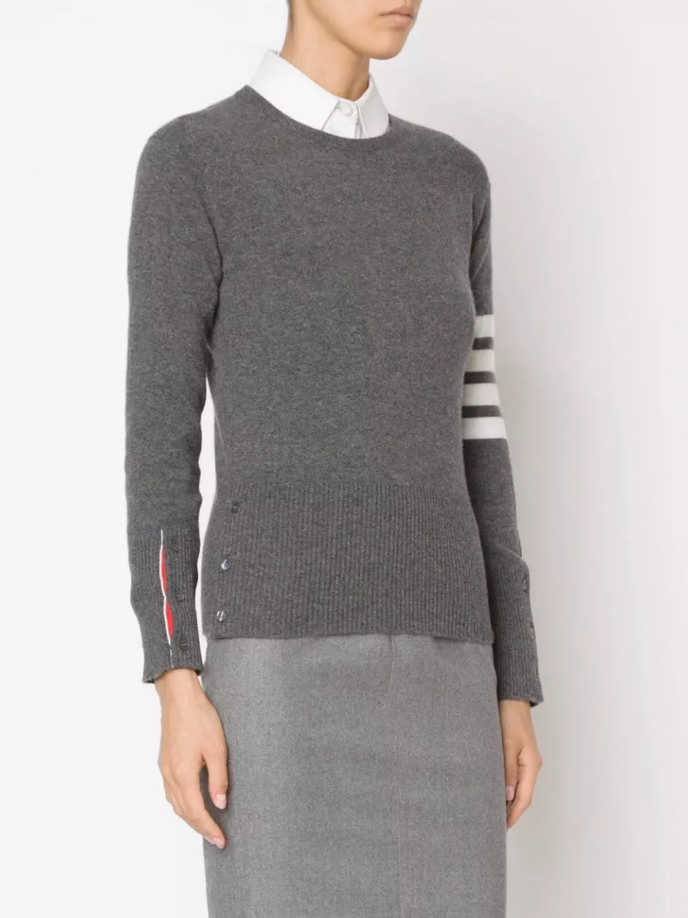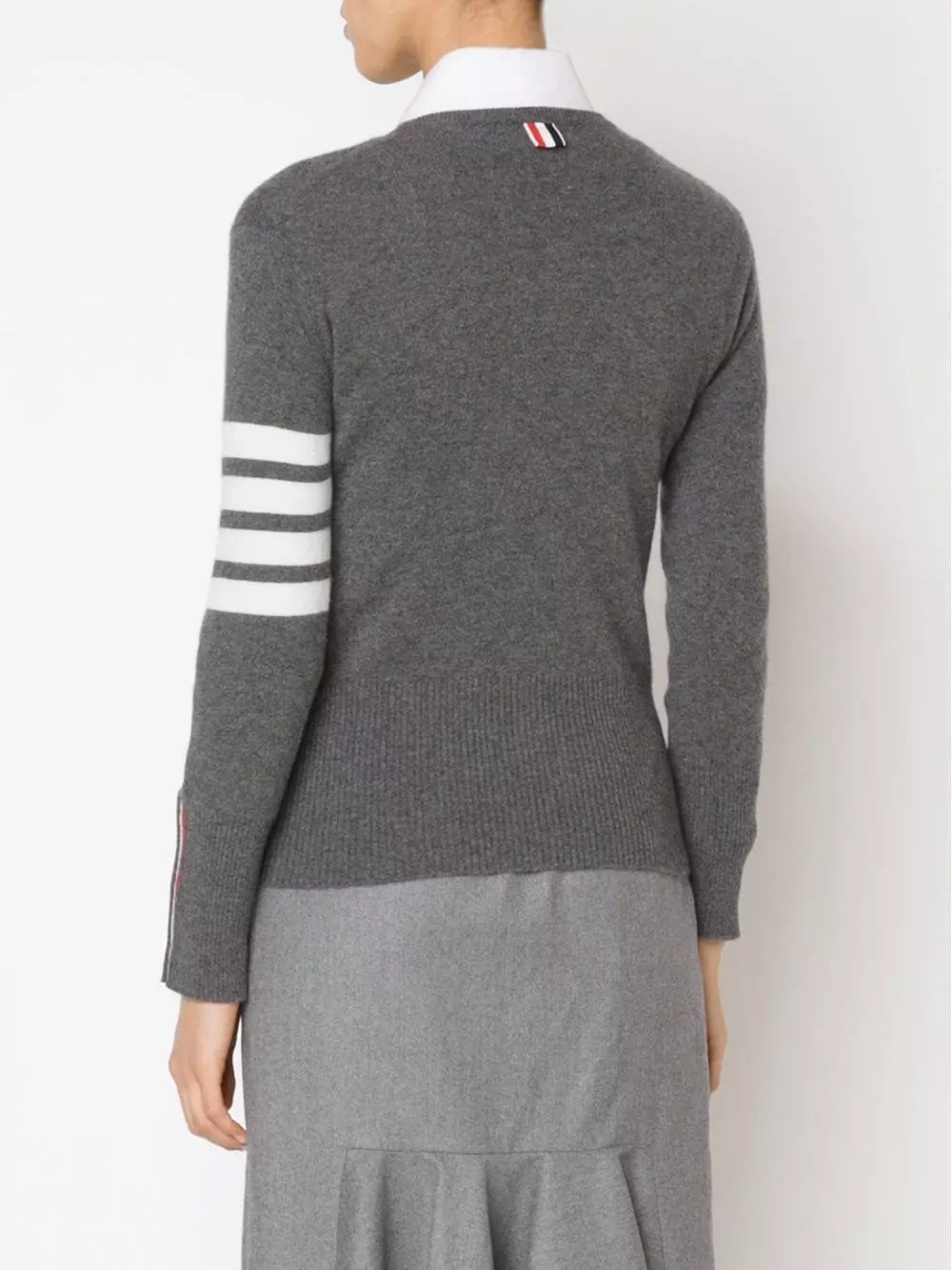 As renowned for his beloved knitwear as he is for his boundary-pushing tailoring, this knitted cardigan finds Thom Browne editing a familiar favourite with more athletically-inclined detailing. Crafted in the United Kingdom from soft medium grey cashmere, this elegant jumper features a ribbed crew neck, long sleeves, button cuffs, a ribbed hem and cuffs, 4-bar stripes at the sleeve, red, white and blue grosgrain detailing and back yoke tab and side buttoned slits.