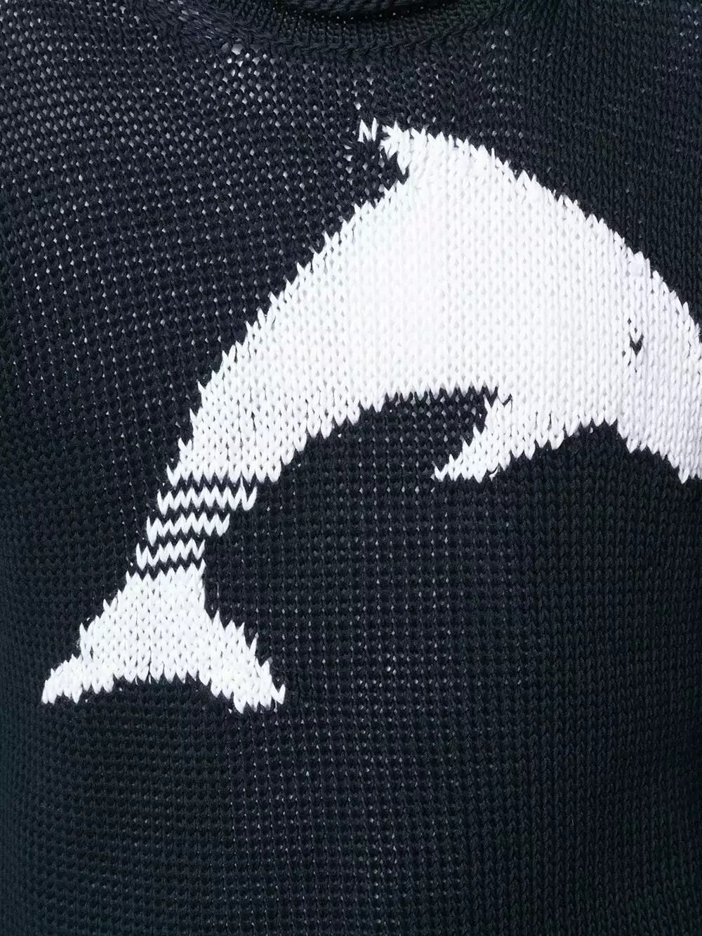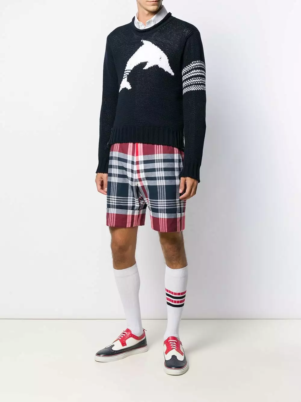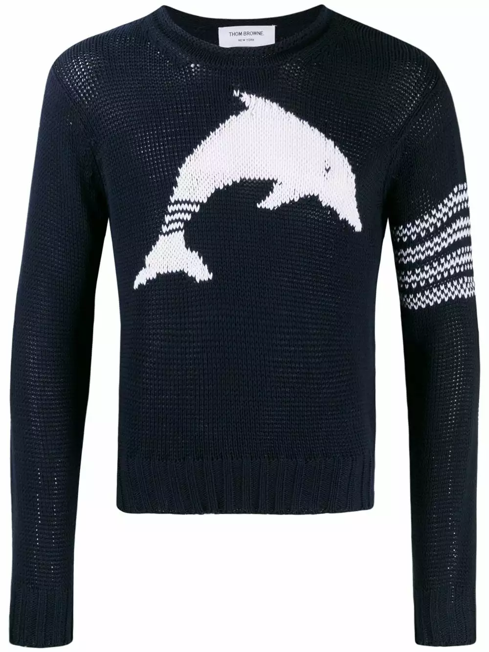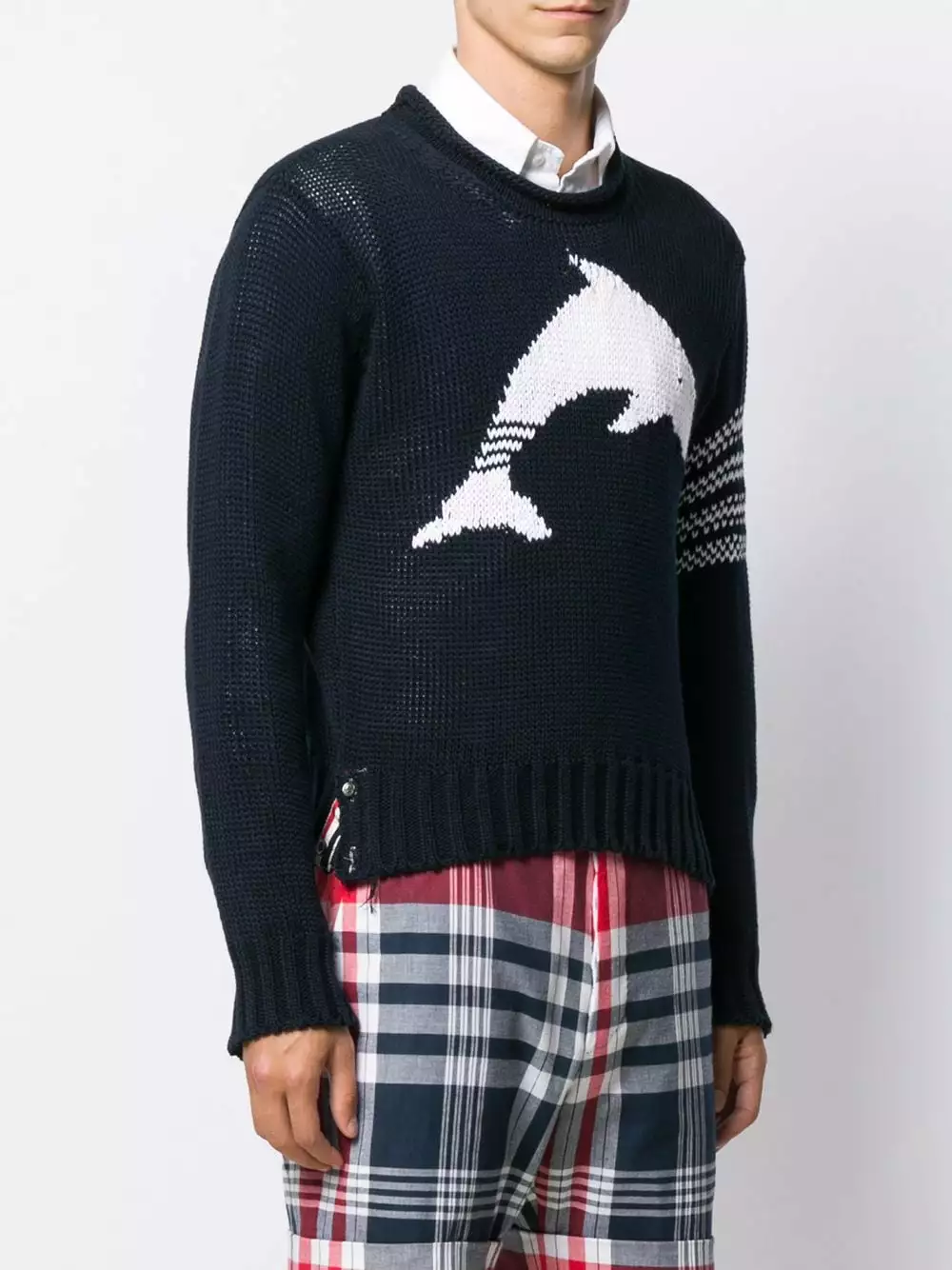 Looking for classic wardrobe pieces with a distinctive edge? Thom Browne will give you an easy route. Crafted from soft cotton, this crew neck jumper is detailed with an intarsia dolphin knit. Featuring a crew neck, long sleeves, a ribbed hem and cuffs, signature 4-Bar detailing and a dolphin motif to the chest.