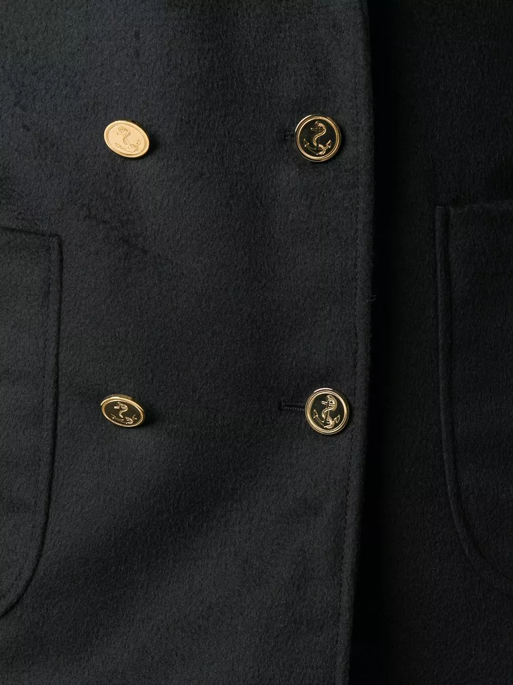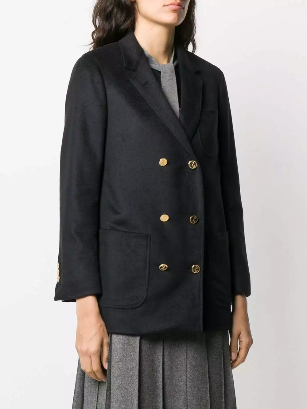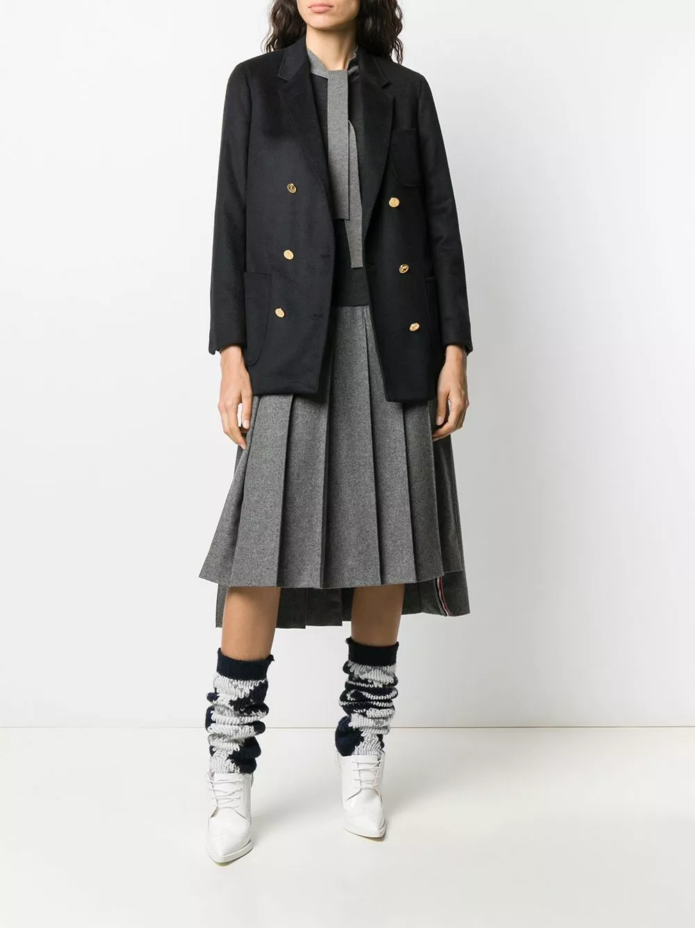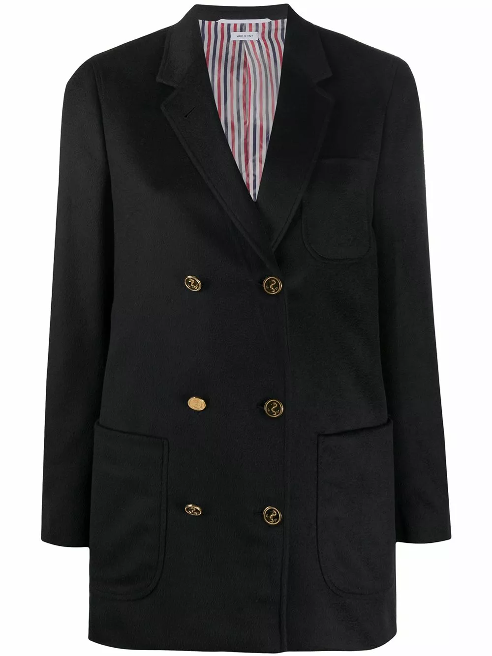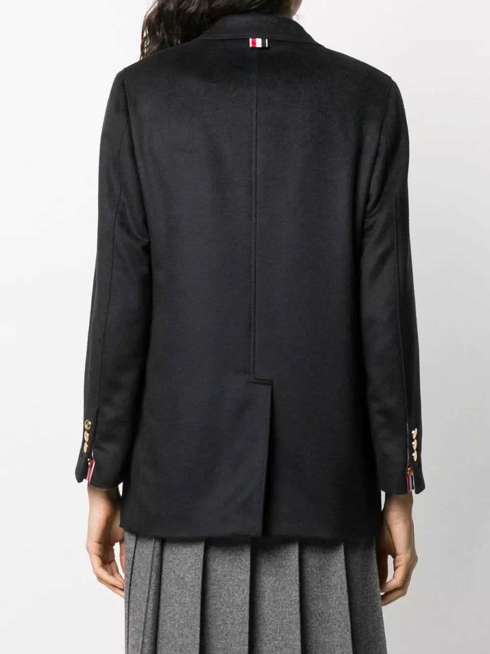 Own every room you walk into. How? By appearing in this double-breasted jacket from Thom Browne, of course. Featuring a collar style, a v-neck, patch pockets, a double breasted front fastening, cropped sleeves, button cuffs, a RWB tab and RWB details.