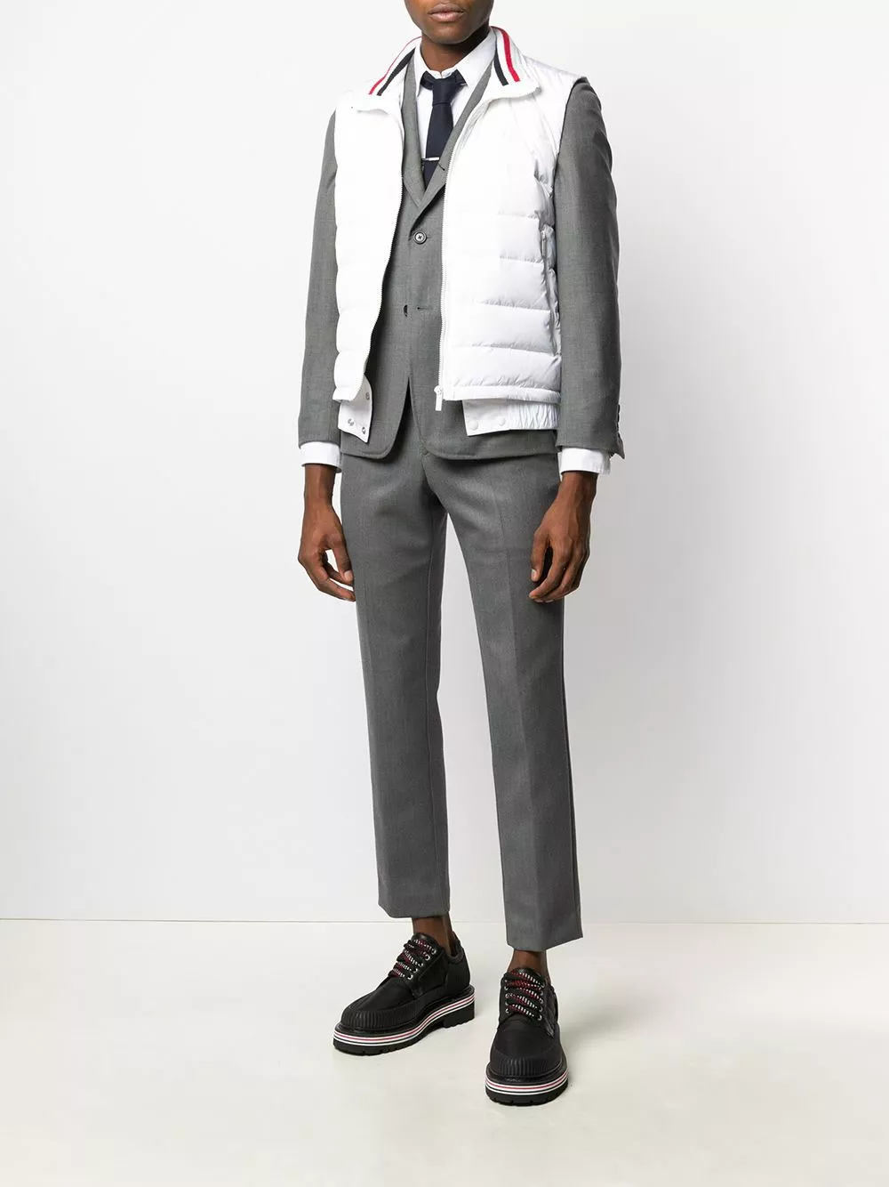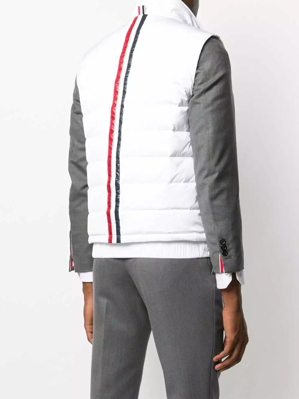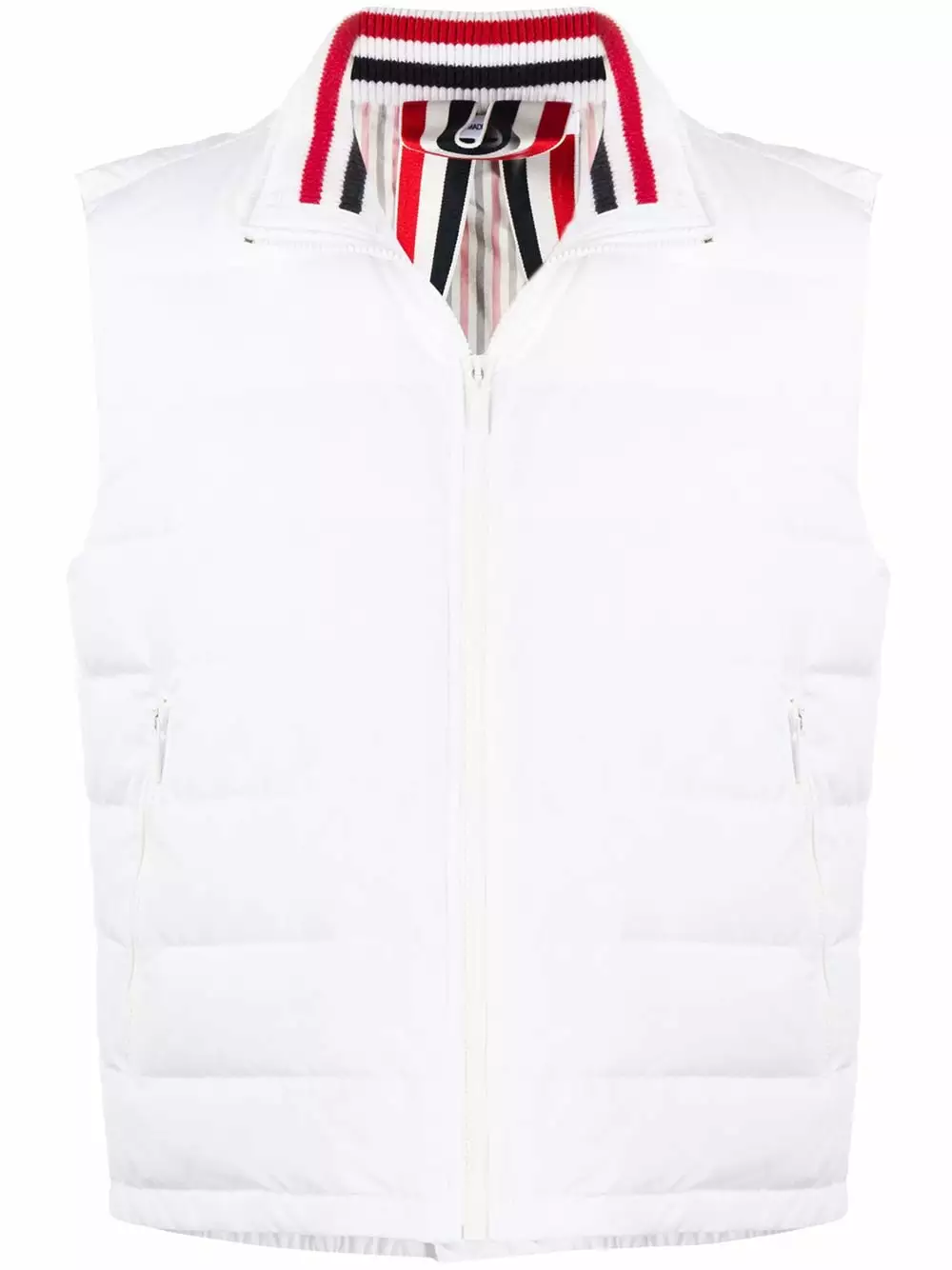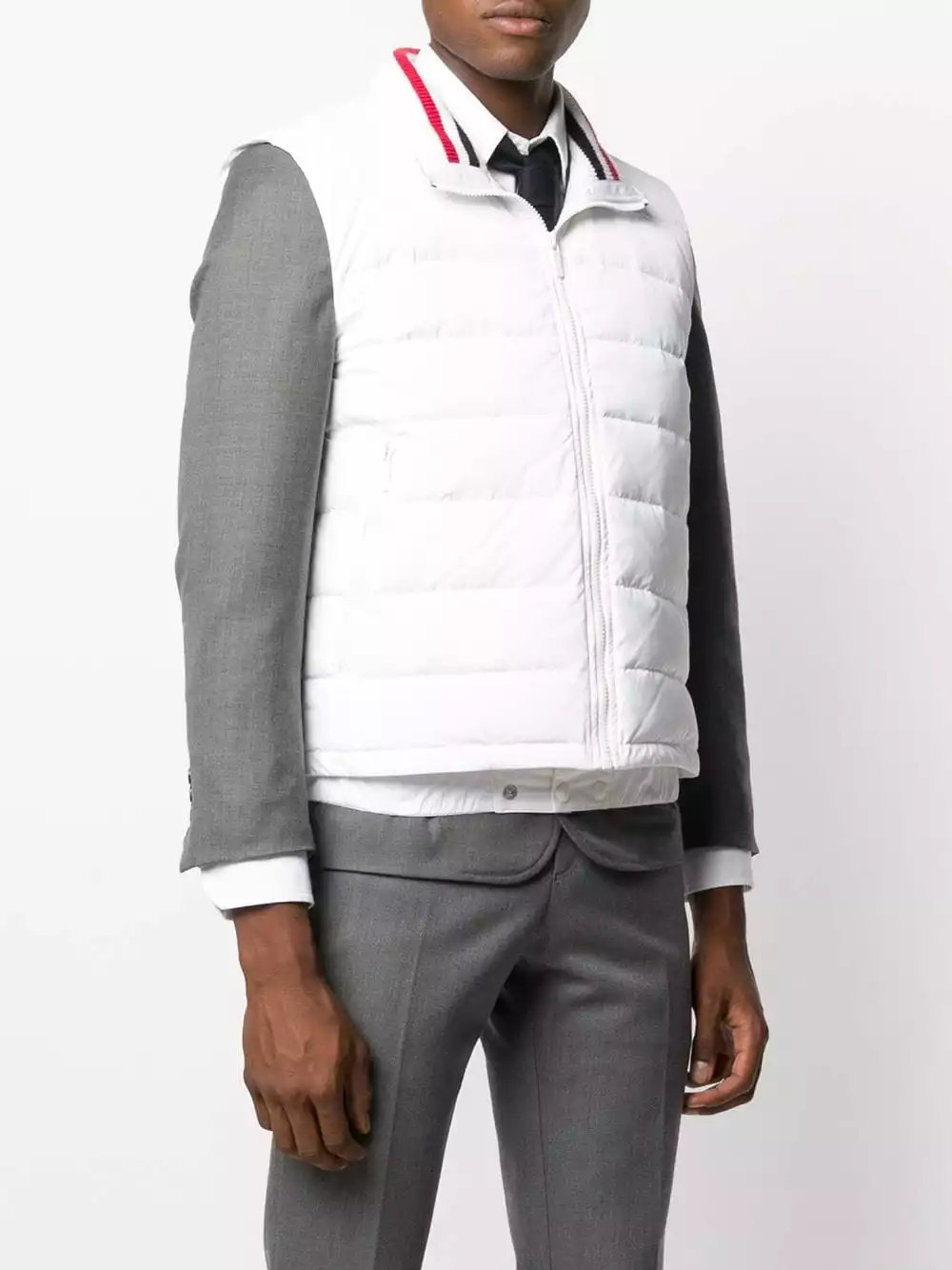 Keep warm in the coolest way possible, with this padded gilet from Thom Browne. The goose-down padding keeps you insulated, whilst the front zip fastening and rear tricolor detail add a practical yet fashion-forward element.