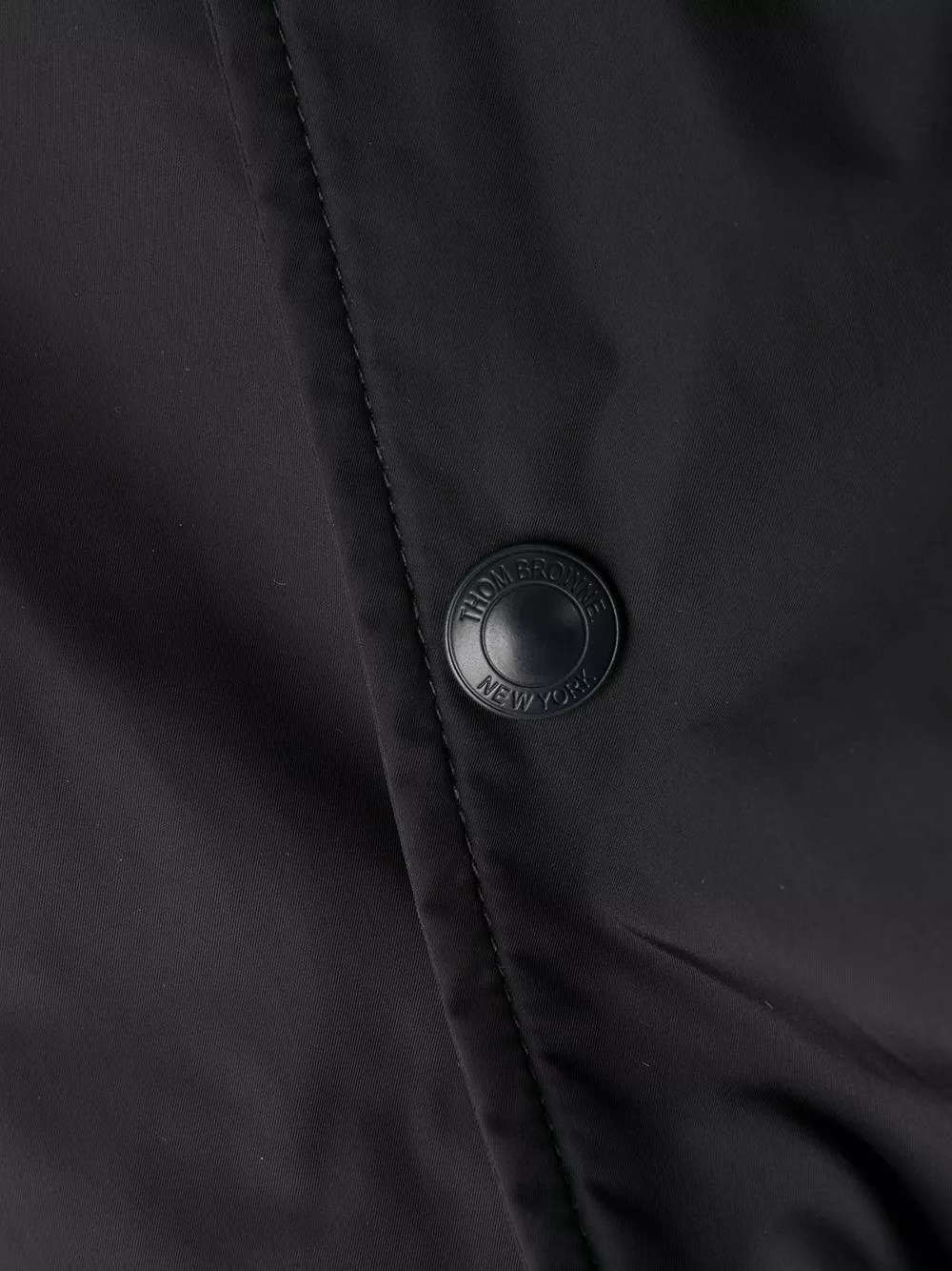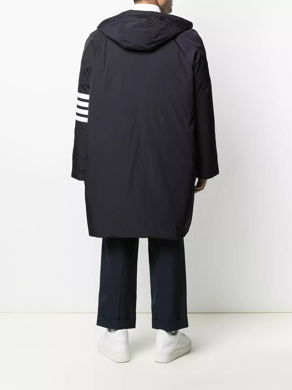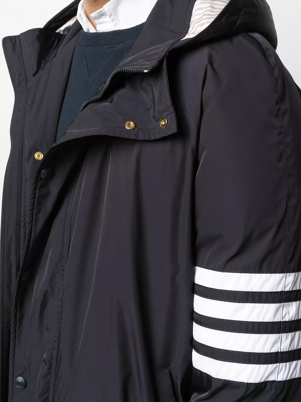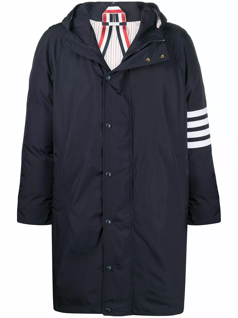 Beat the chill with Thom Browne’s hooded coat. Filled with insulating down feathers, you’ll be nice and warm. Wrap up.