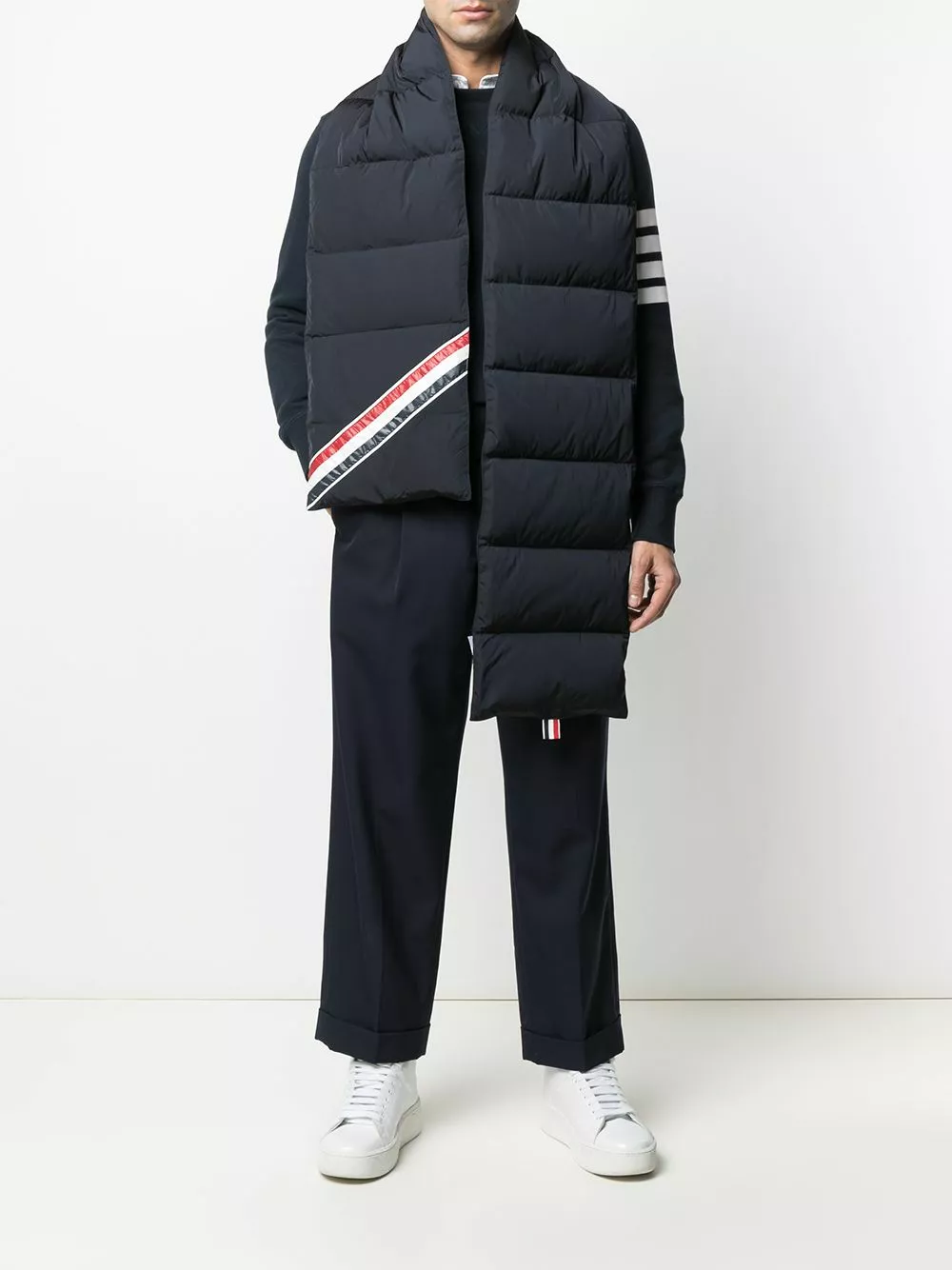 Cold days ahead? Master chilly mornings in style with this downfilled stripe Thom Browne scarf. Winter blues are a thing of the past.