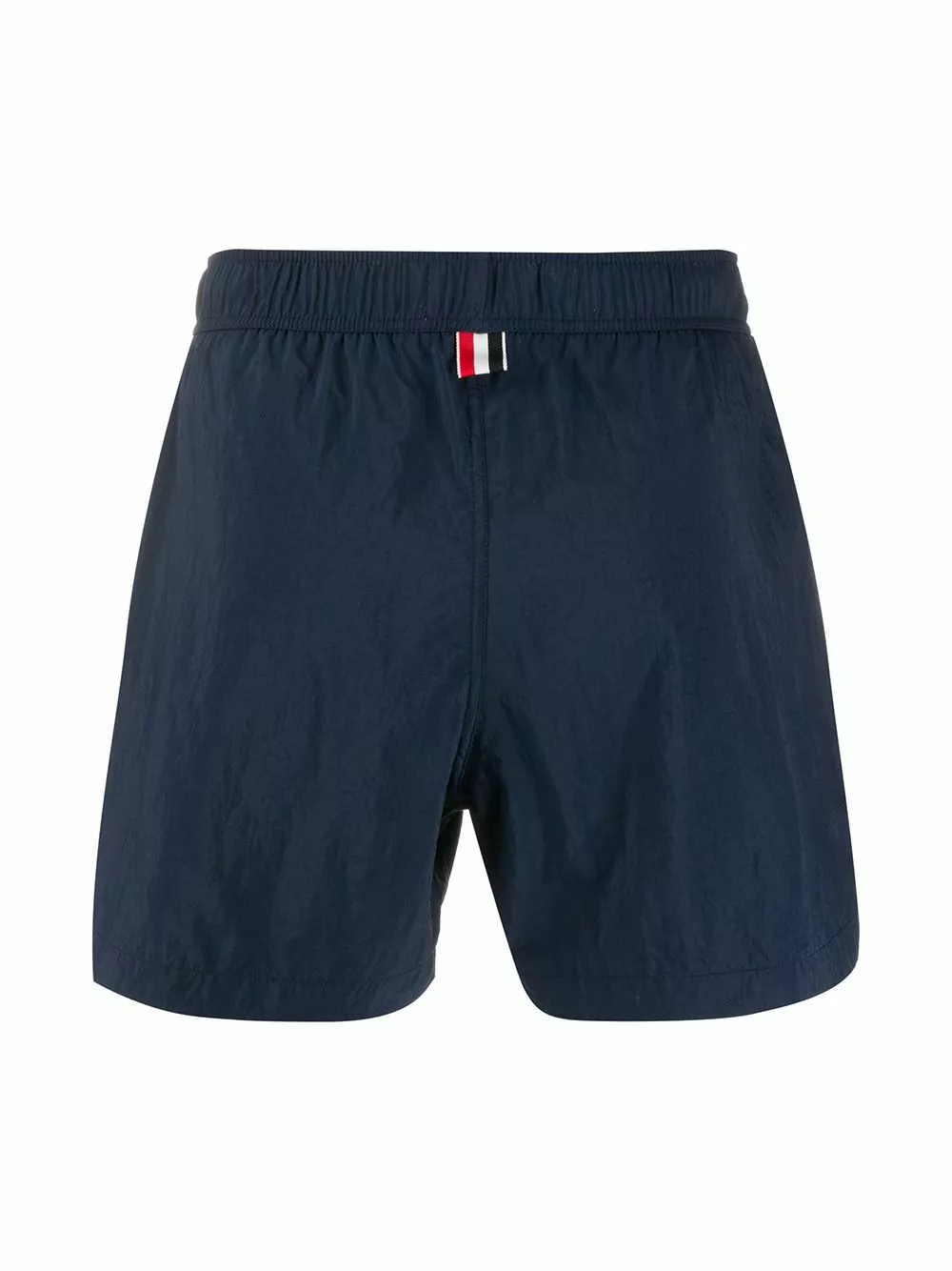 Navy drawstring waist swim shorts from THOM BROWNE featuring an elasticated drawstring waist and a front logo patch.