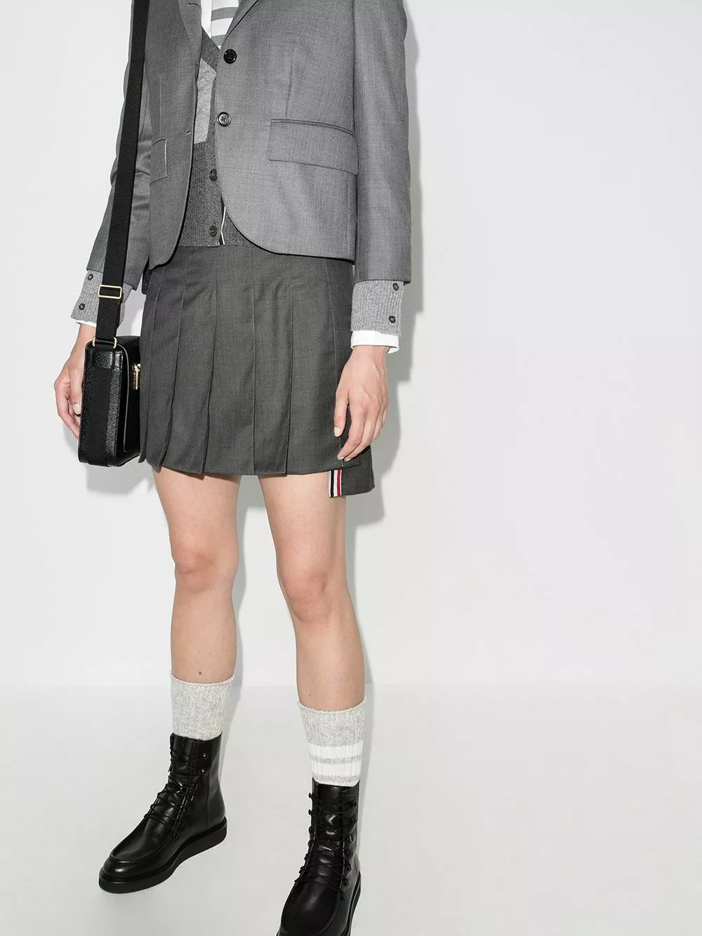 Missing your school uniforms? No worries, Thom Browne has got you. This dropped back mini pleated skirt adds a luxury twist to that nostalgia with its asymmetric design and RWB stripe. Straight A fashion. Featuring a pleated design, a high waist, a high low hem and signature RWB stripe detailing.