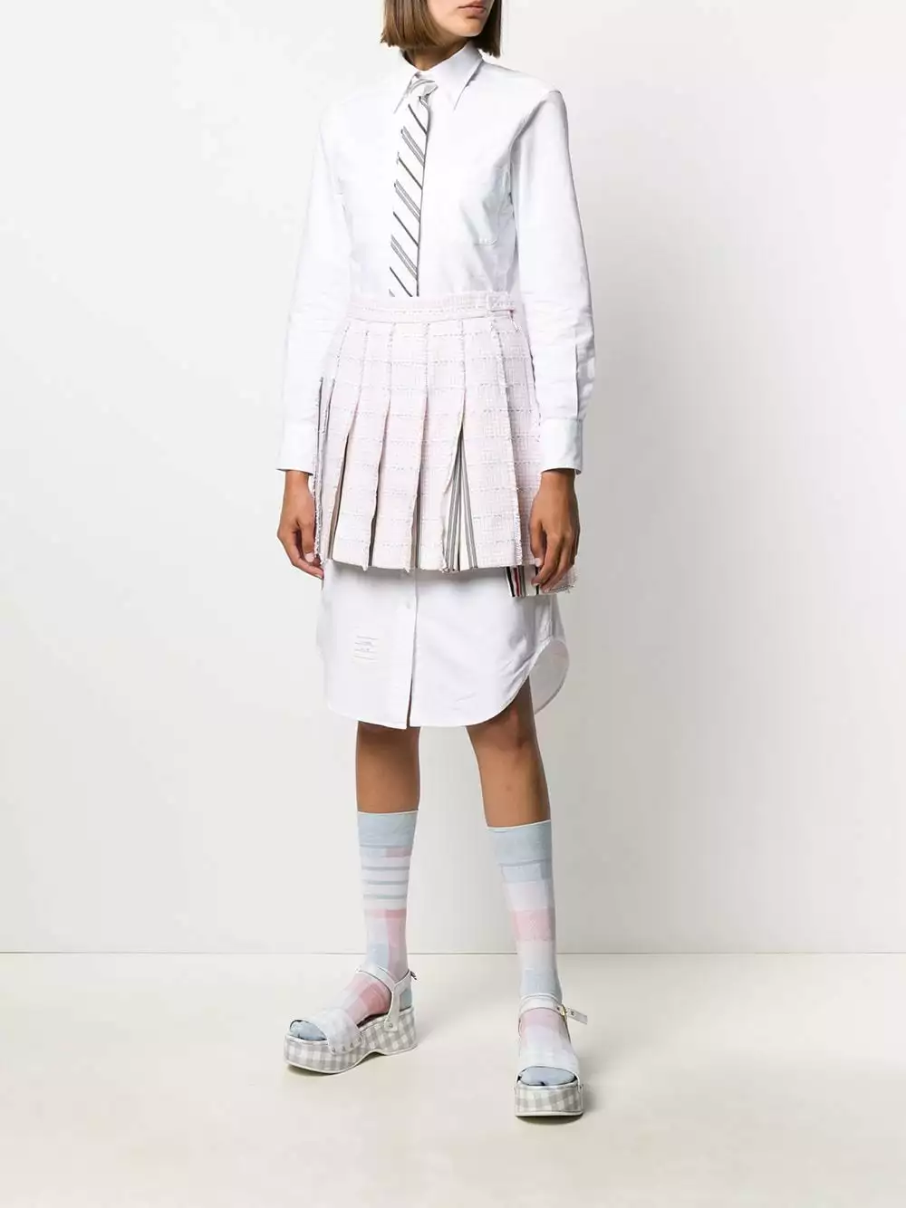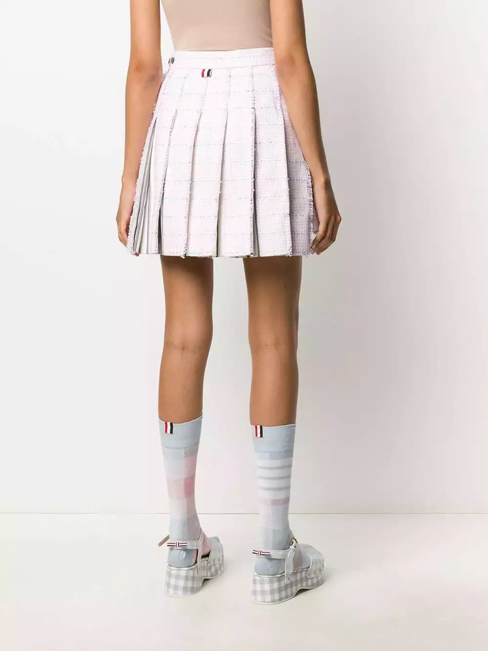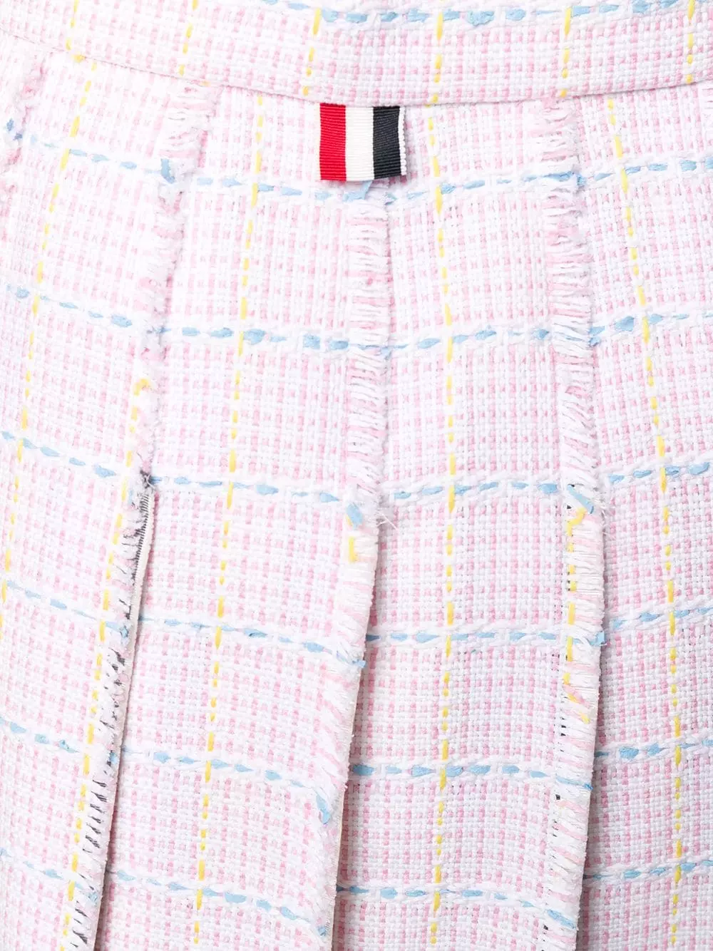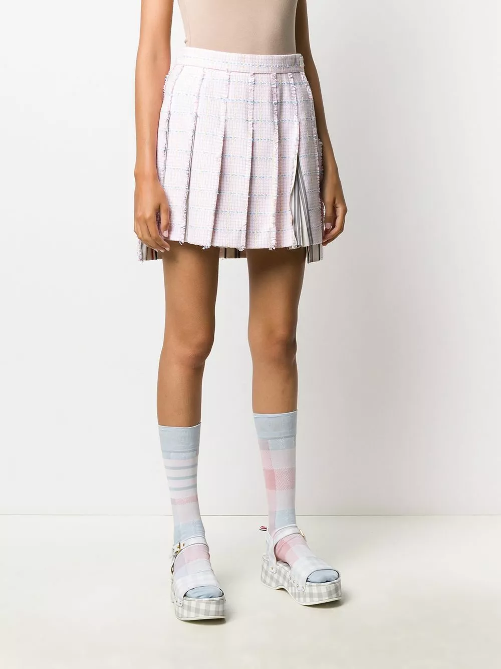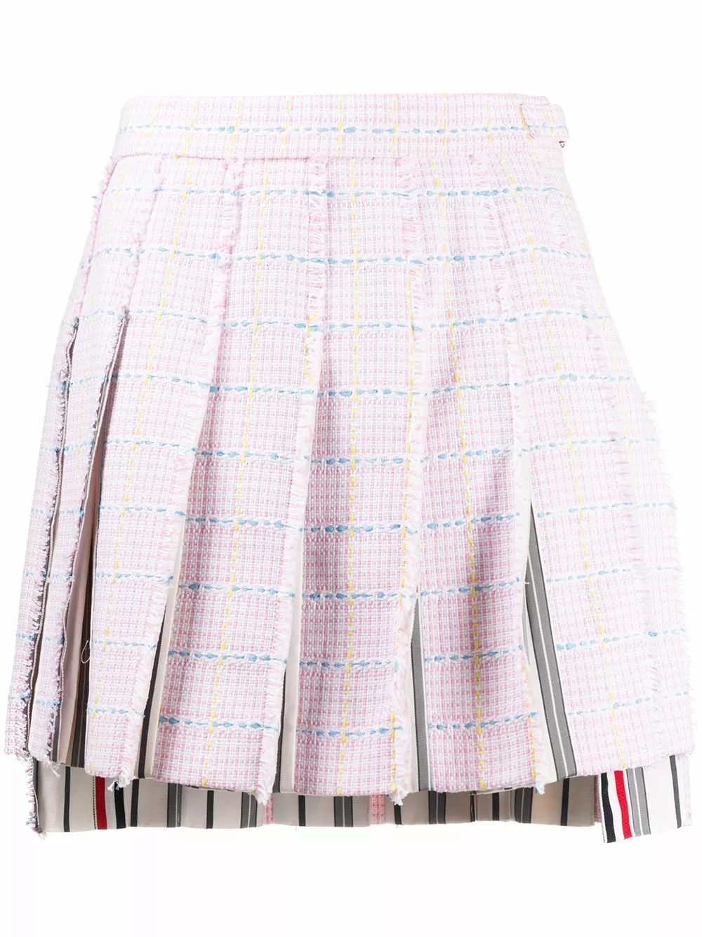 Show off your sweet side. This light pink, blue and yellow cotton-blend windowpane university check tweed pleated skirt from Thom Browne makes a charming choice. Short and sweet.