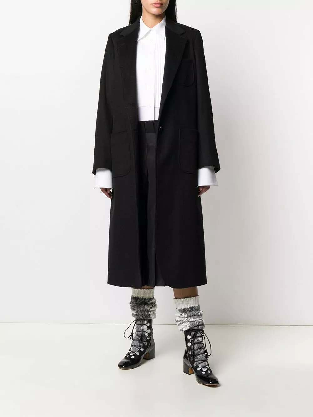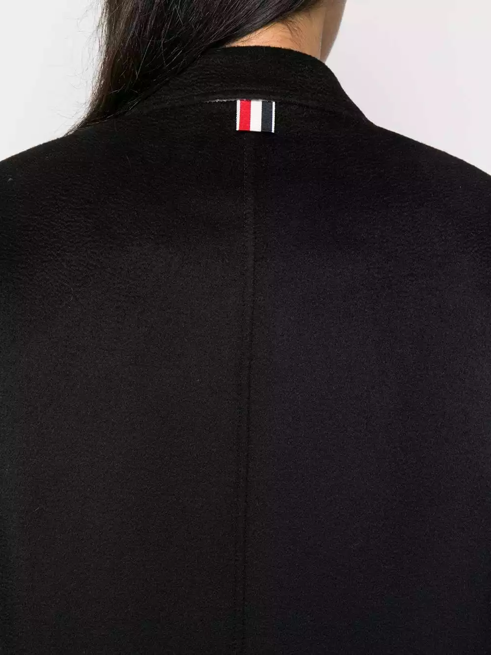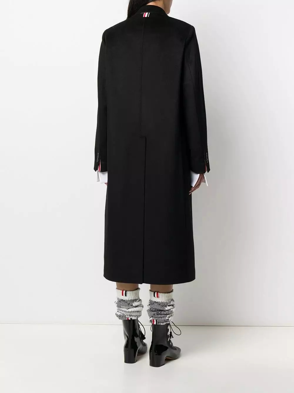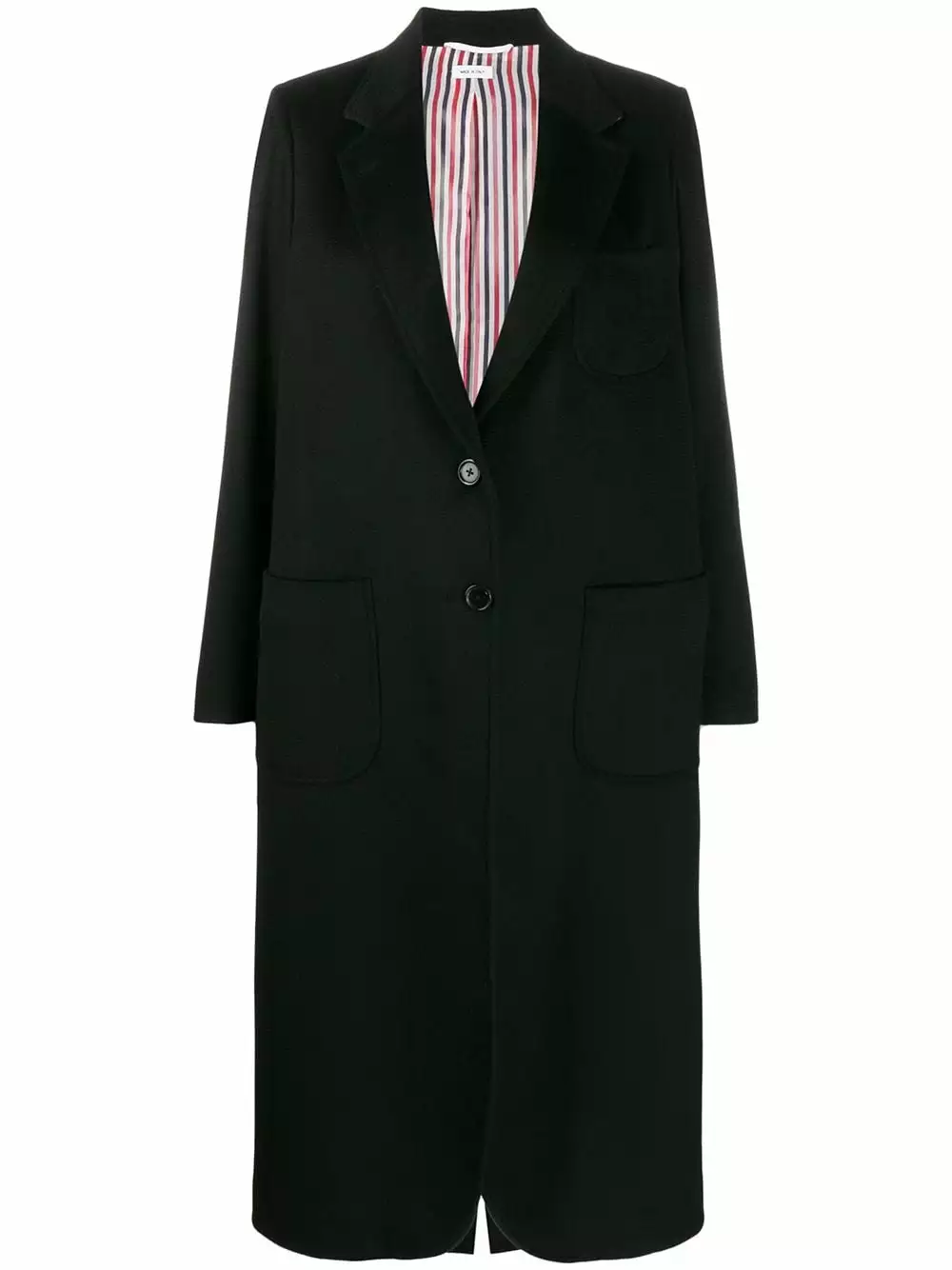 Don’t let the cold get you down. Thom Browne’s cashmere elongated sack coat is a triumph in sartorial convenience. Winter blues begone. Featuring notched lapels, a front button fastening, patch pockets, long sleeves, button cuffs, a rear central vent, a full lining and a signature tri-colour logo tab at the rear collar and sleeve cuffs.