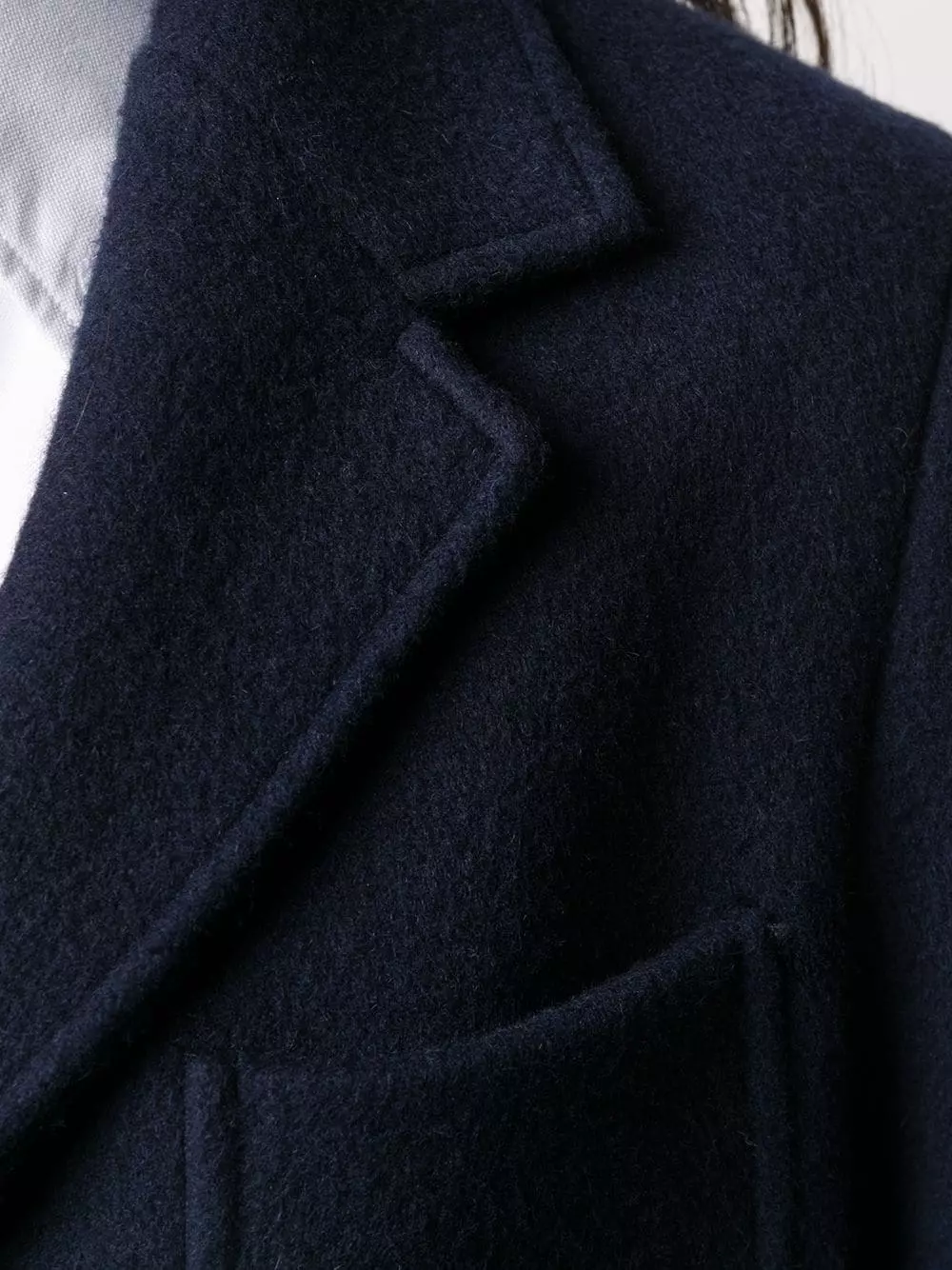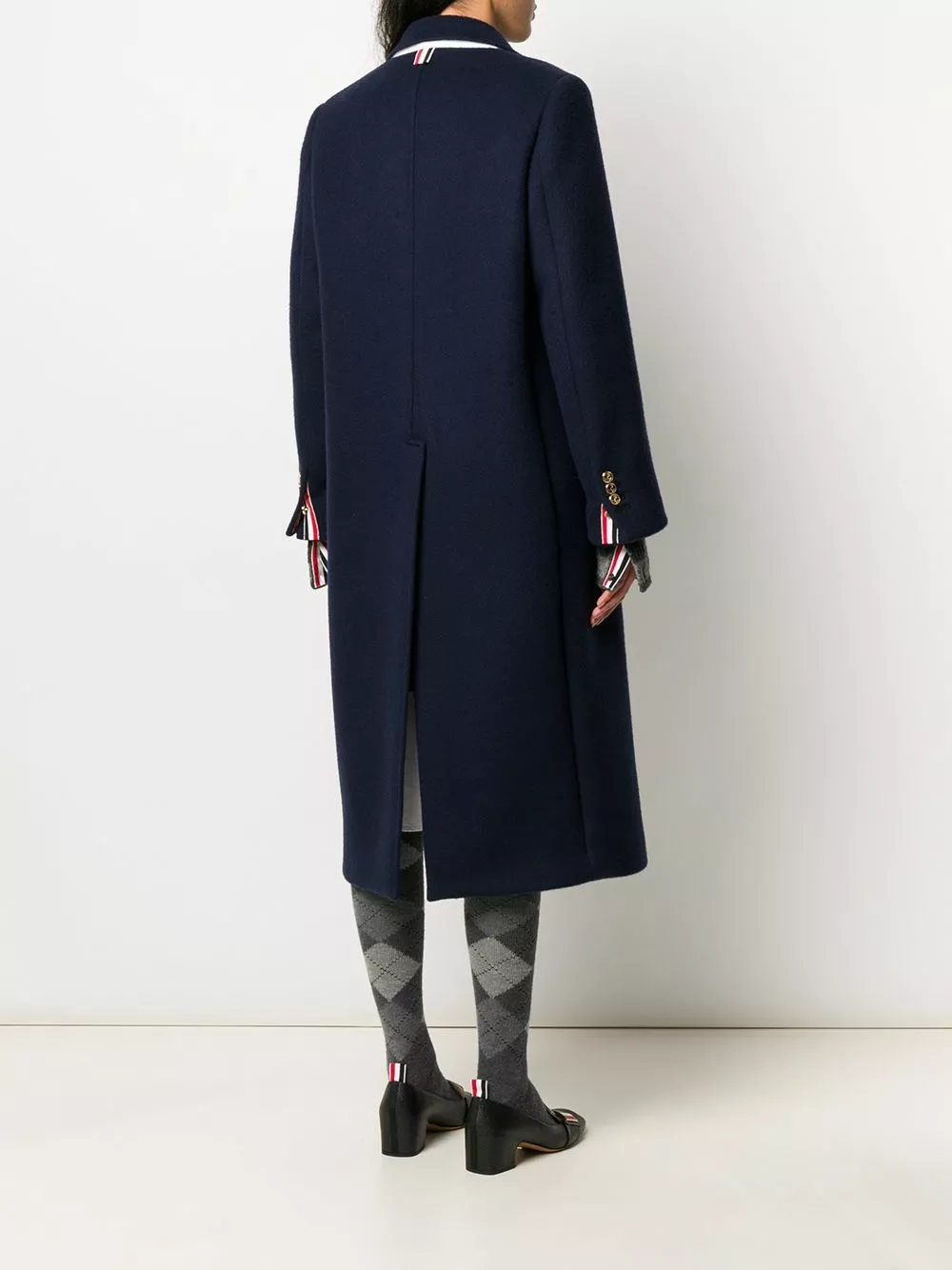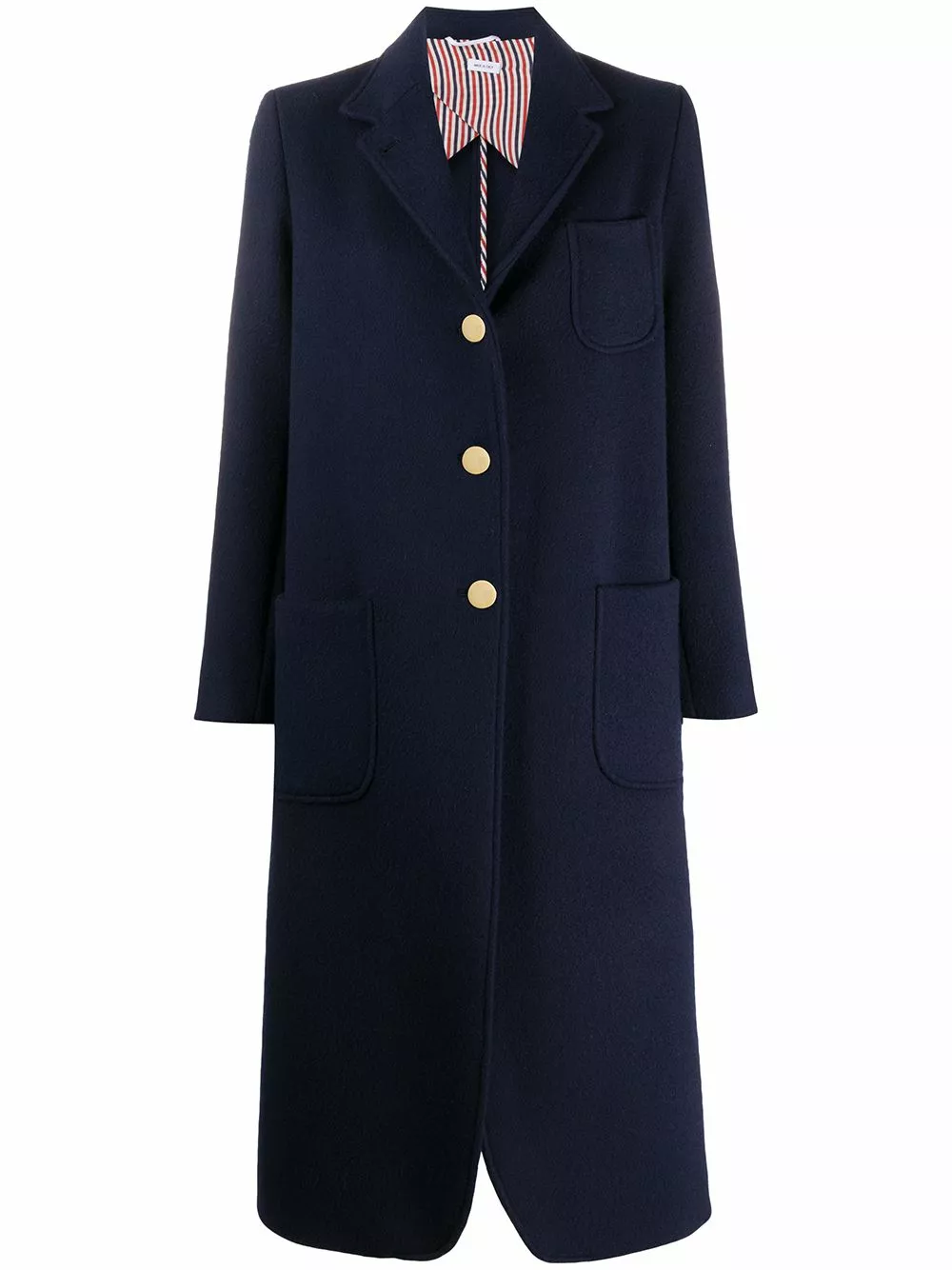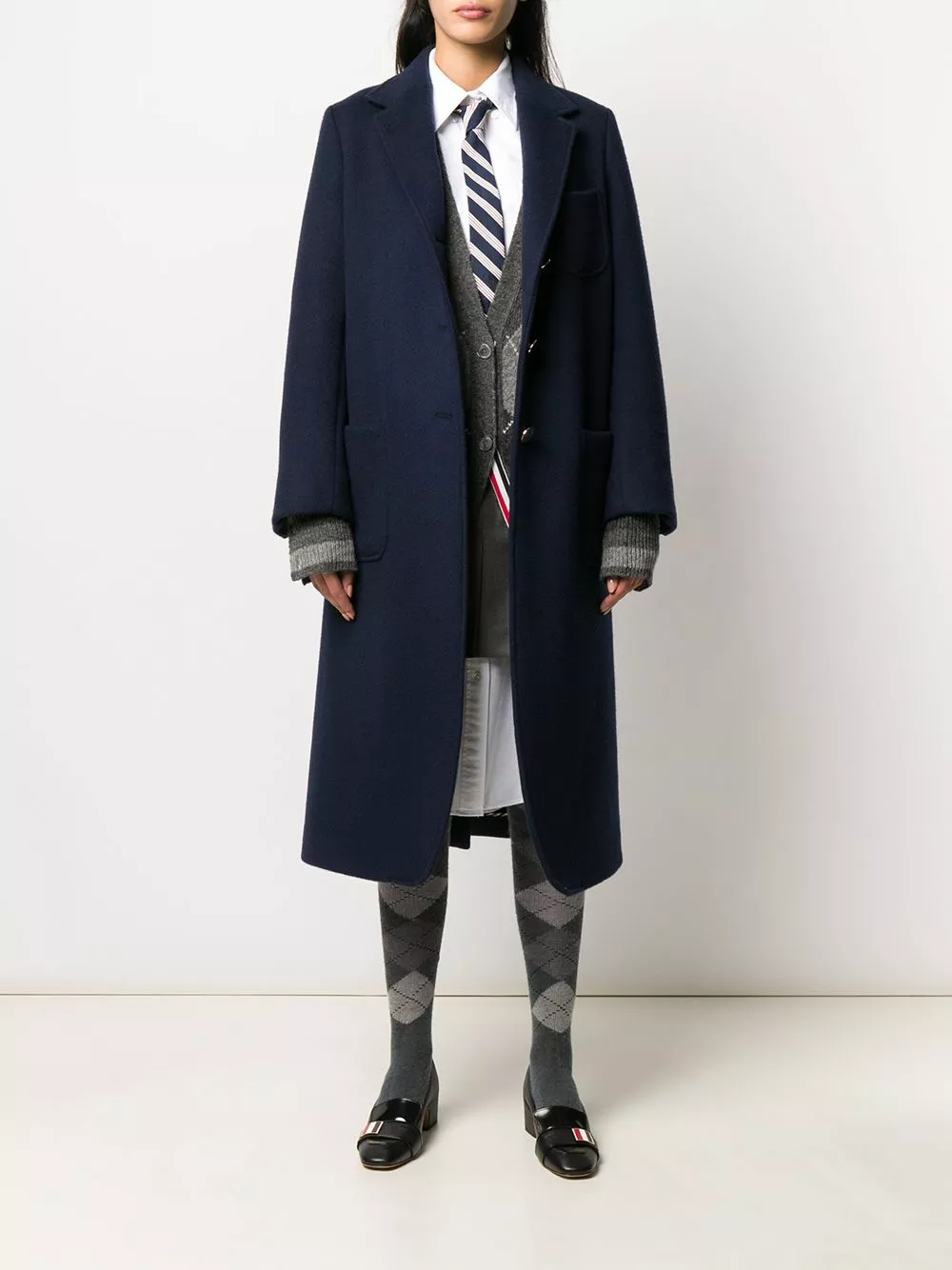 Take note, you can have anything you want in life if you dress for it. Made from navy cashmere, this unconstructed elongated sack overcoat in military weight cashmere from Thom Browne is a great example of that. Edith Head sure knew best. Featuring peaked lapels, a front button fastening, a chest pocket, two front pockets, long sleeves, button cuffs, a back slit at hem and a tricolour grosgrain tab on the rear.