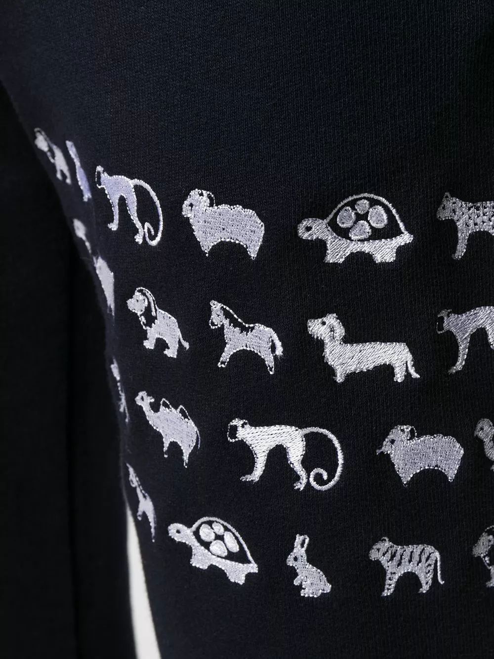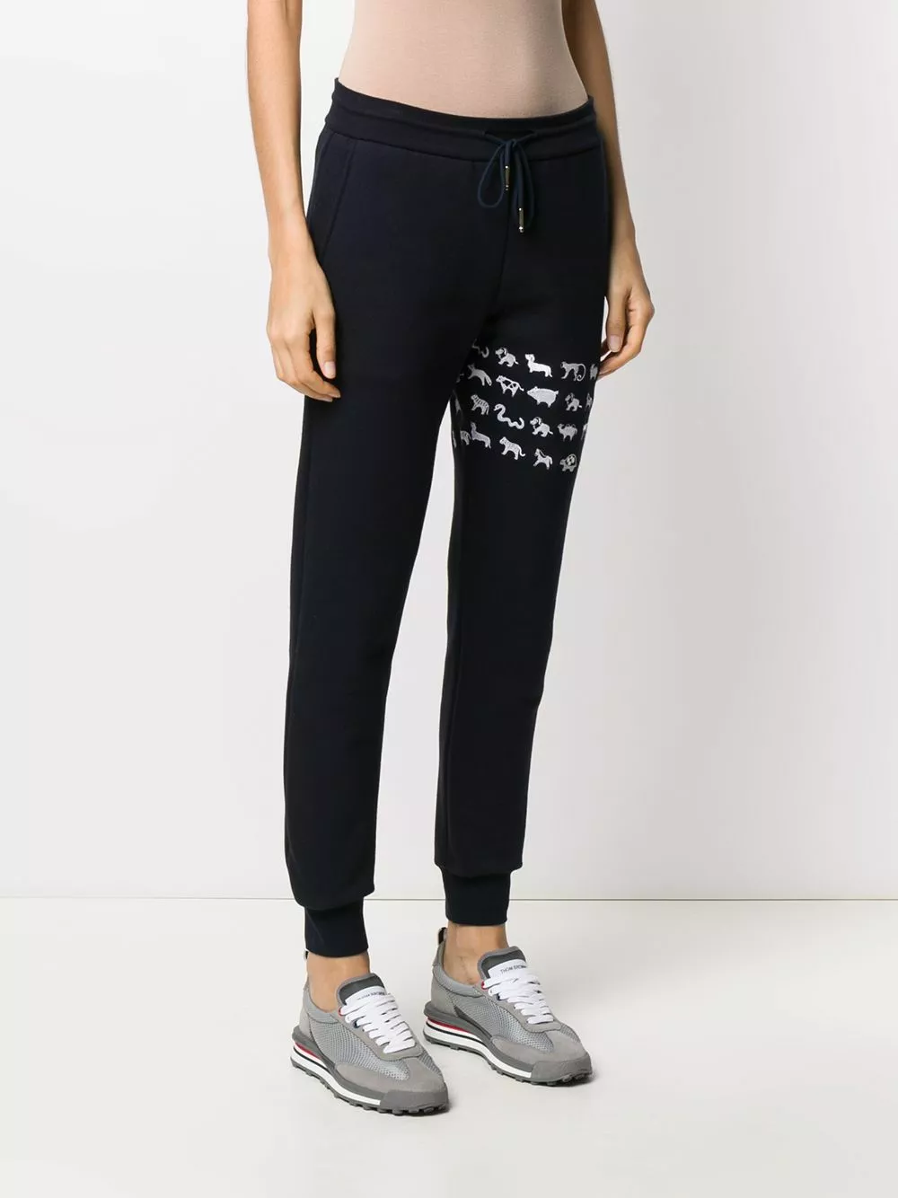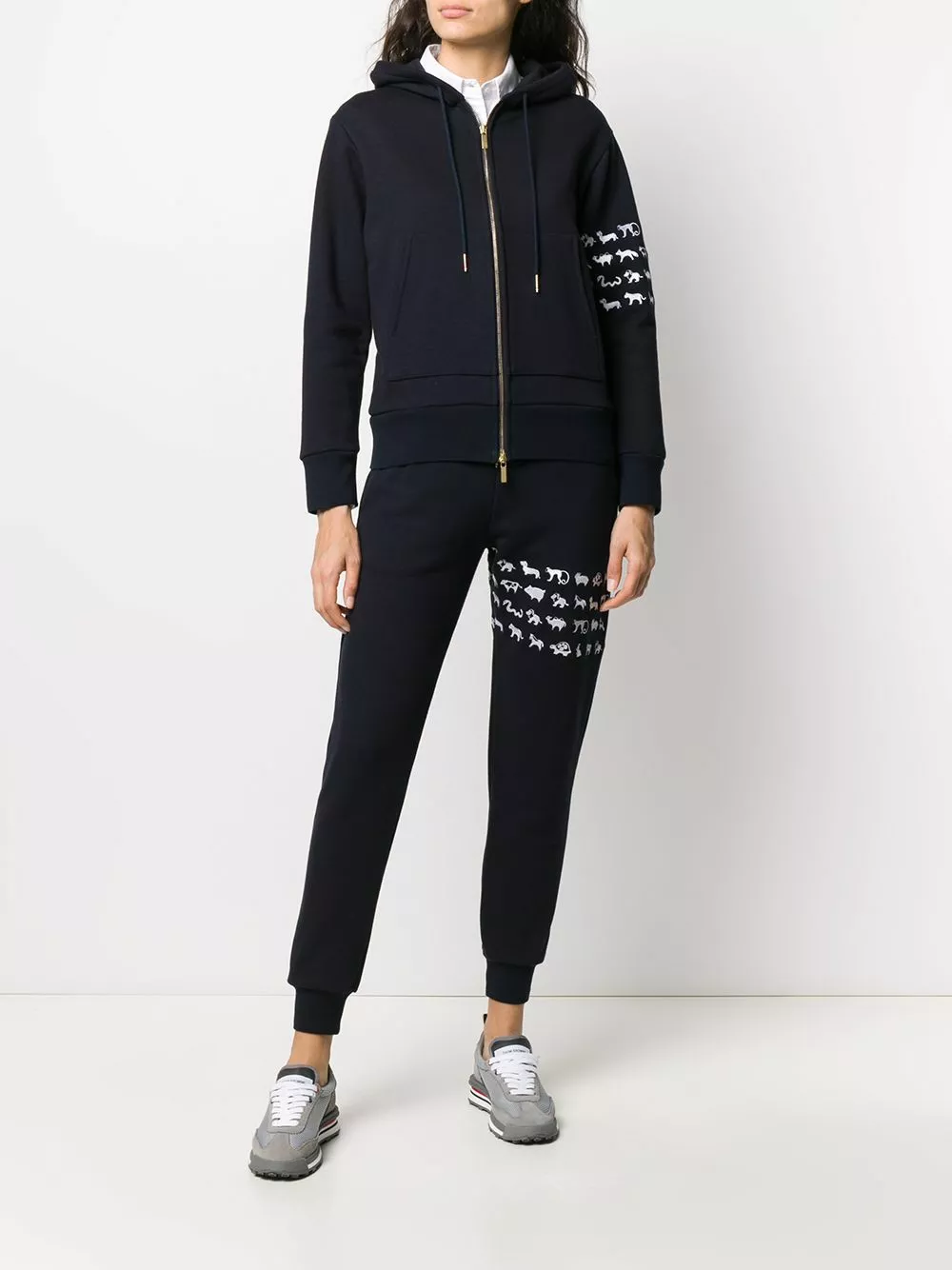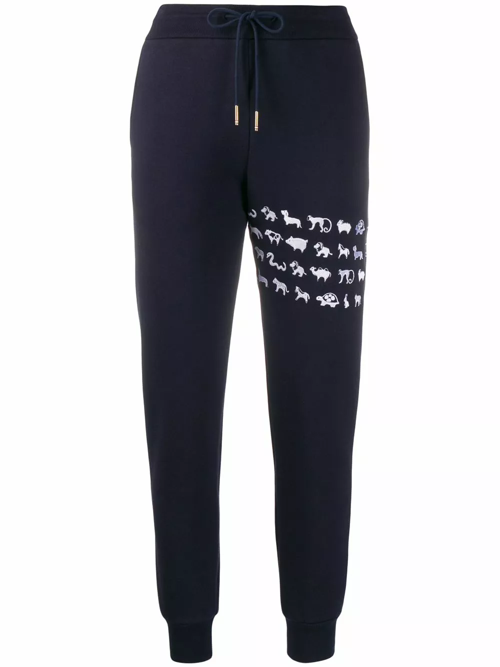 Add a touch of fun to your workout, with these Thom Browne track pants. Embroidered animal details make up the iconic 4-Bar stripe, for a look that is sure to help you hit a personal best when it comes to style. Make the gym your catwalk. Featuring an elasticated drawstring waist, a slim fit, a cropped length, a RWB tab, a 4-Bar stripe, embroidered animal details and cuffed ankles.
