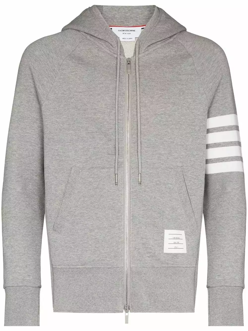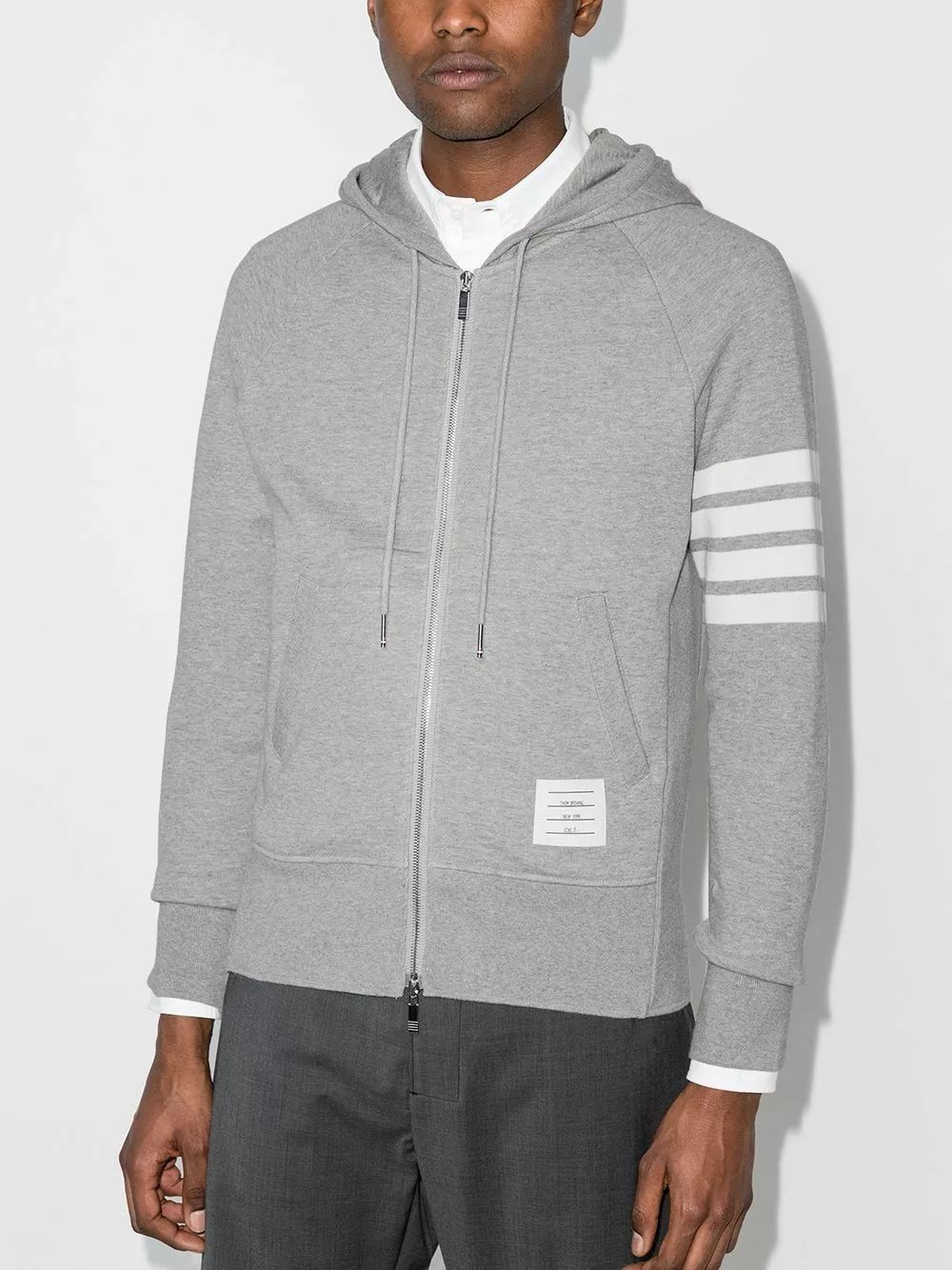 Going for a jogging at the park? Make sure you’ll be at your best with this comfy light Grey cotton Engineered 4-Bar Zip-Up Jersey Hoodie from Thom Browne. Designed with the iconic stripe detail to the sleeve, this piece won’t let you get unnoticed. Good job! Featuring a drawstring hood, a front zip fastening, long sleeves, two front pockets, a front logo patch and white stripes on the left sleeve. This item is true to fit.