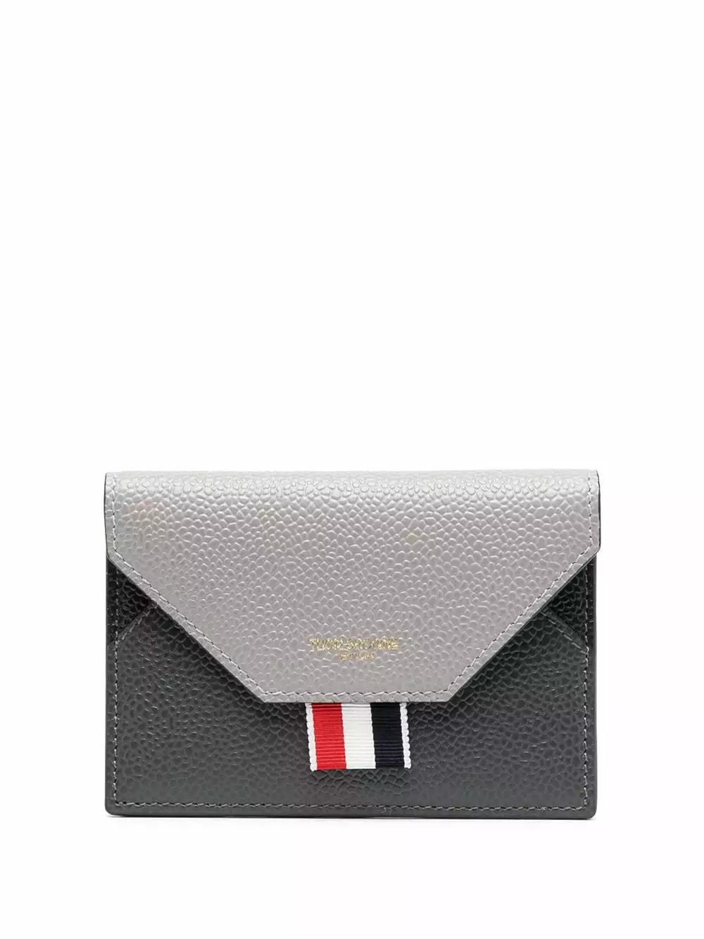Small but mighty. Thiscalf leather envelope cardholder from Thom Browne will keep your favourites cards rigth where they need to be. Safe and sound. Featuring a front embossed logo stamp, a foldover top, a snap fastening, multiple interior card slots, a two tone design and Rwb stripe detail.