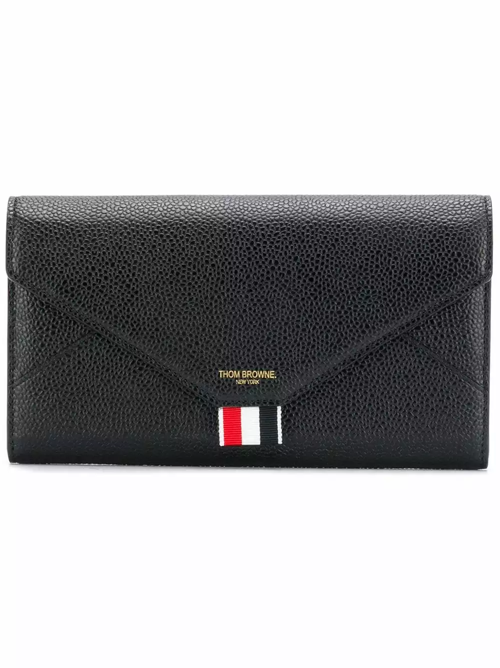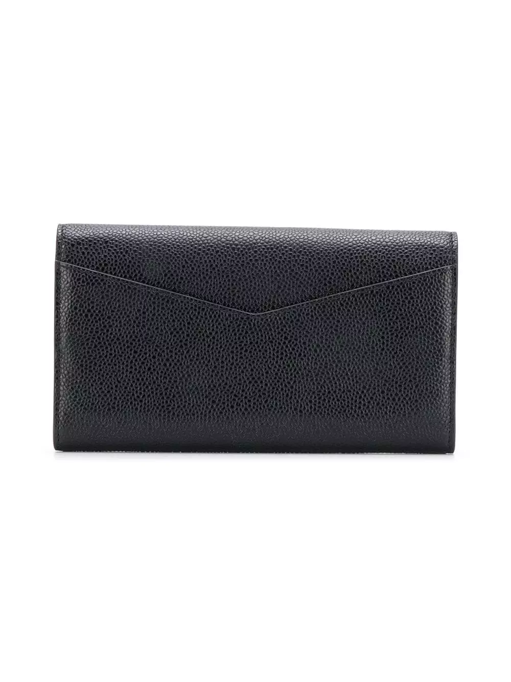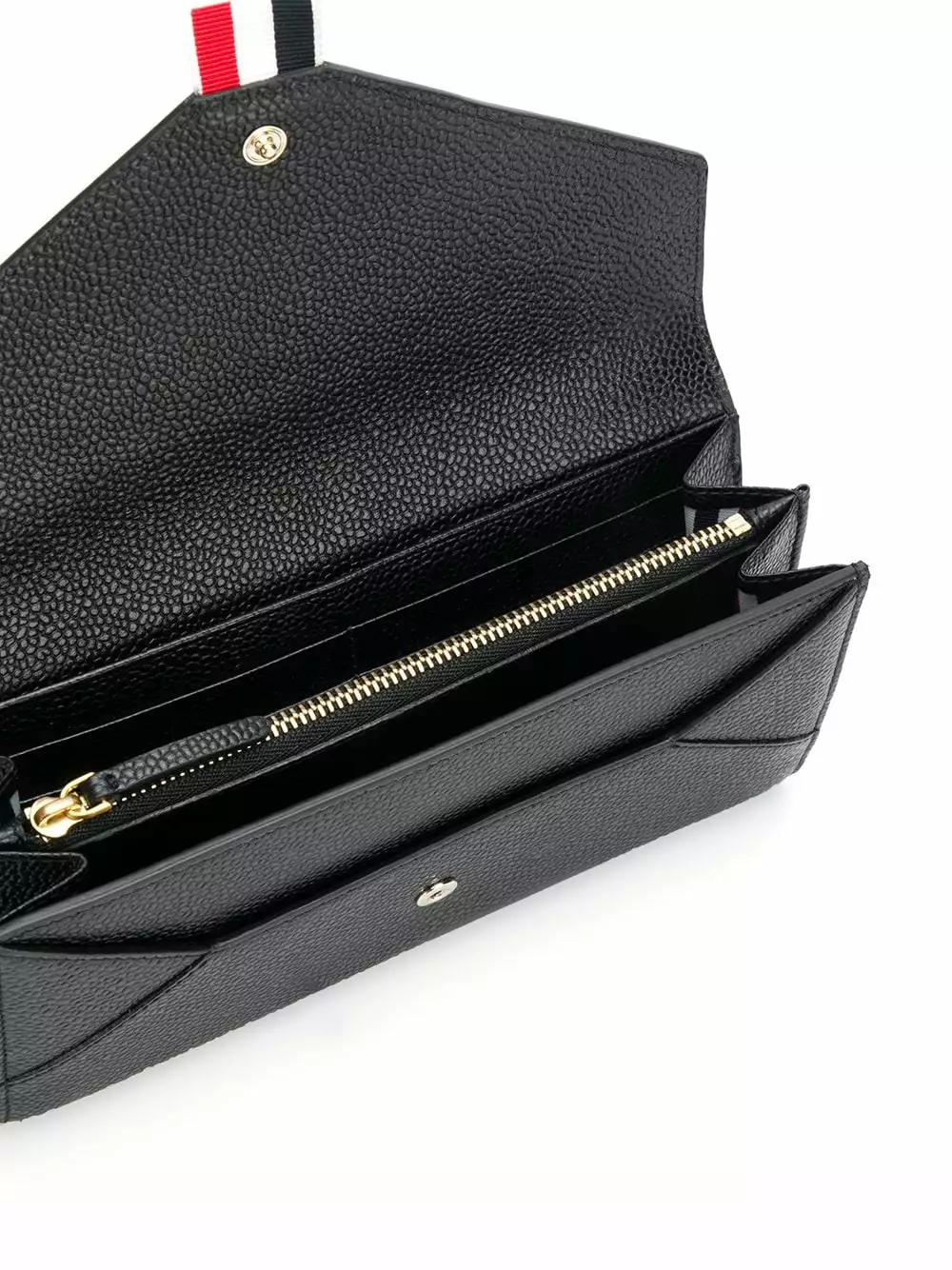 Black leather Envelope Continental Wallet from Thom Browne featuring a front embossed logo stamp, a signature tri-colour striped trim, a back slip pocket, a foldover top with snap closure, internal slip pockets and a zipped coin pouch.