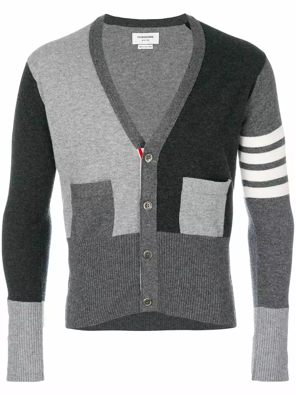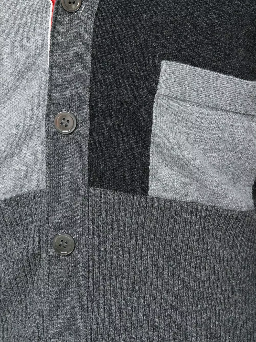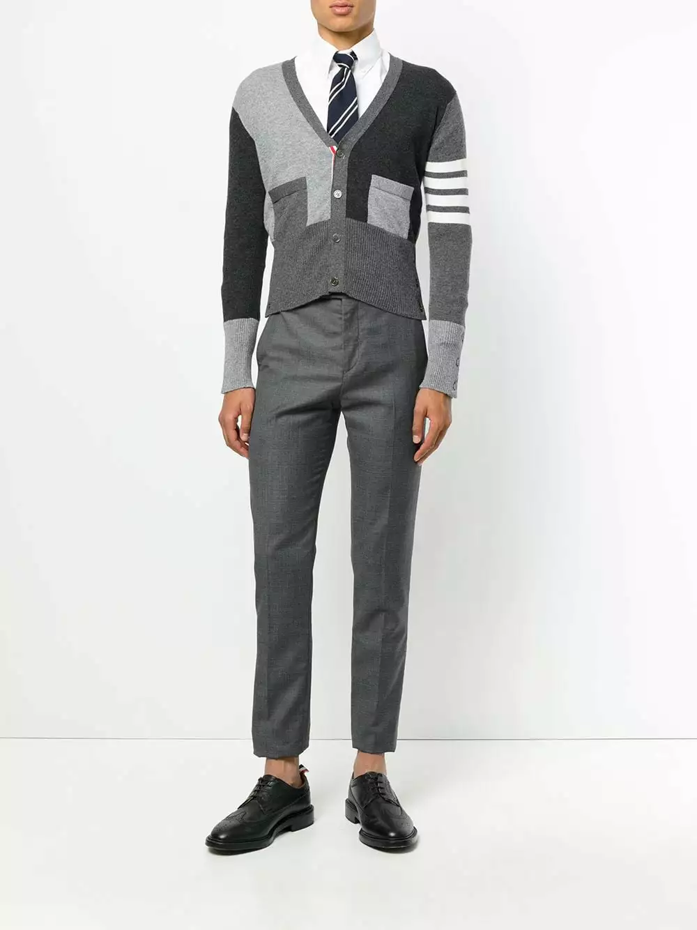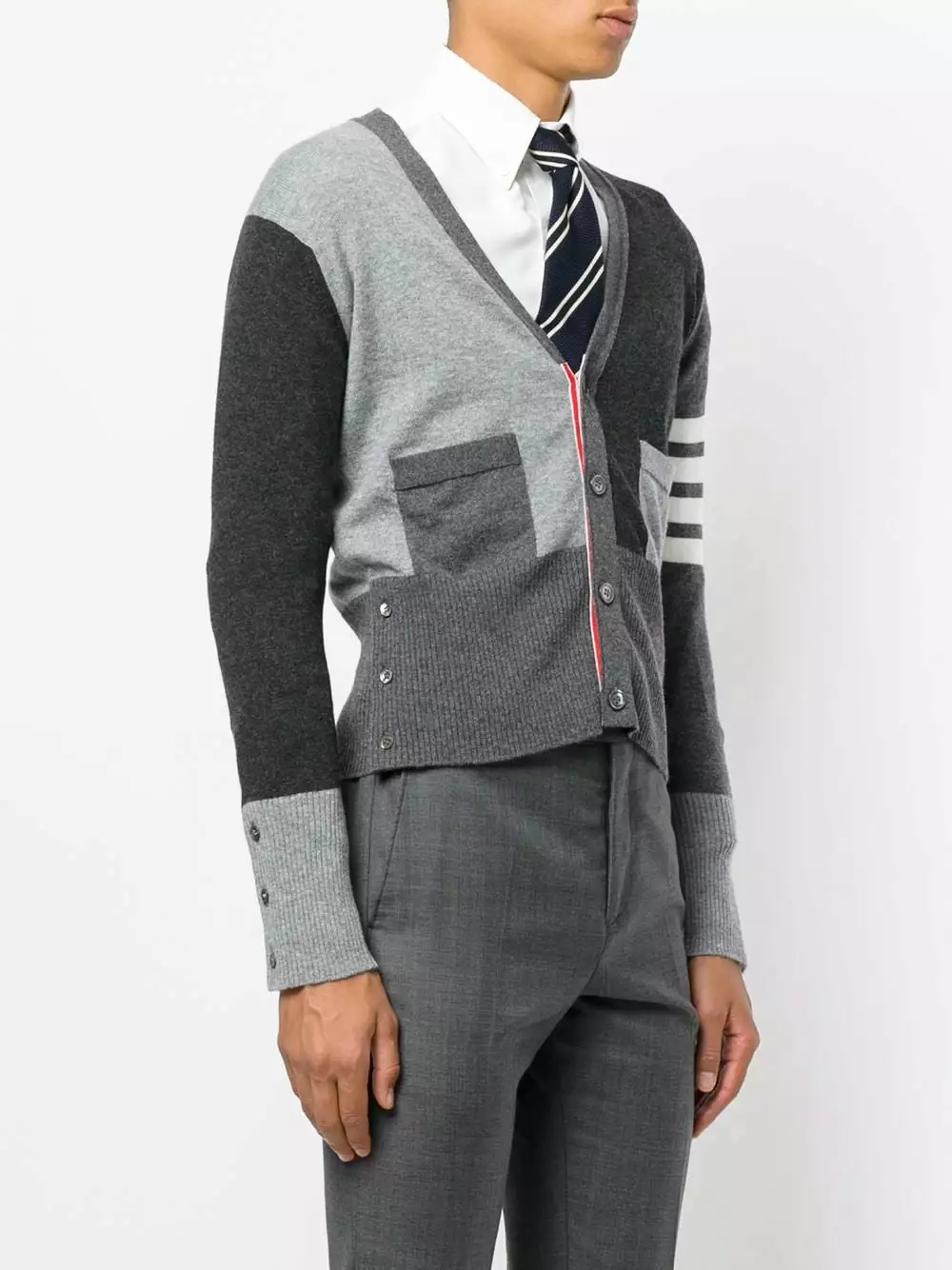 Grey cashmere fitted waist v-neck cardigan from Thom Browne.
