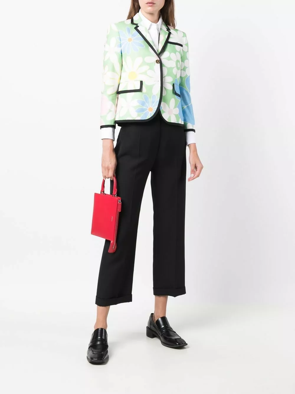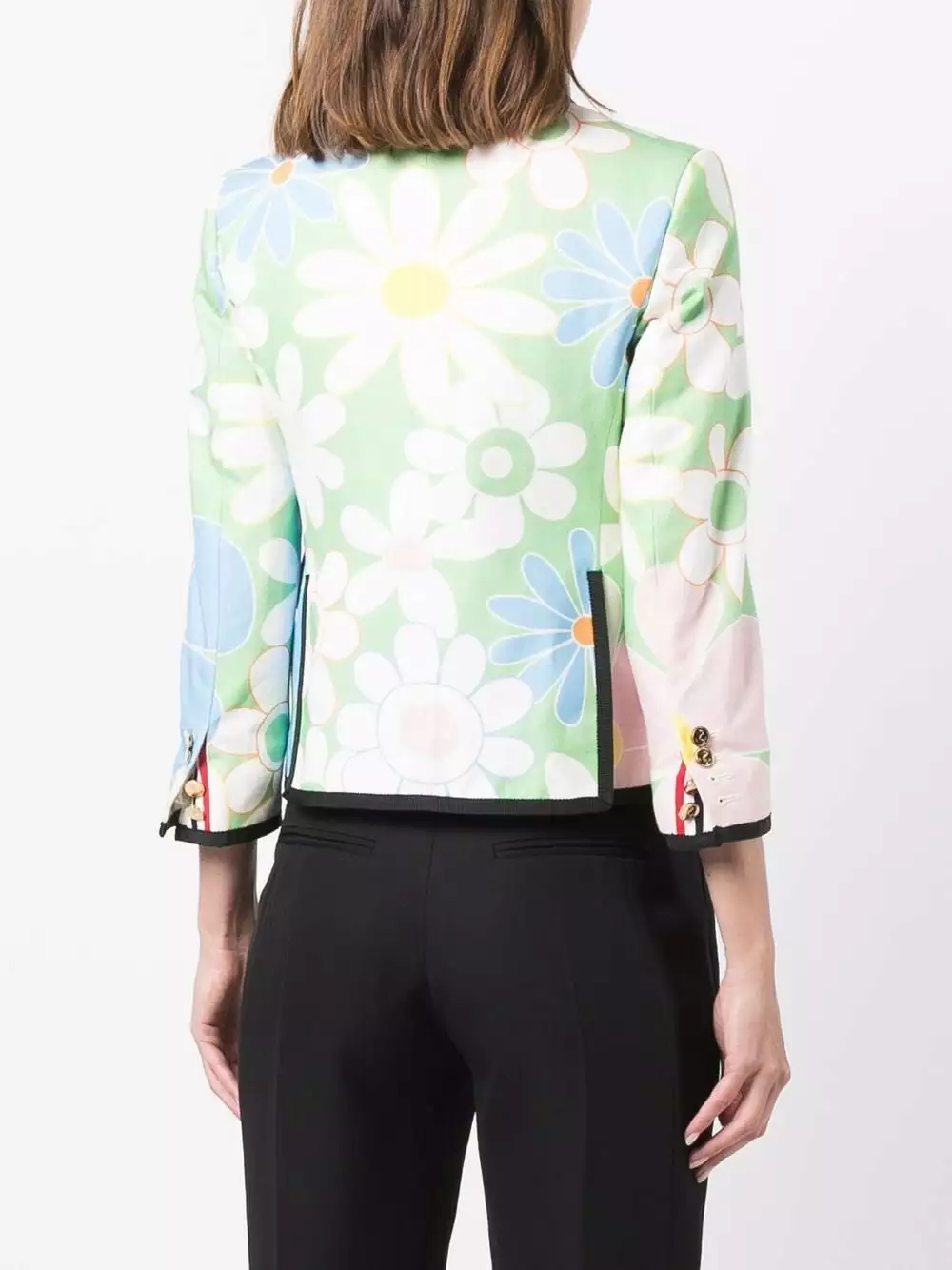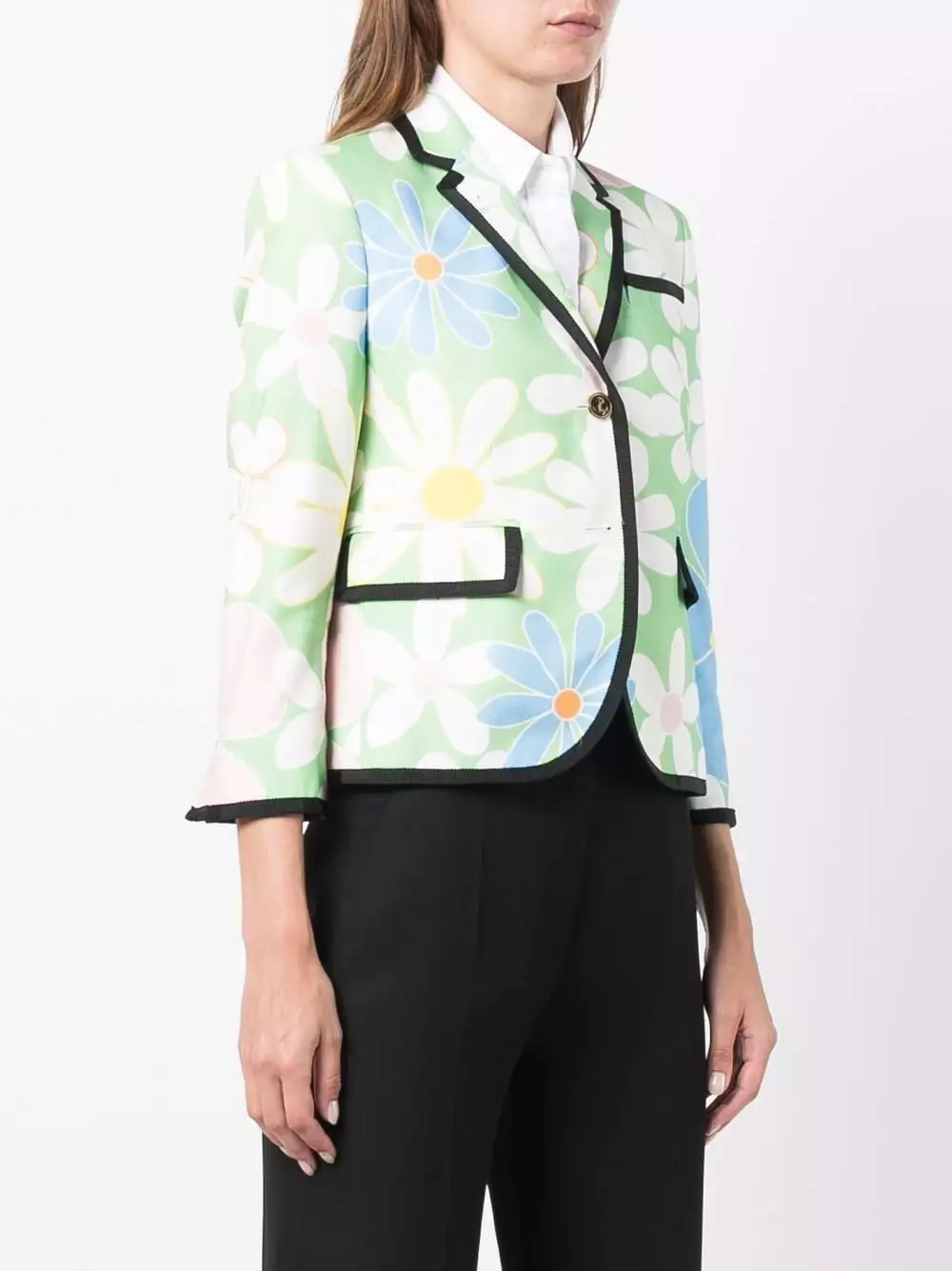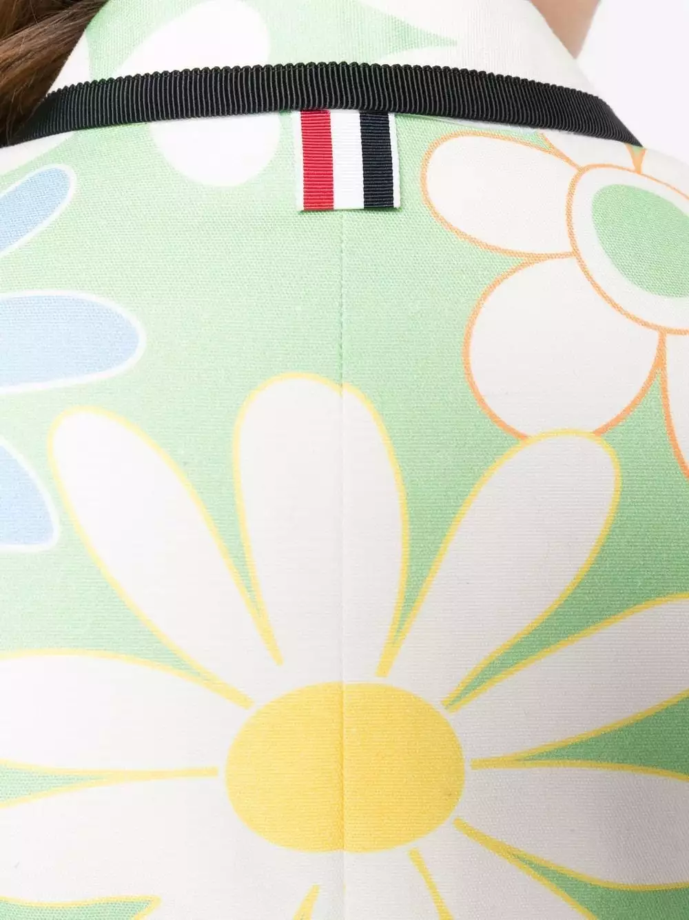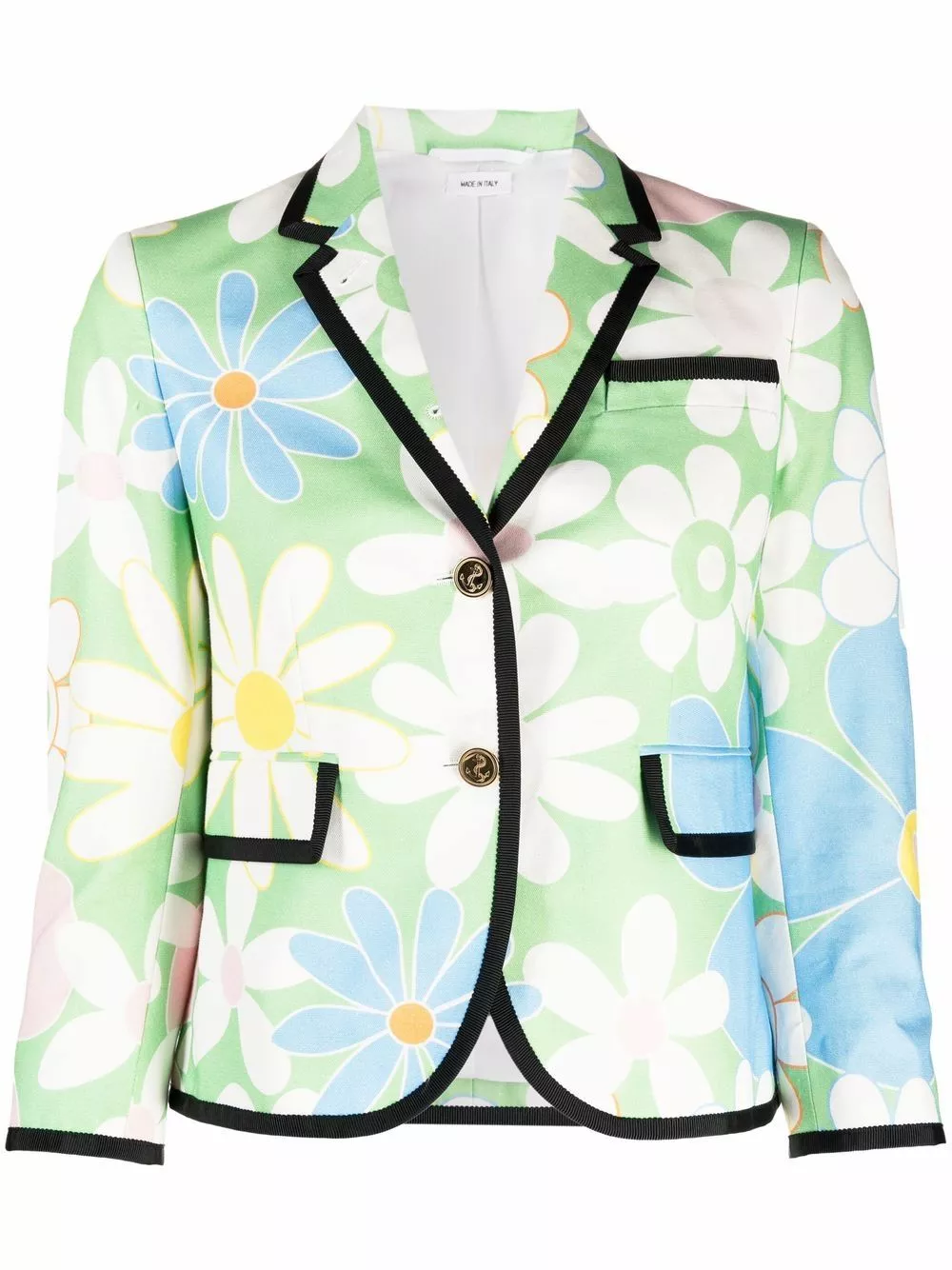 Thom Browne became widely recognized for creating classic and timeless women’s clothes. A fine example of its style is this single-breasted blazer, crafted from silk and cotton and decorated with a colourful floral print, contrasting blue trim and the recognisable grosgrain loop tab at the rear.