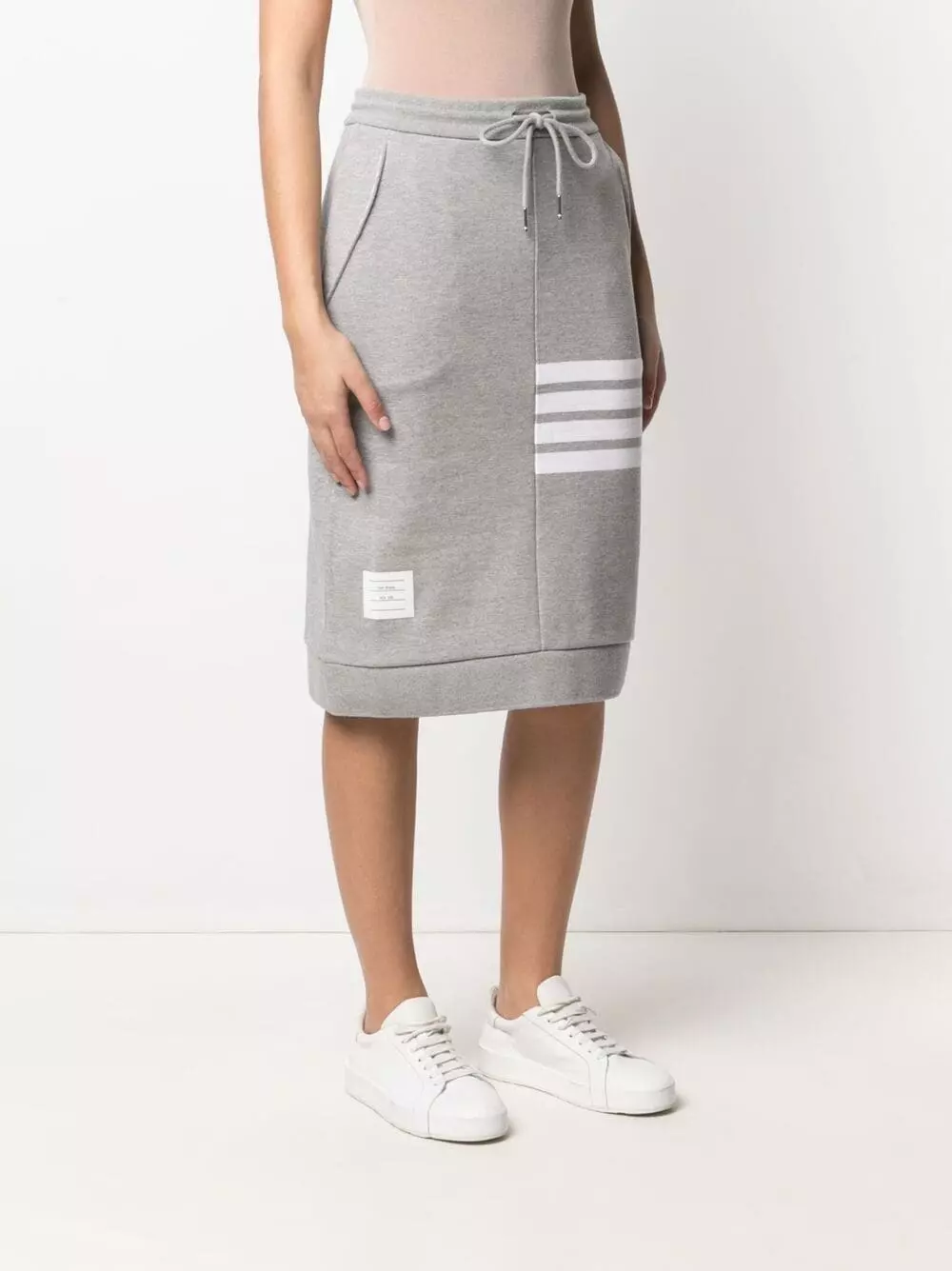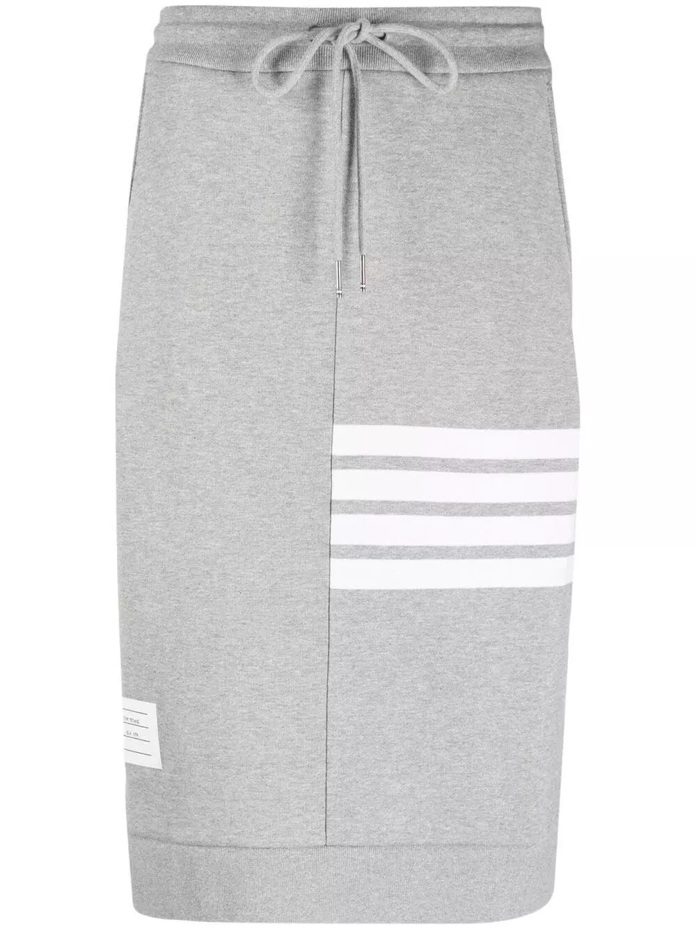 A part of Thom Browne’s AW21 collection, this midi skirt celebrates two of the label’s most famed motifs. Its soft grey hue allows the iconic four-bar stripe and RWB tab to stand out for a recognisable look.