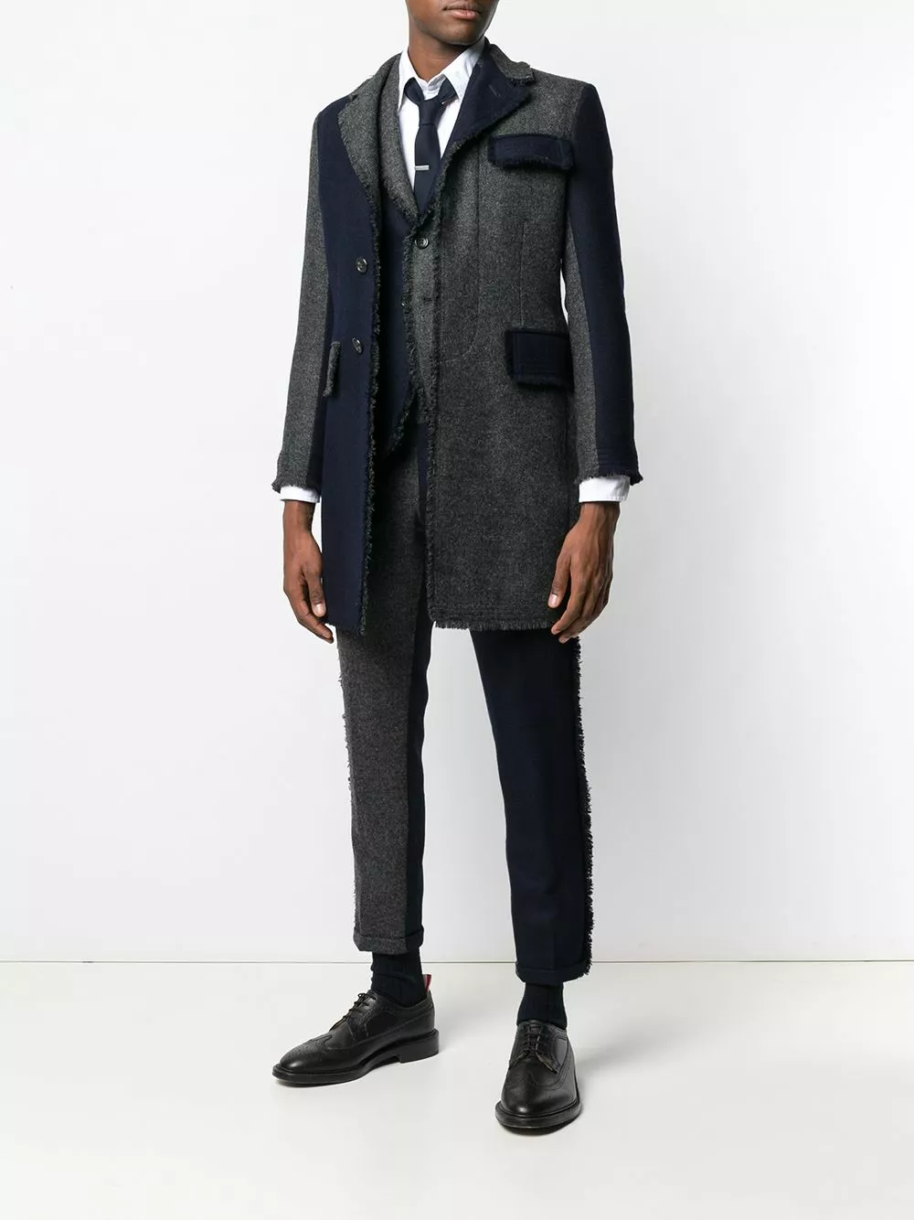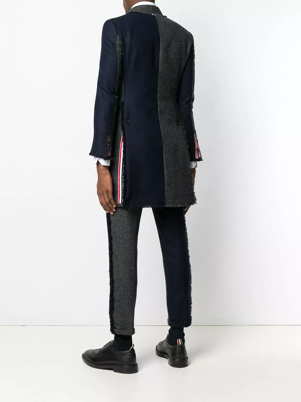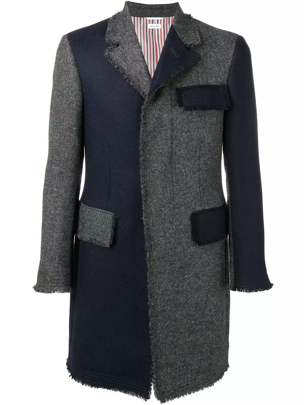 Thom Brown’s expertise in technical, tailored and luxuriously fabricated aesthetic is clearly evident in this Japanese-crafted wool coat. Cut to a slim silhouette, this grey and navy blue piece features a panelled colour block design, a slim fit, notched lapels, a concealed front button placket, front flap pockets, button cuffs, frayed edges, a double vent to the rear and a striped lining.