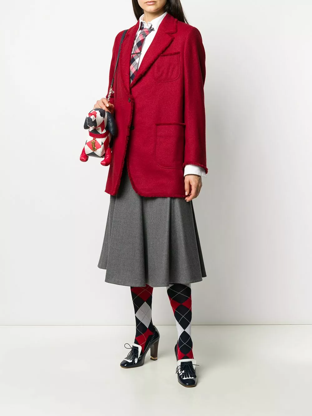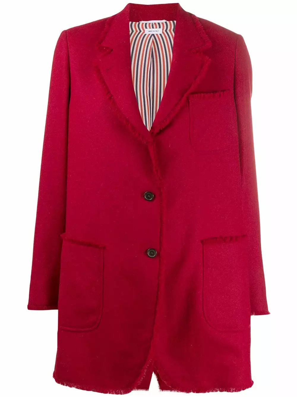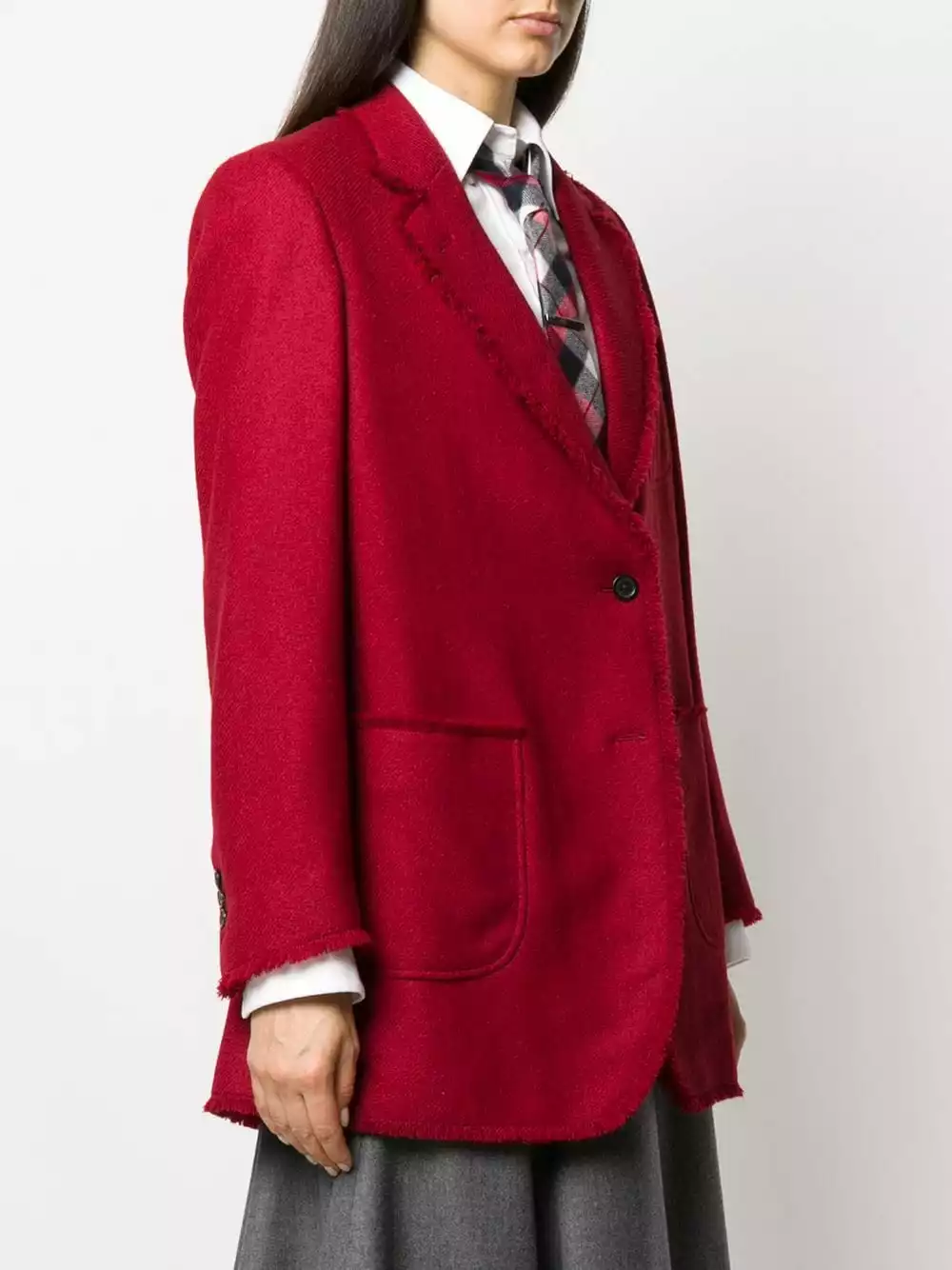 Life’s isn’t always perfect, but this Thom Browne jacket is. Made from Shetland wool, this red narrow shoulder frayed sack jacket is pretty much the perfect compliment to any outfit. Is it in your shopping bag yet? Featuring a notched collar, a front button fastening, long sleeves, a chest pocket, two front pockets, button cuffs, a back slit at hem and a tricolour grosgrain tab on the rear.