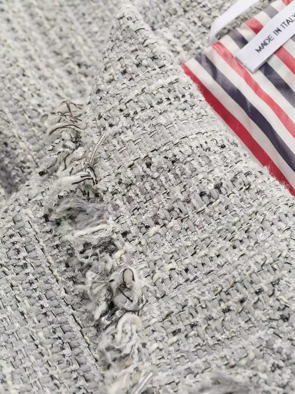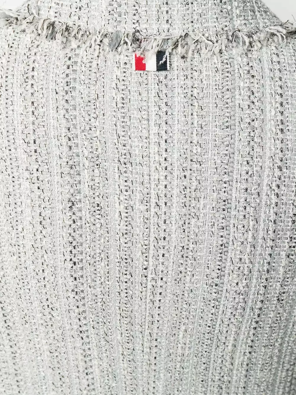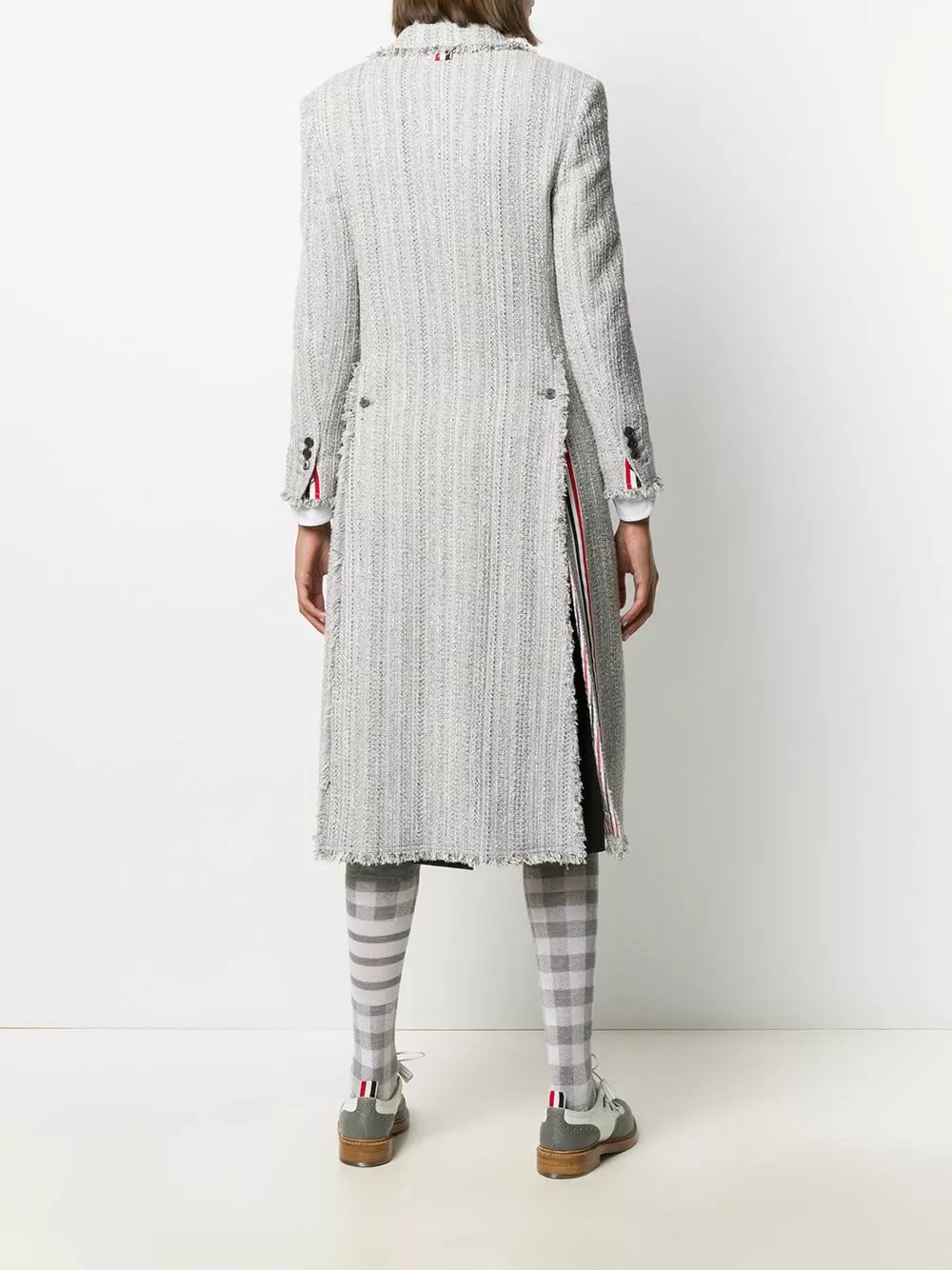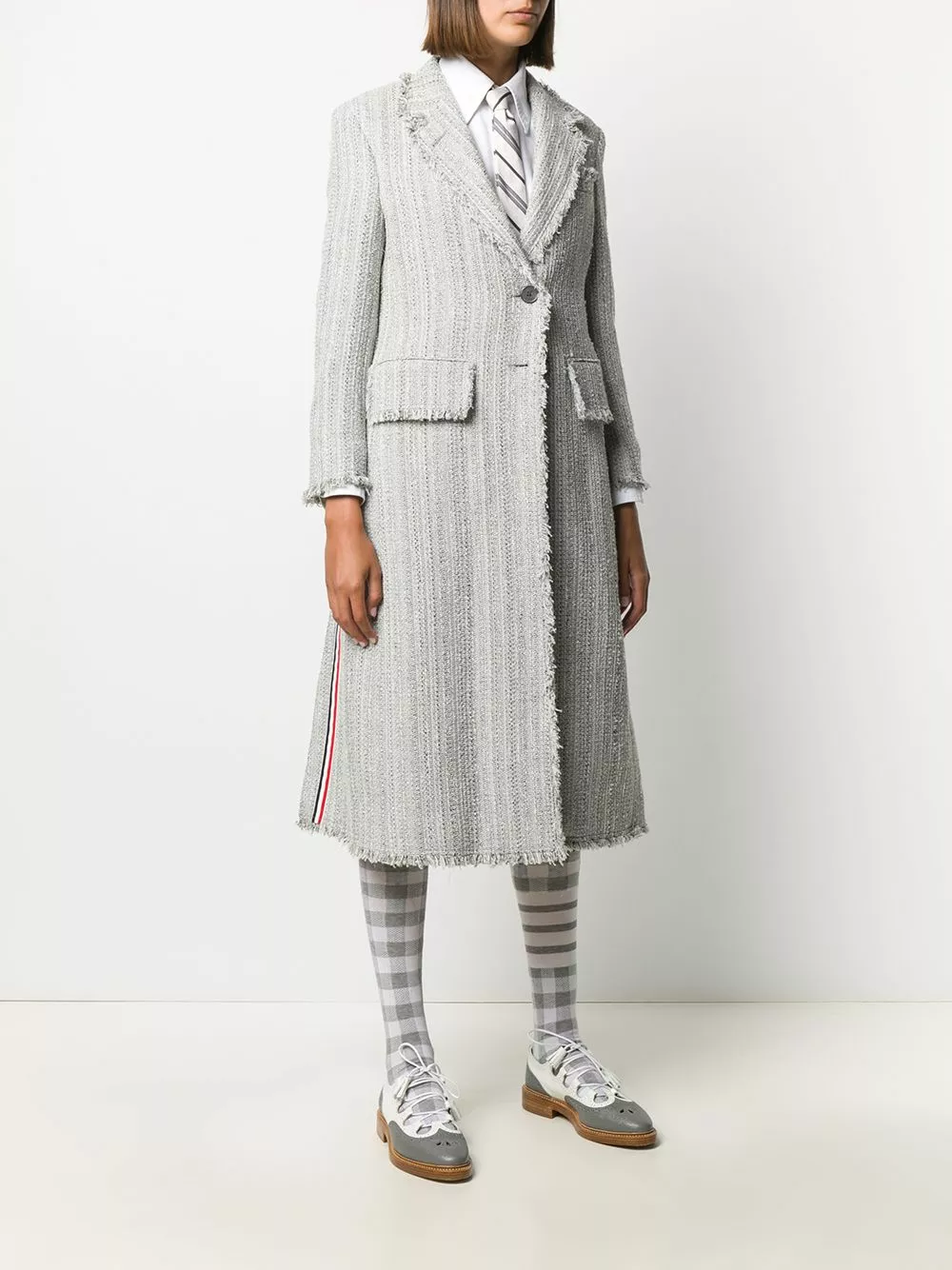 Face the cold in faultless style. This light grey tweed overcoat from Thom Browne boasts a long length, so it’s perfect for the chillier days of winter. Note the frayed edging.