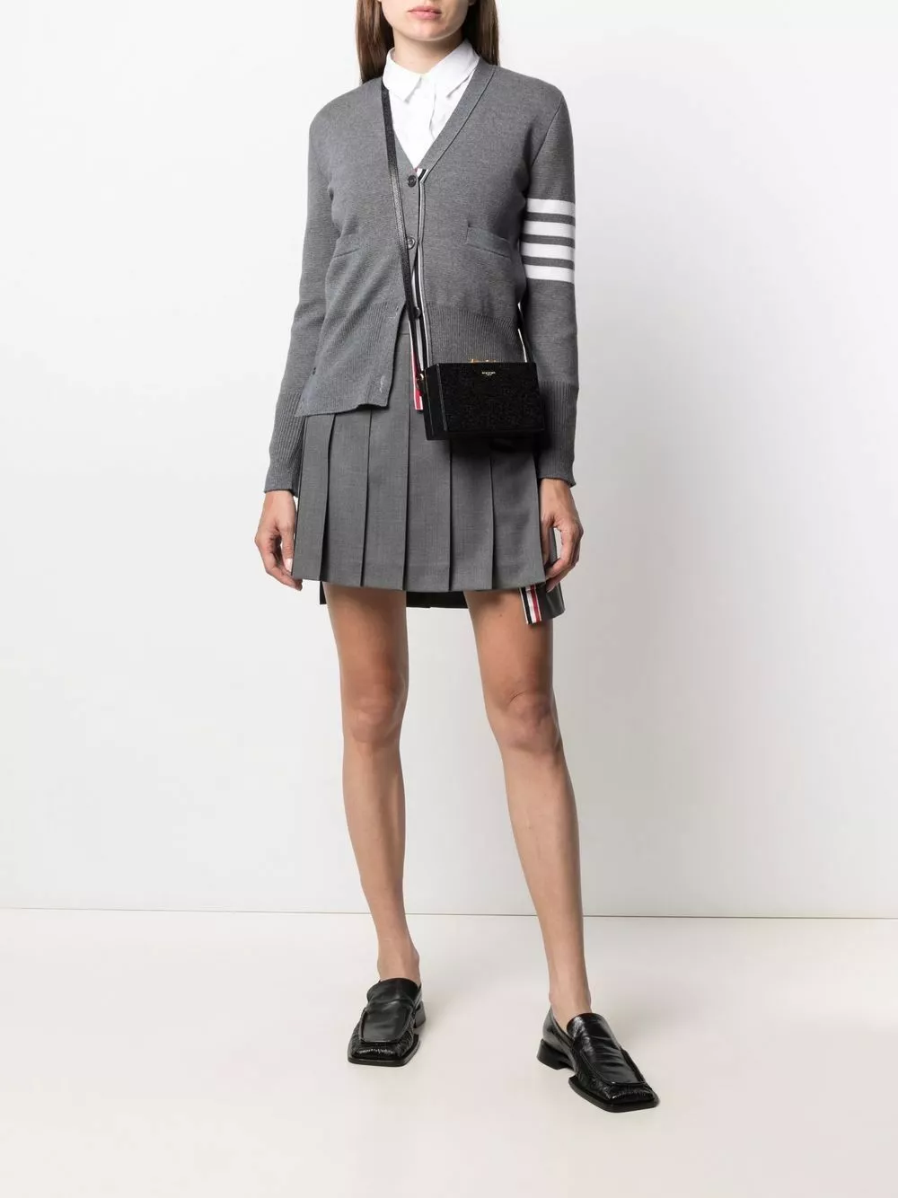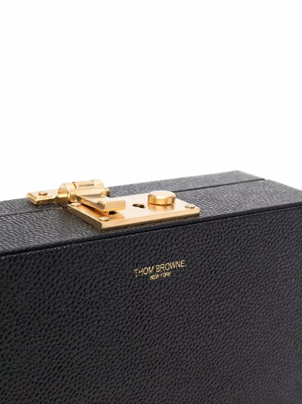 Black leather front logo crossbody bag from THOM BROWNE featuring pebbled texture, adjustable shoulder strap, gold-tone hardware, push-lock fastening, internal patch pocket and internal logo patch.