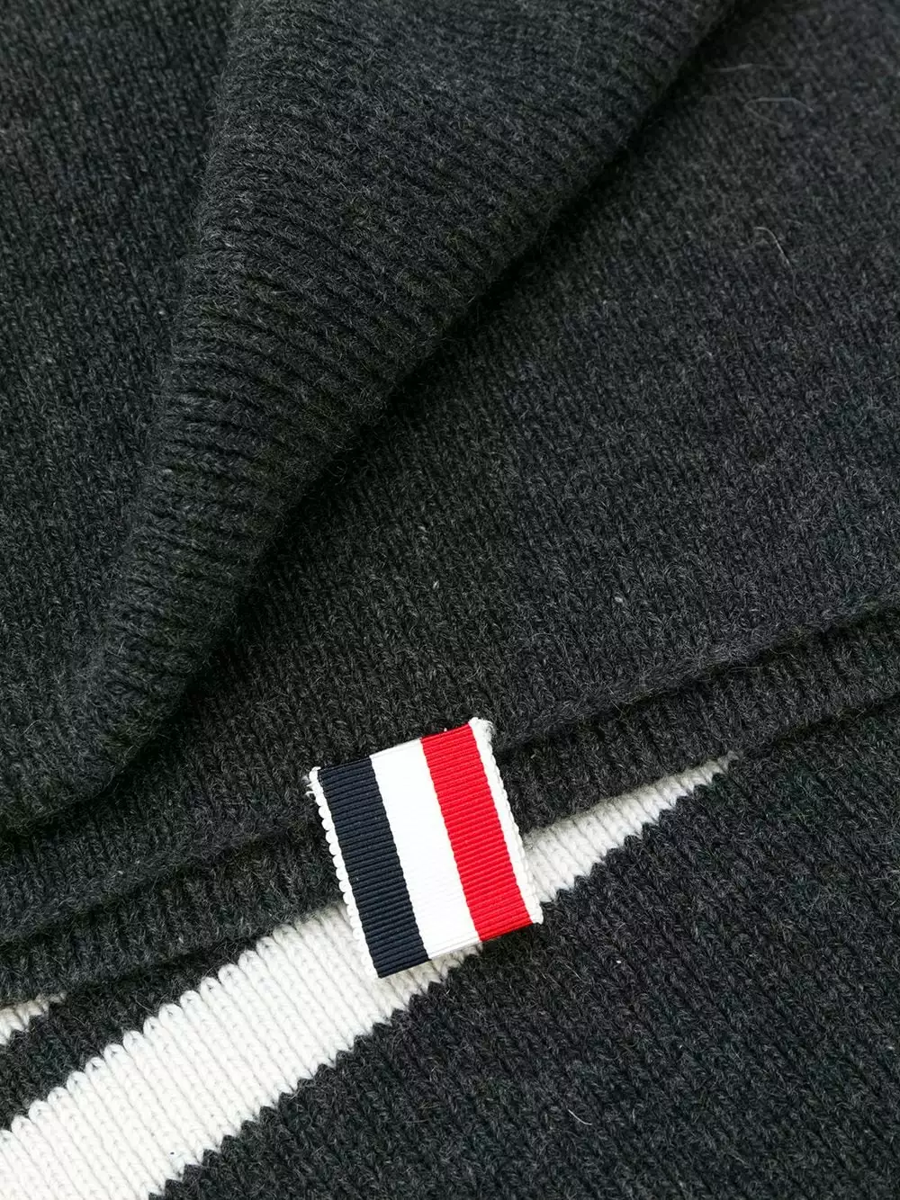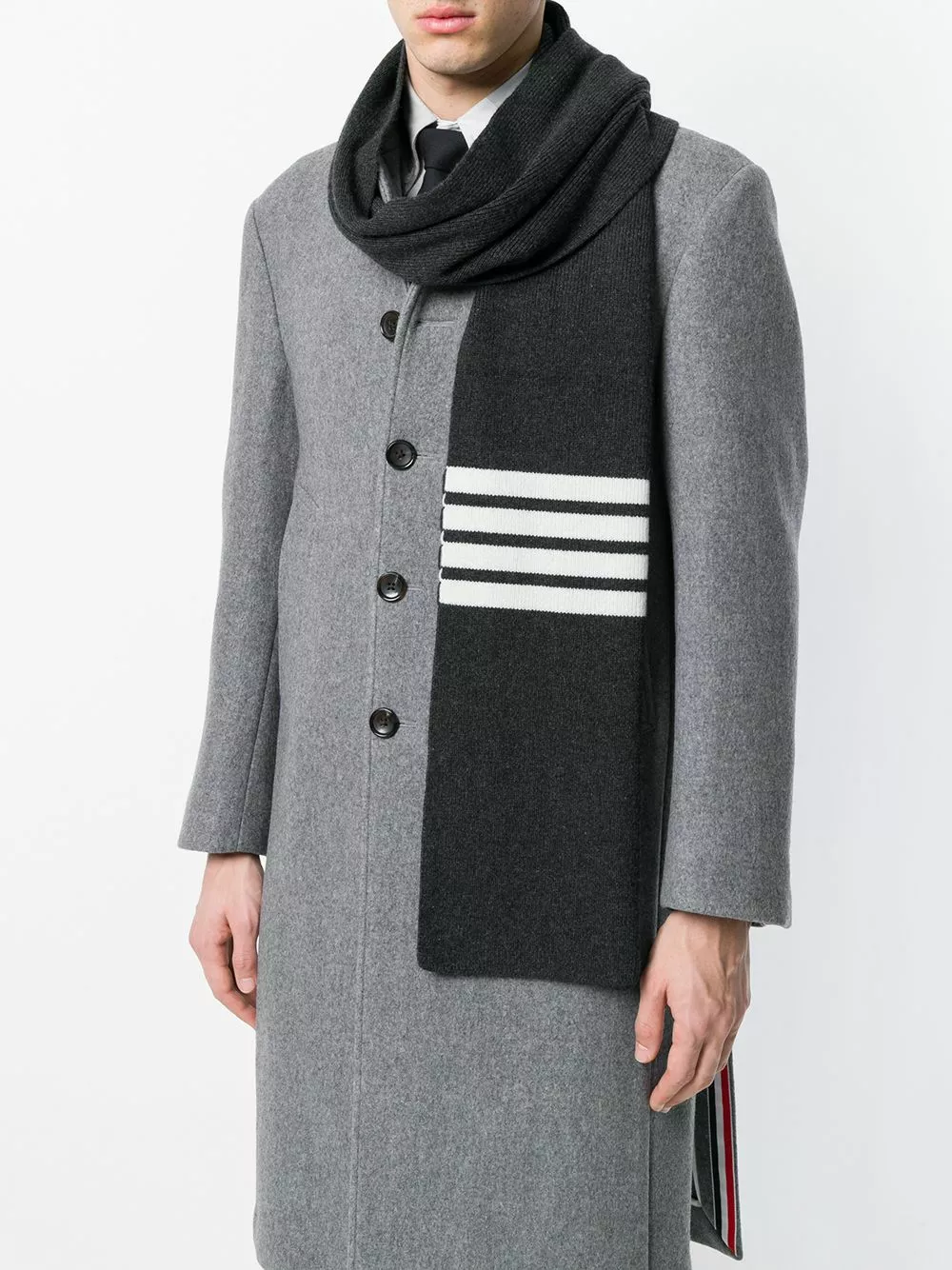 Dark grey Full Needle Rib Scarf With White 4-Bar Stripe In Cashmere from Thom Browne.