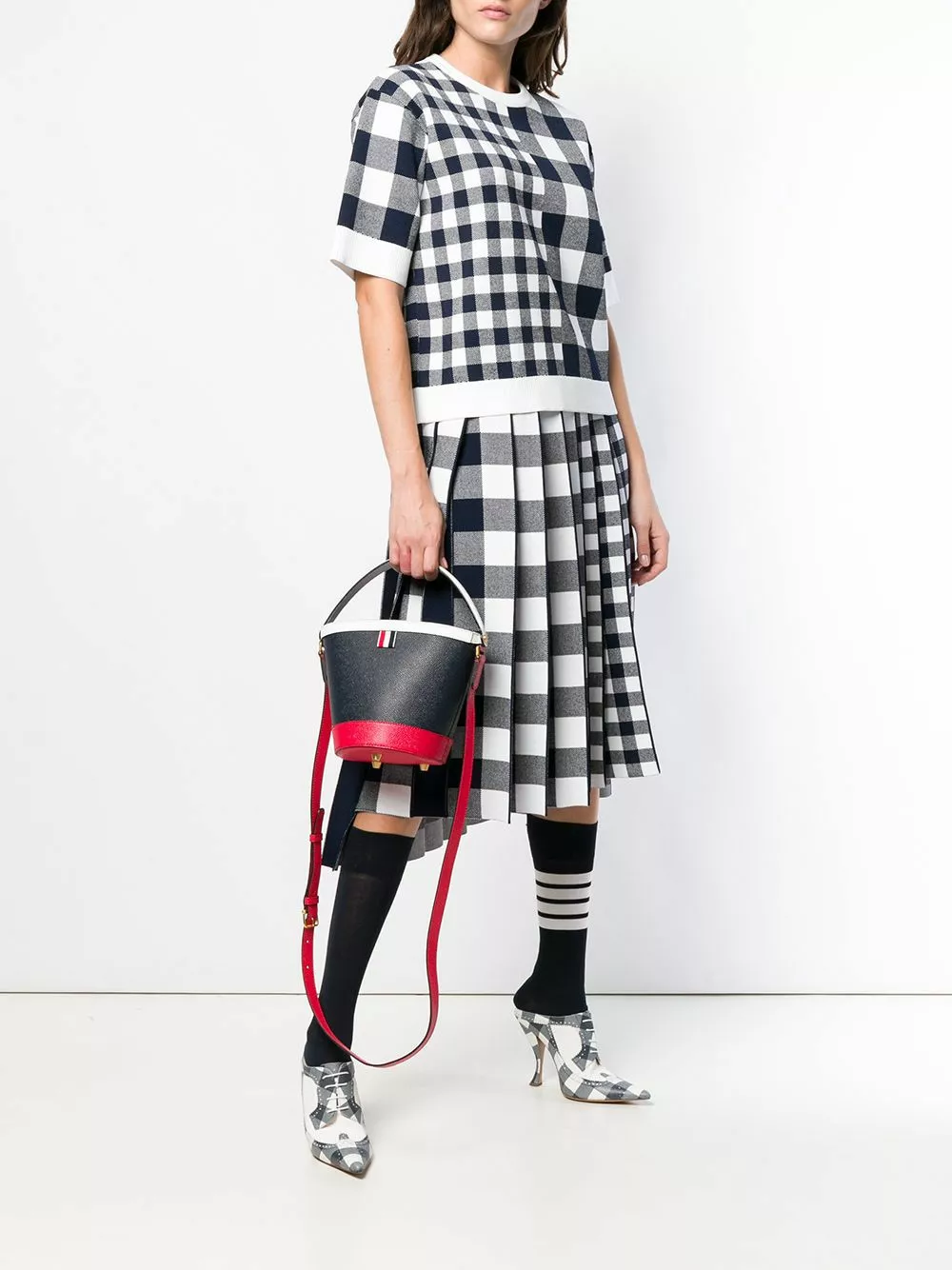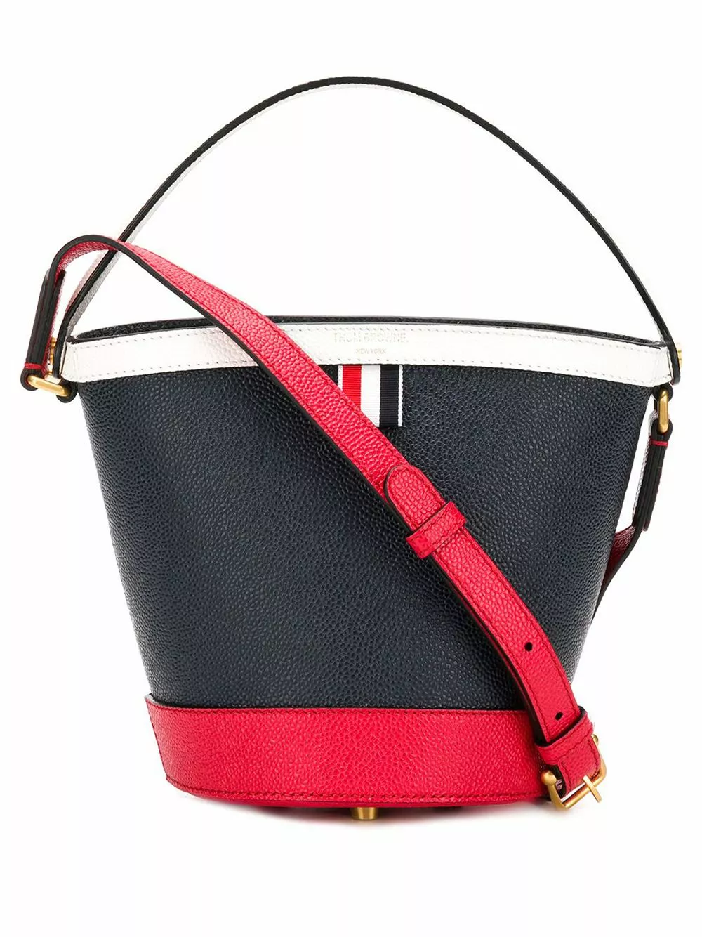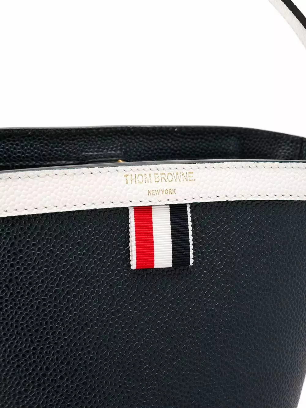 Since its launch in 2003, Thom Browne’s namesake label has gained notoriety for its clean designs and use of luxury materials. This blue, red and white leather RWB Pebble Grain Sand Bucket Bag from Thom Browne features a top handle, an adjustable shoulder strap, gold-tone hardware, purse feet, an open top design, an internal logo plaque, a clip fastening, an internal zipped pocket, a tri-stripe grosgrain logo tab and a striped lining.