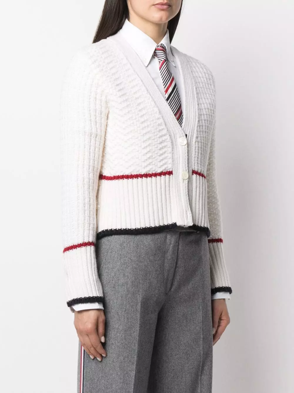 Tailoring with a playful twist. Crafted from fine merino wool, this Thom Browne cardigan features a mix of knitting patterns that will add a touch of irreverence to a refined design. Defy the status quo.