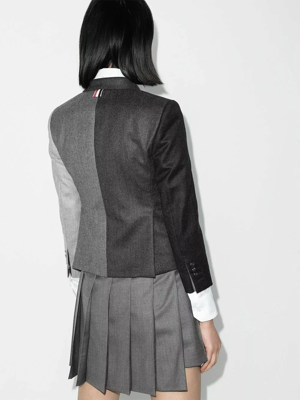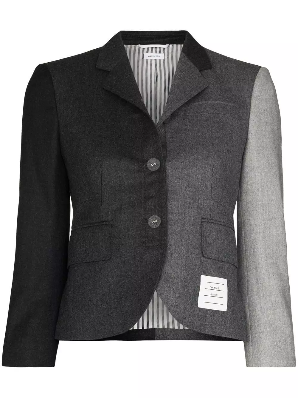 Tonal grey Fun-Mix super 120s wool flannel jacket from THOM BROWNE featuring a notched collar, a front button fastening, a panelled colour block design, a chest pocket, front flap pockets, button cuffs, a straight hem, a logo patch detail on the front and a tricolour grosgrain tab on the rear.