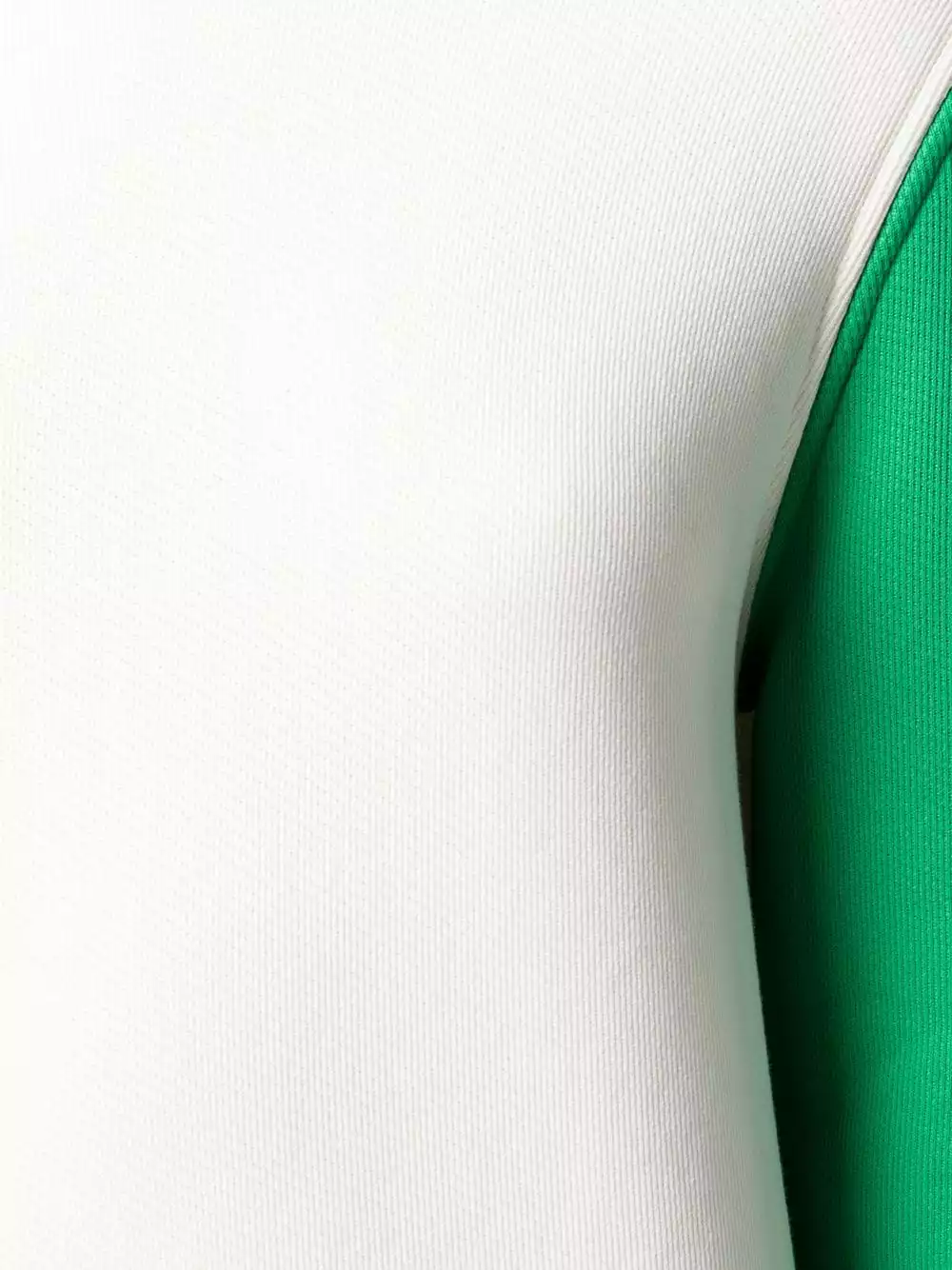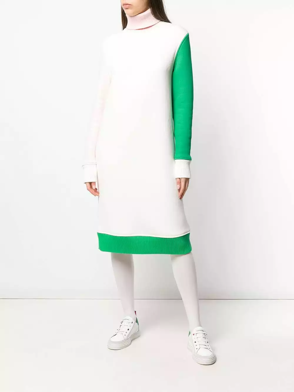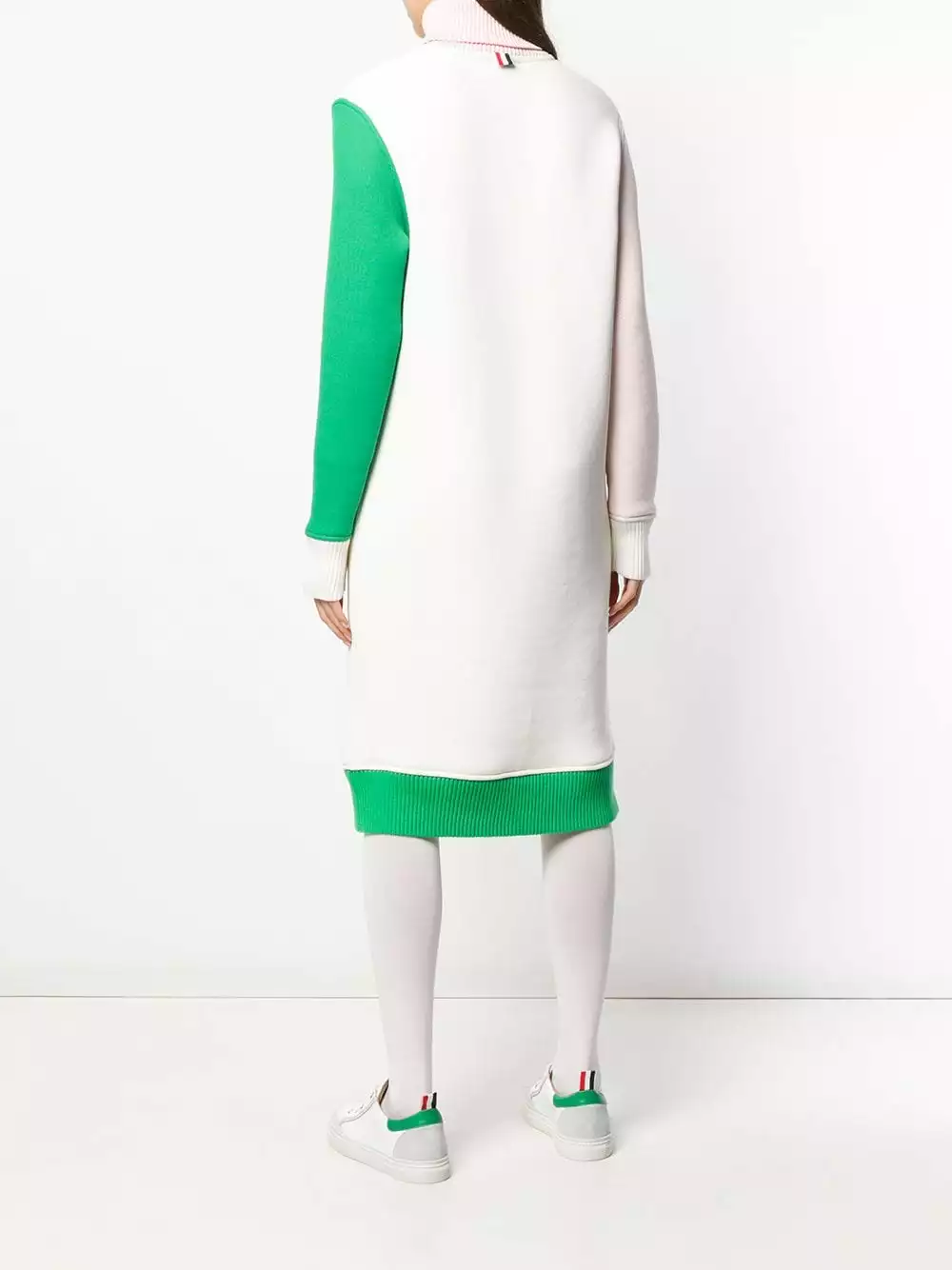 Light pink and green cotton blend Fun Mix turtleneck dress from Thom Browne featuring a turtle neck, long sleeves, a ribbed hem and cuffs, a color blocked design and a mid-length.