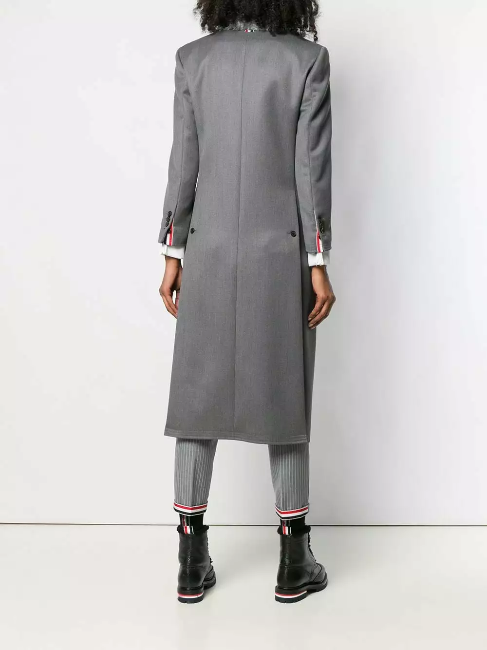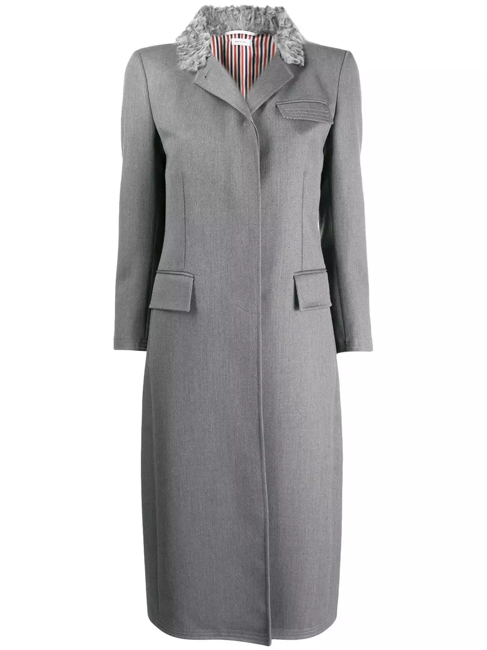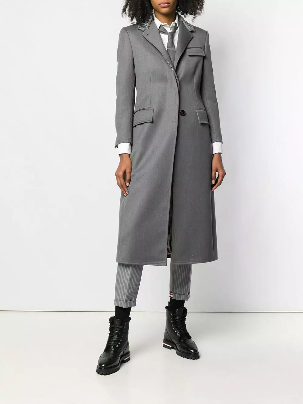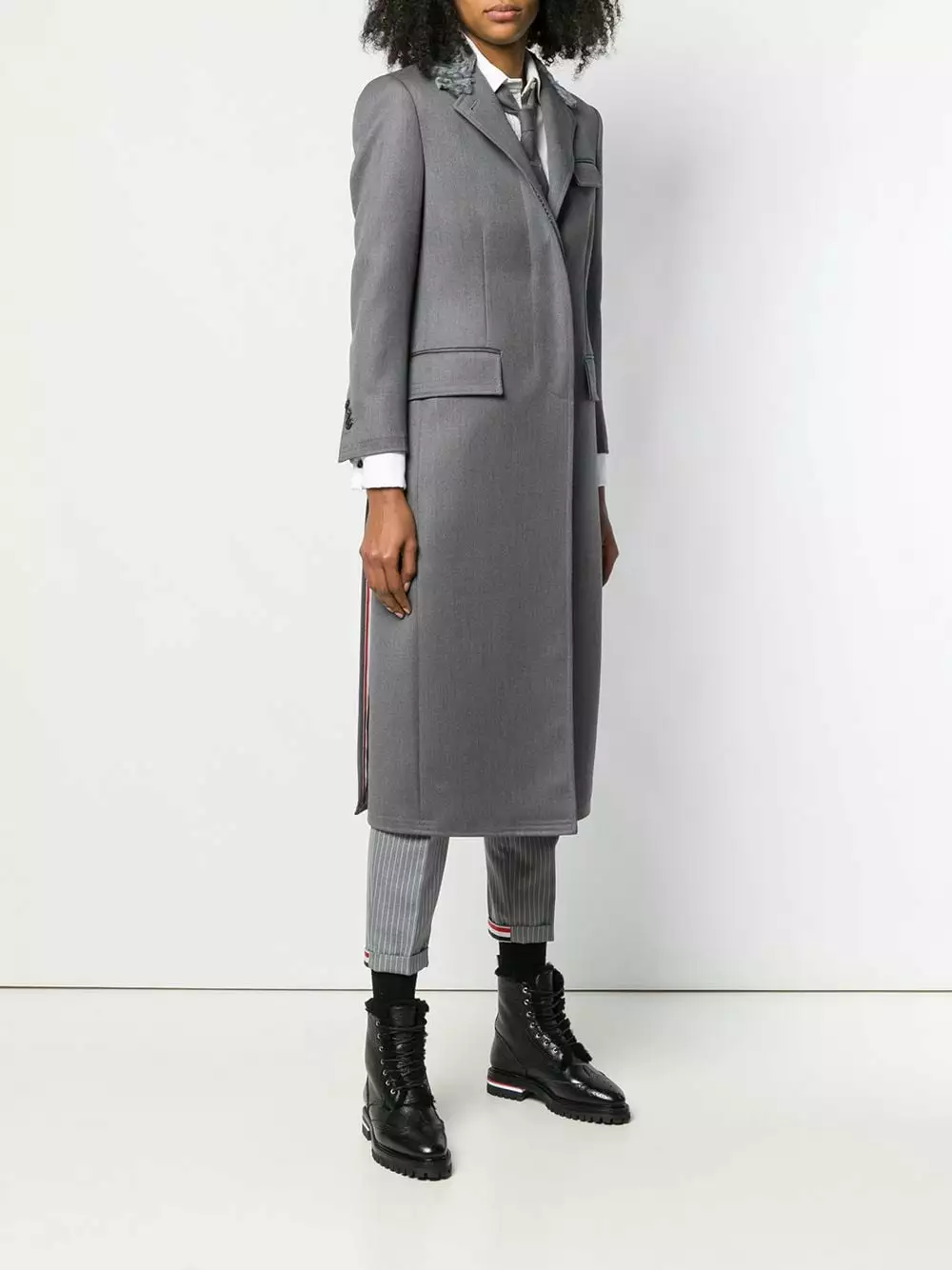 Thom Browne’s newest edit captures the immaculate craftsmanship and minimalist designs that have come to define the American label. Case in point: this grey wool Fur Collar Elongated Chesterfield from Thom Browne’s AW19 Collection. Featuring a fur collar, a concealed front fastening, a flap chest pocket, front flap pockets, long sleeves, button cuffs, a double vent to the rear and a mid-length.
