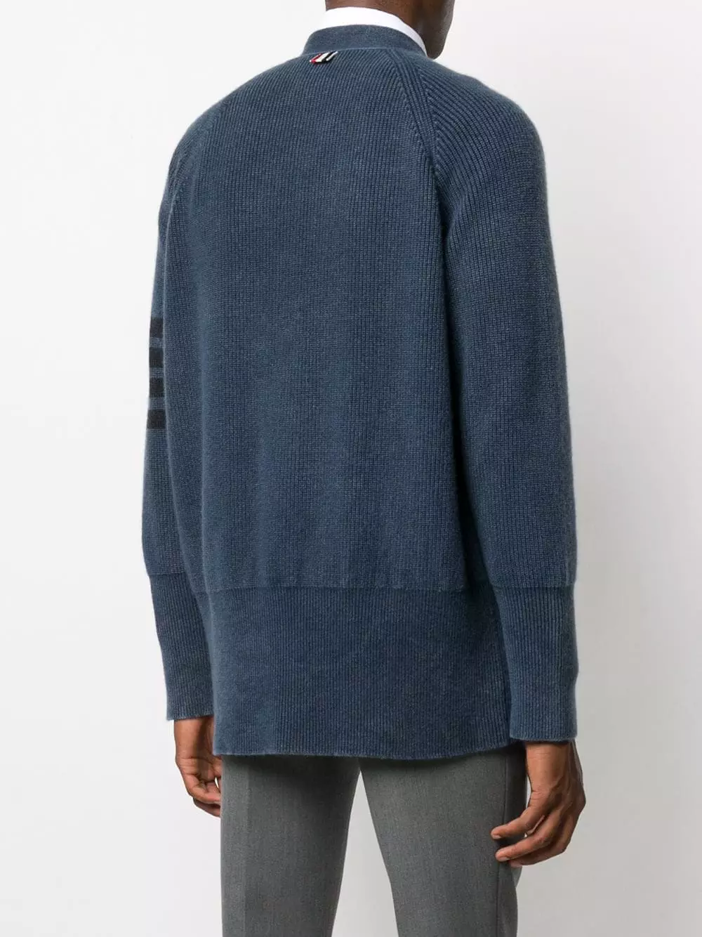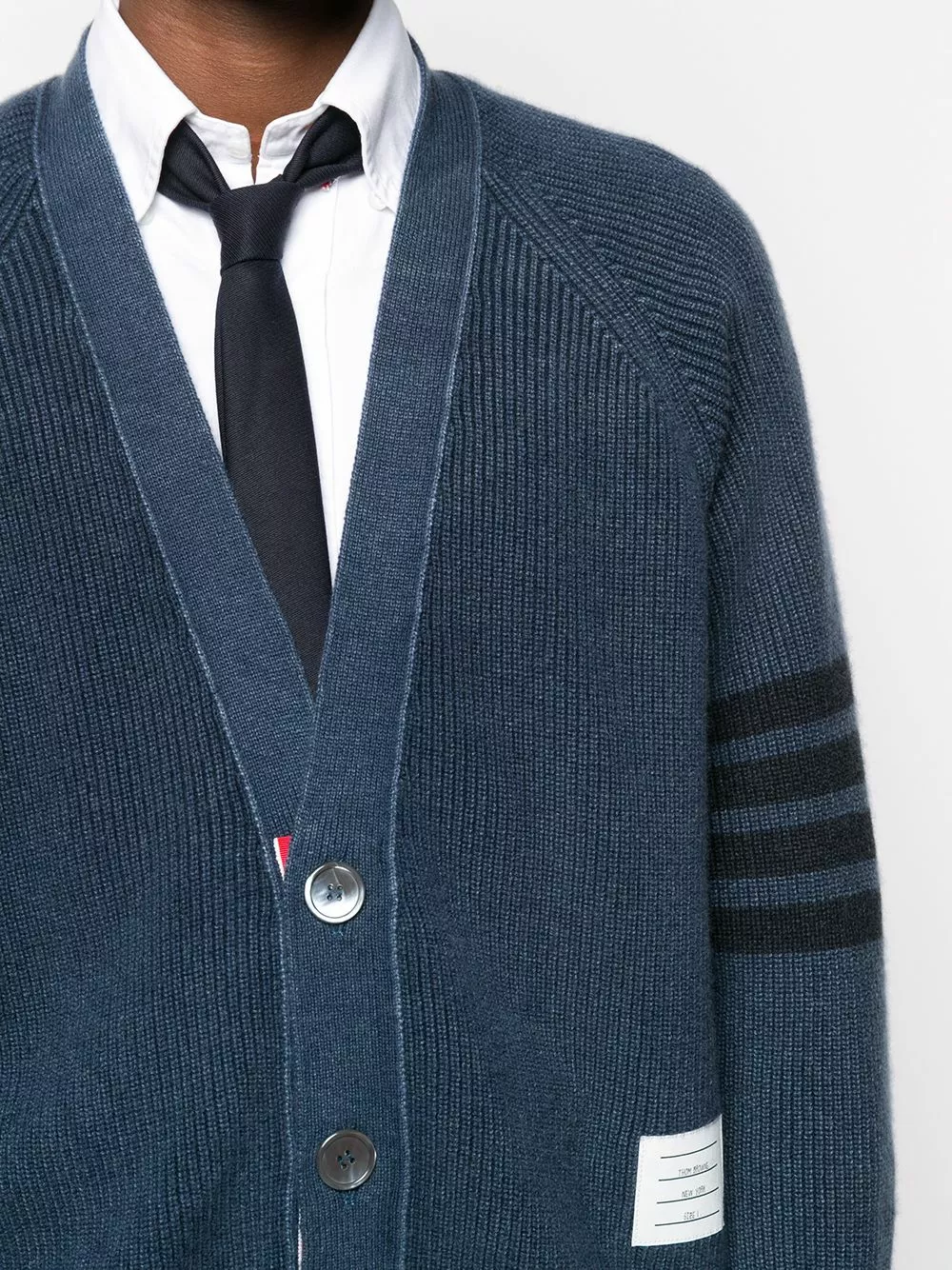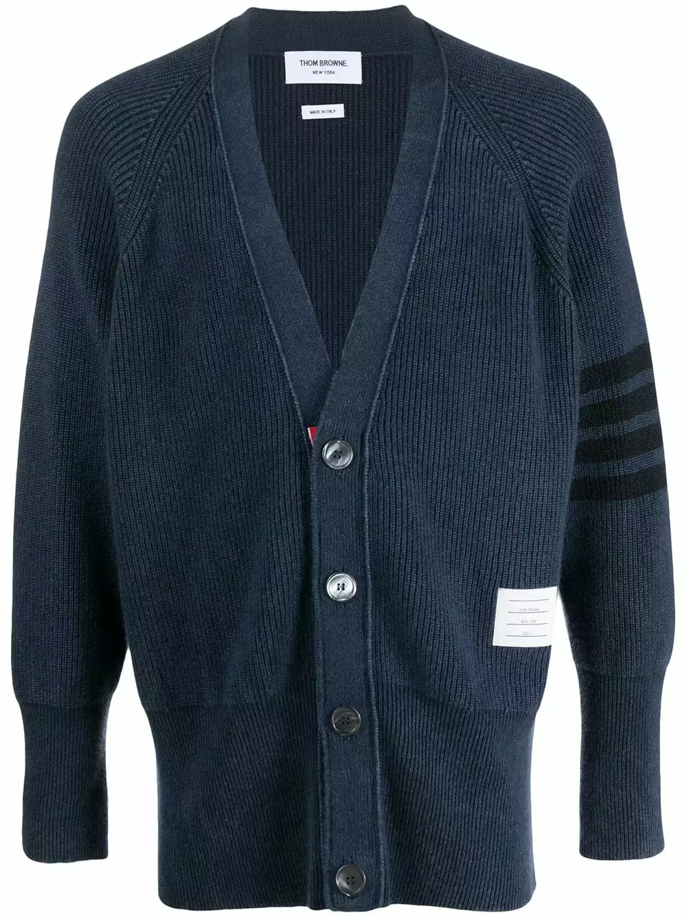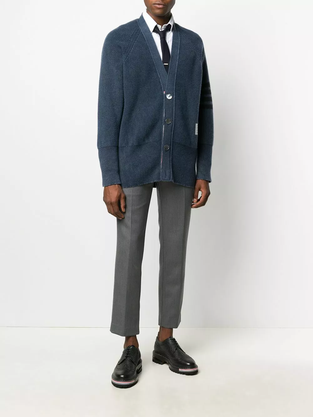Garment-dyed, ribbed, crafted from cashmere, four bar stripe logo… We didn’t know where to start with this detail-packed Thom Browne cardigan, so we started listing what we saw. And wow, we sure like what we see. (You will feel the same way.)