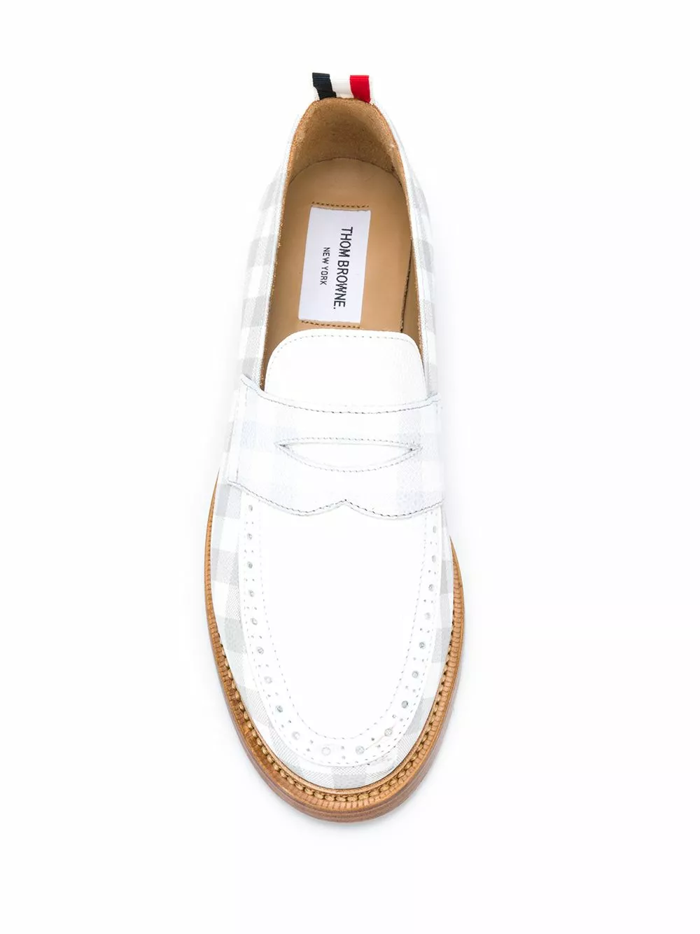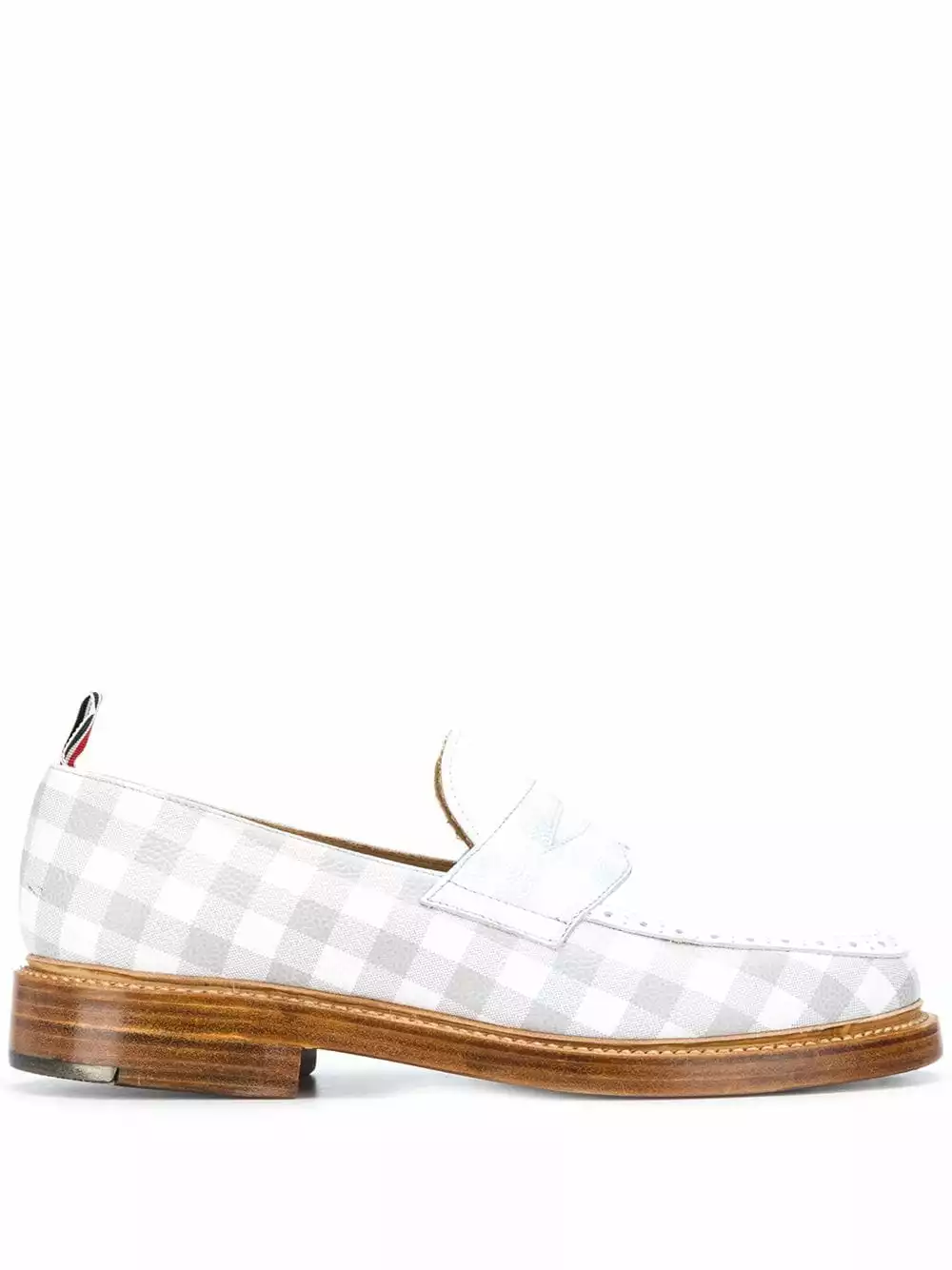 Add some picnic chic to your wardrobe, with these white leather gingham print loafers from Thom Browne. The fancy footwear features a gingham check pattern, slip-on style, perforated design and logo pull-tab at the heel. Oh happy days!