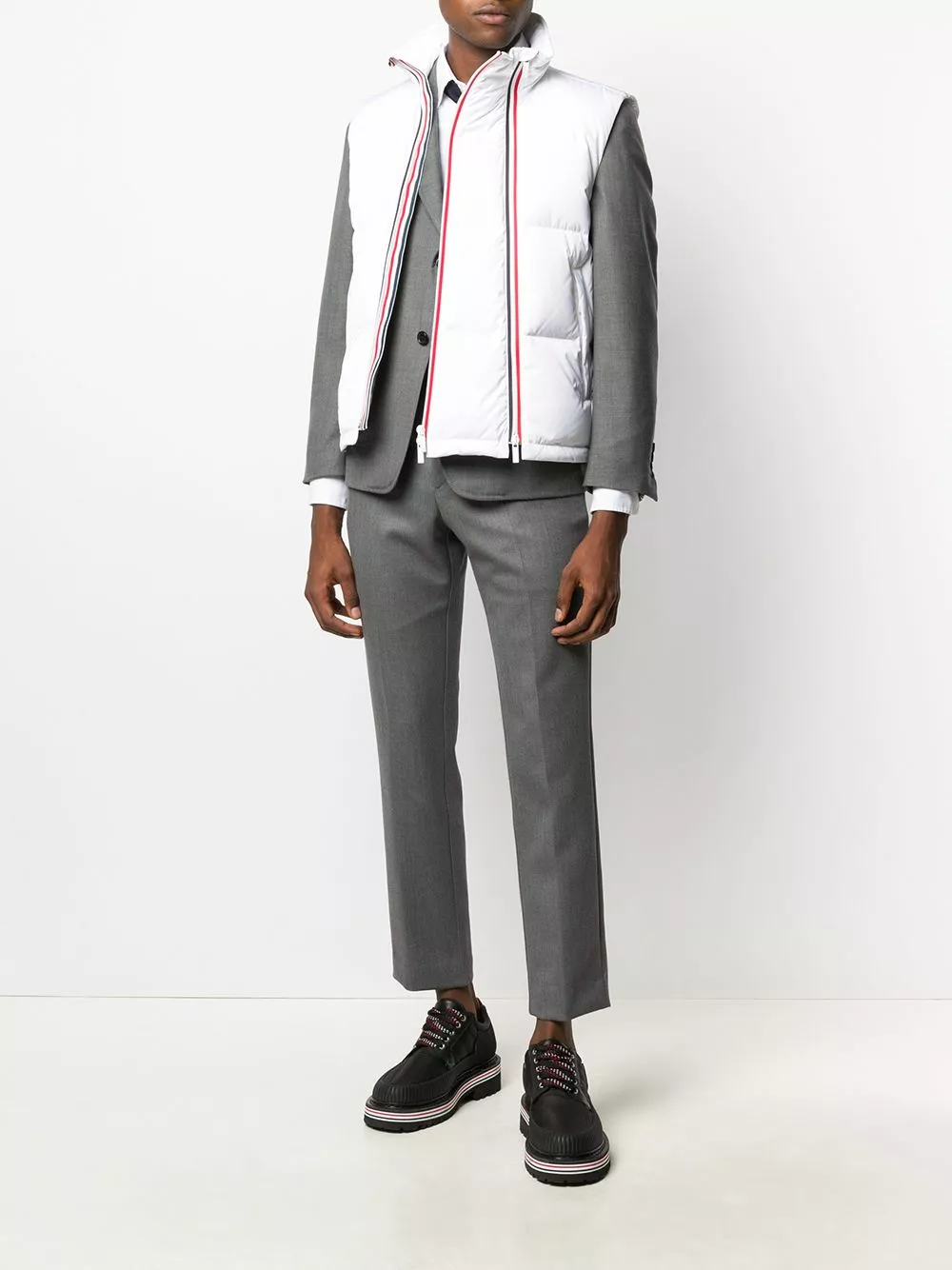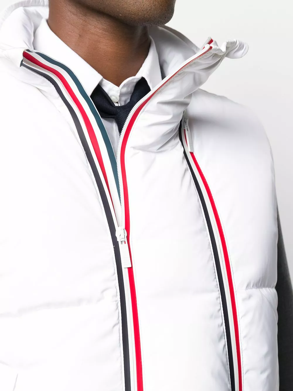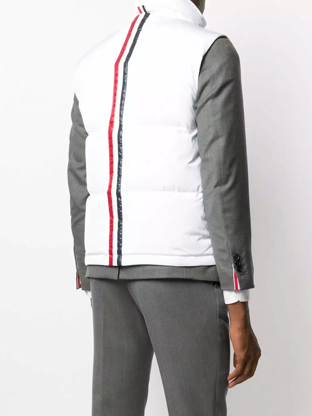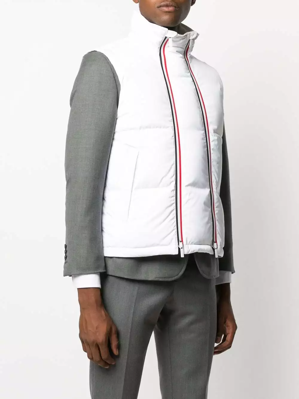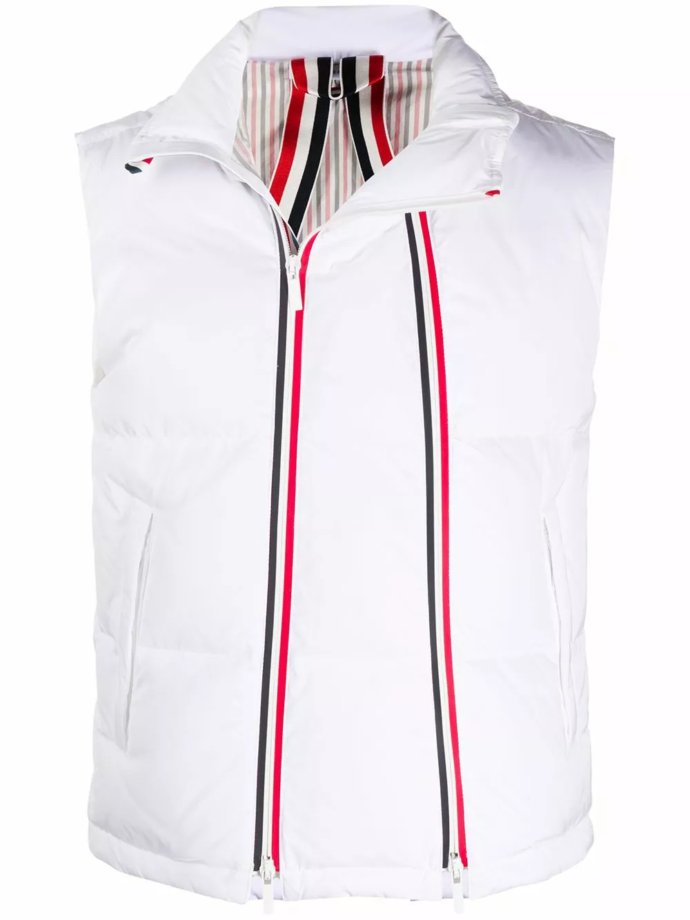 Keep warm in the coolest way possible, with this padded gilet from Thom Browne. The goose-down padding keeps you insulated, whilst the two front two-way zip fastenings with tricolor detail add a practical yet fashion-forward element.