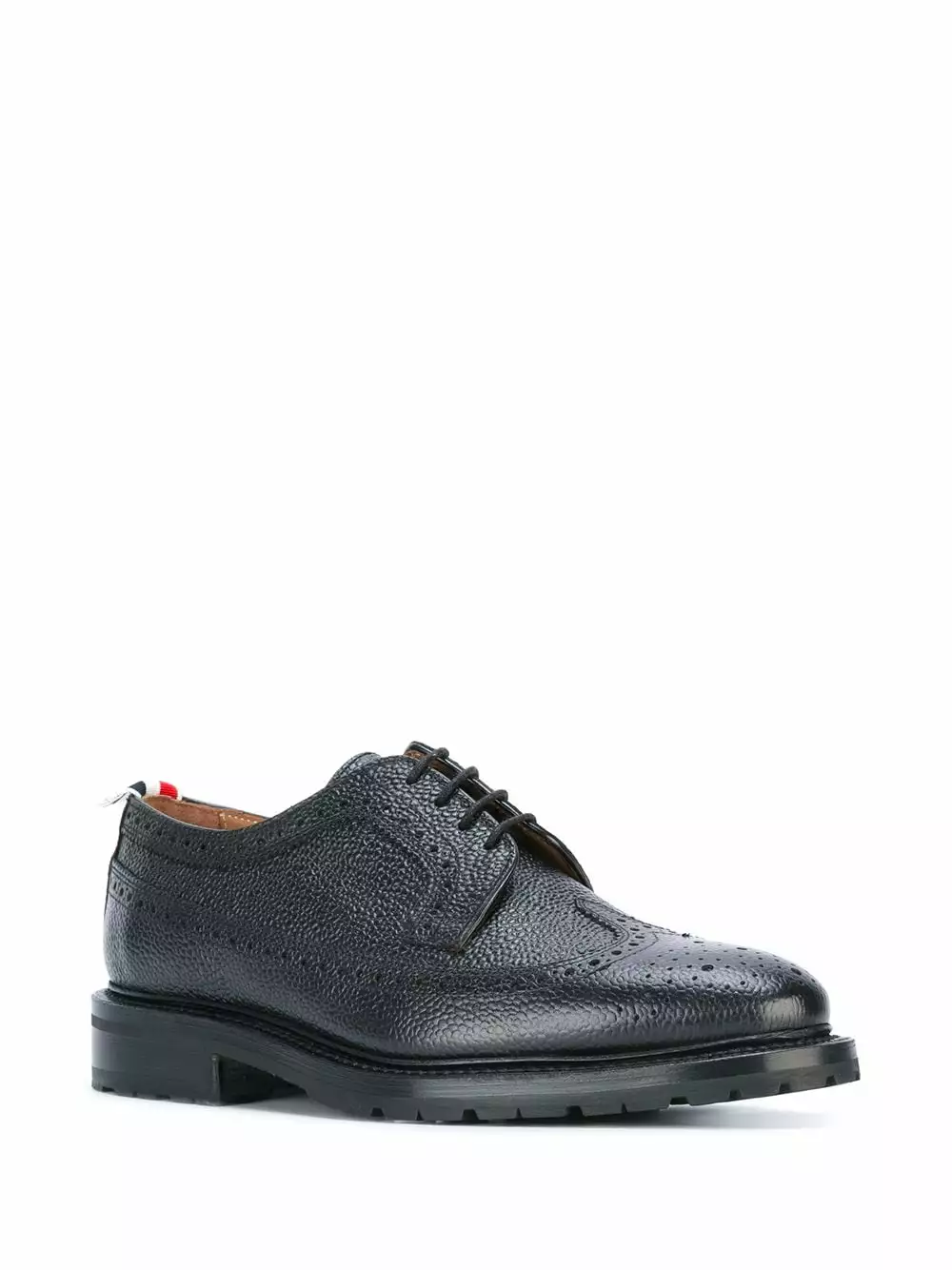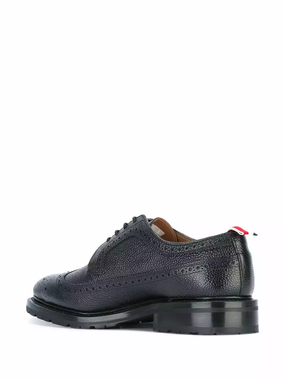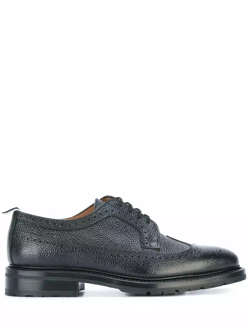 Black leather brogues from Thom Browne featuring a pointed toe, punch hole detailing, a lace fastening, a chunky low block heel, a rubber sole, tricolour pull tab and grain leather effect.